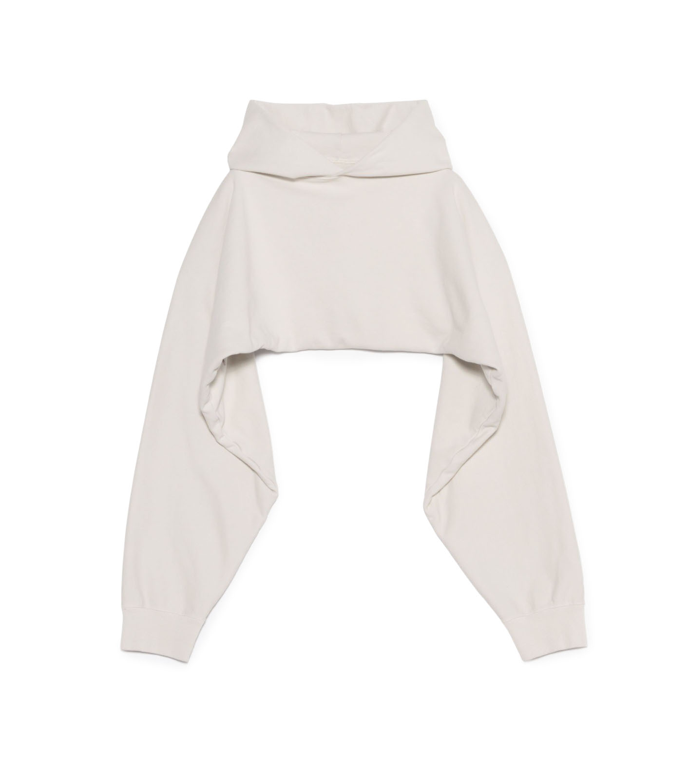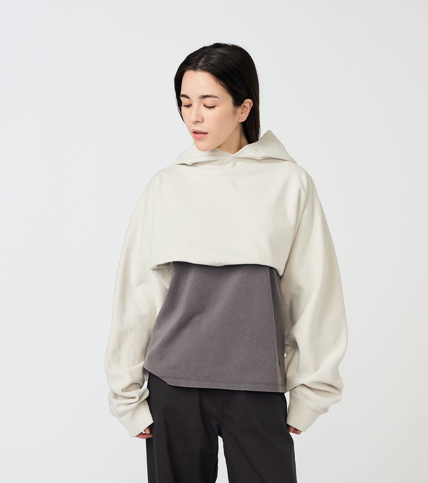 후드 스웨트 셔츠를 잘라낸듯한 독특한 실루엣으로 머플러처럼 두르거나 후드 기능을 겸비해 사용할 수 있습니다. 티셔츠나 얇은 상의 위에 레이어드해 입을 수 있어 다용도로 사용할 수 있는 아이템입니다.