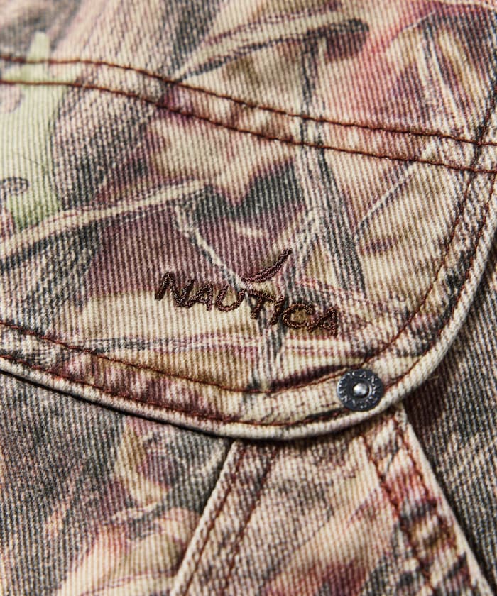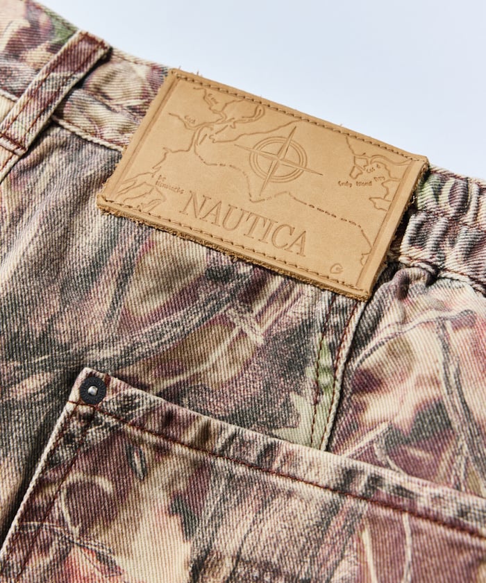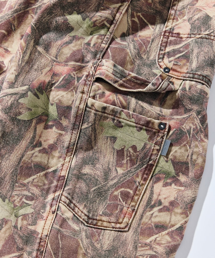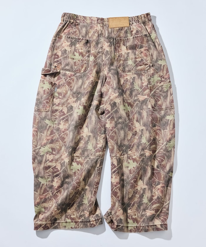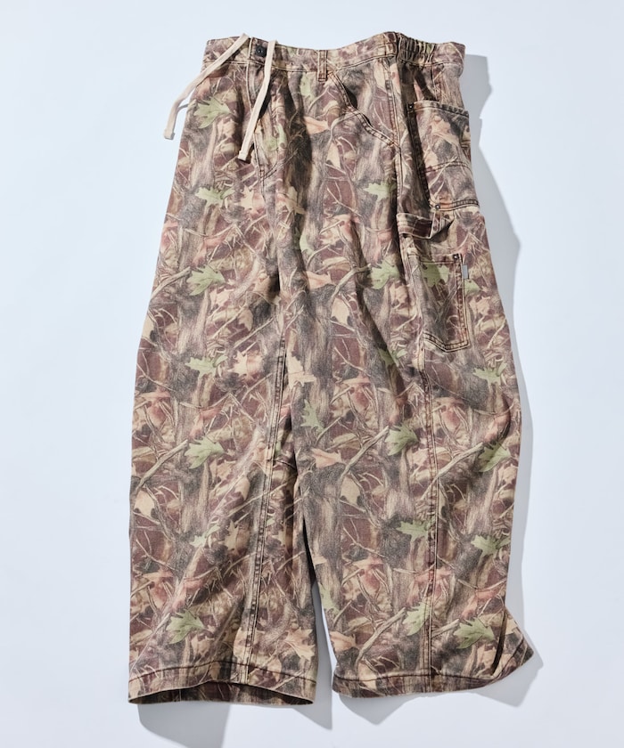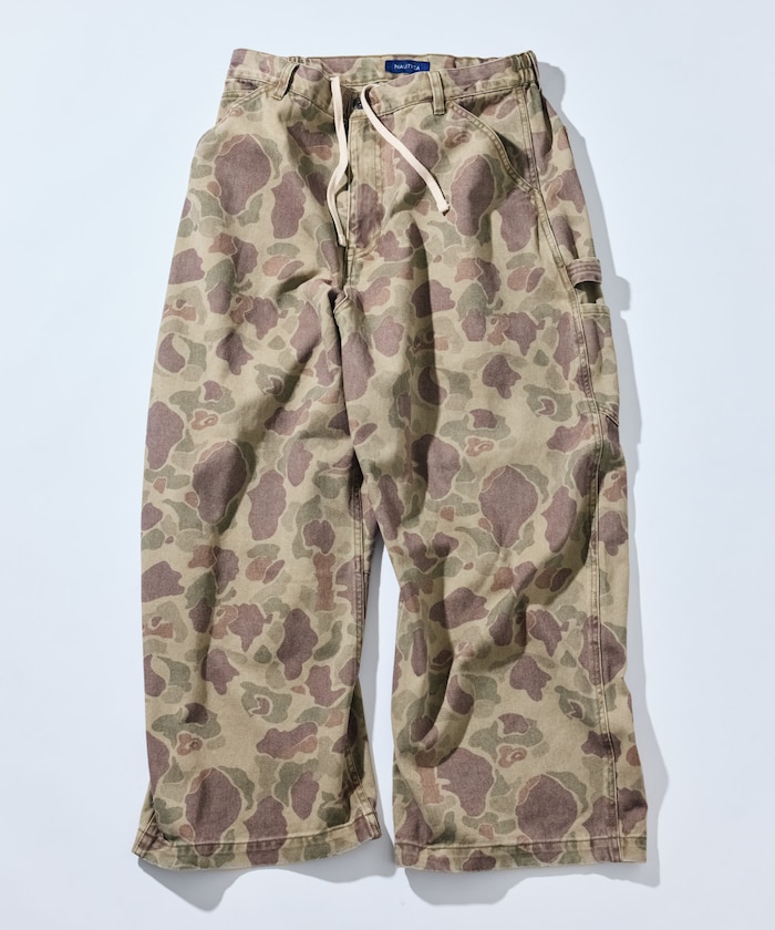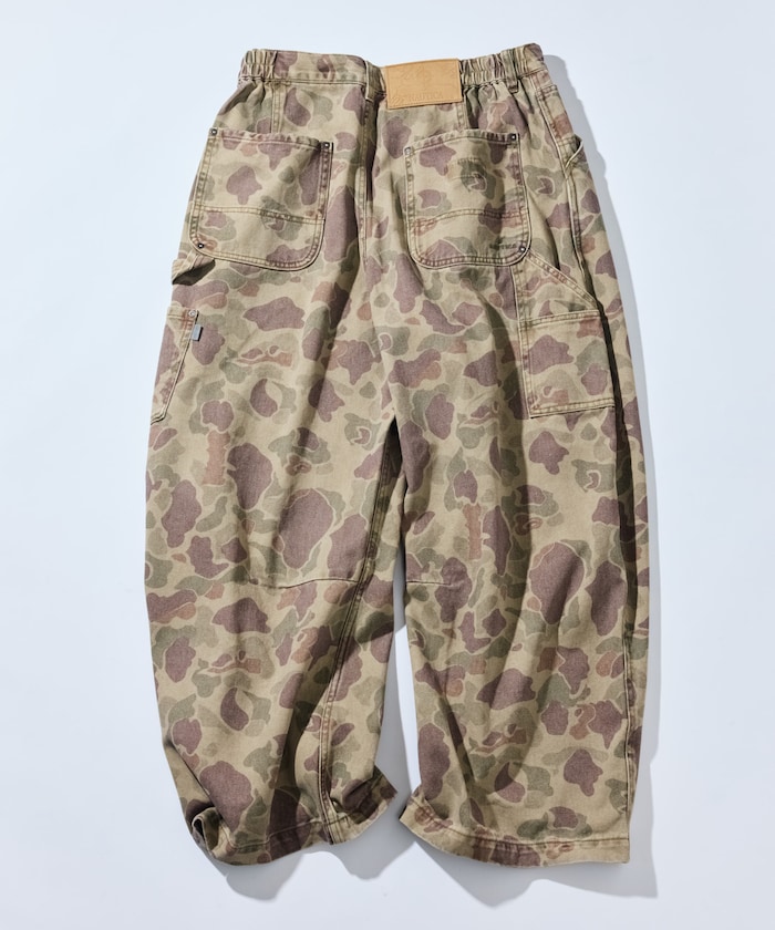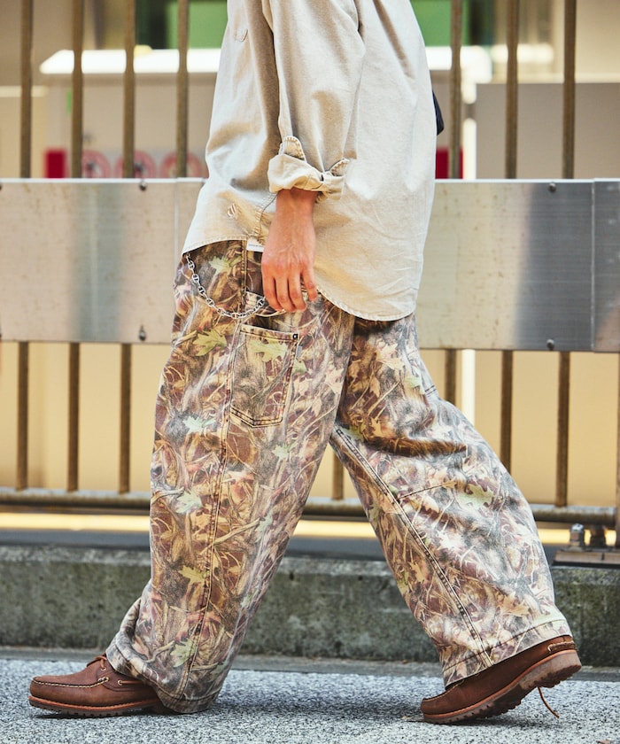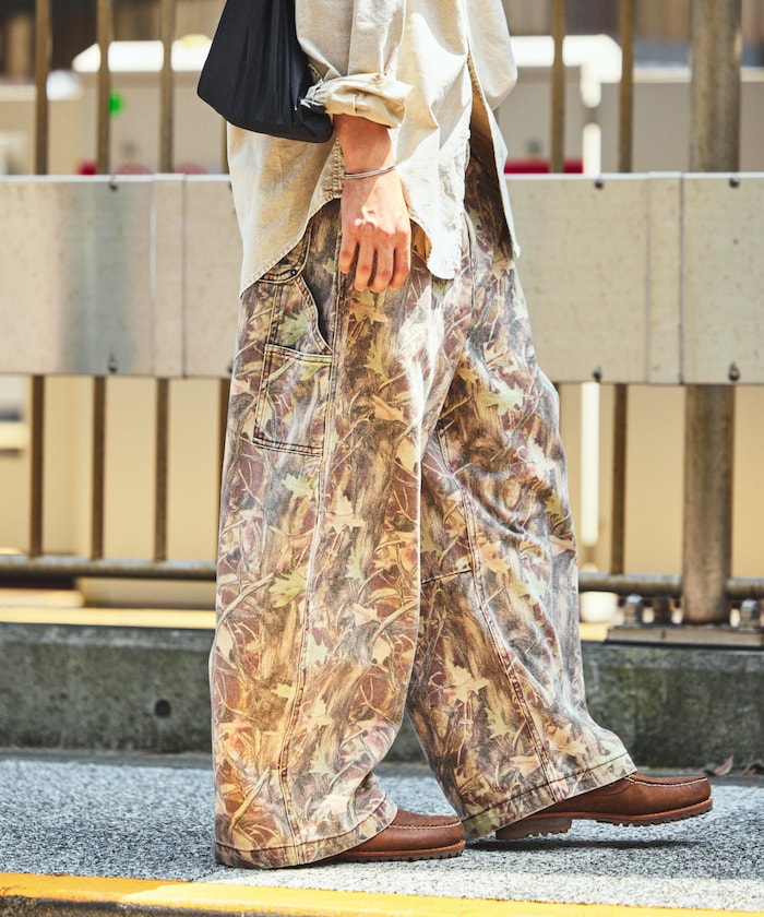 트렌디한 와이드 커브 실루엣을 더해 빈티지 감성이 물씬 풍기는 존재감 강한 카모 무늬의 페인터 팬츠.