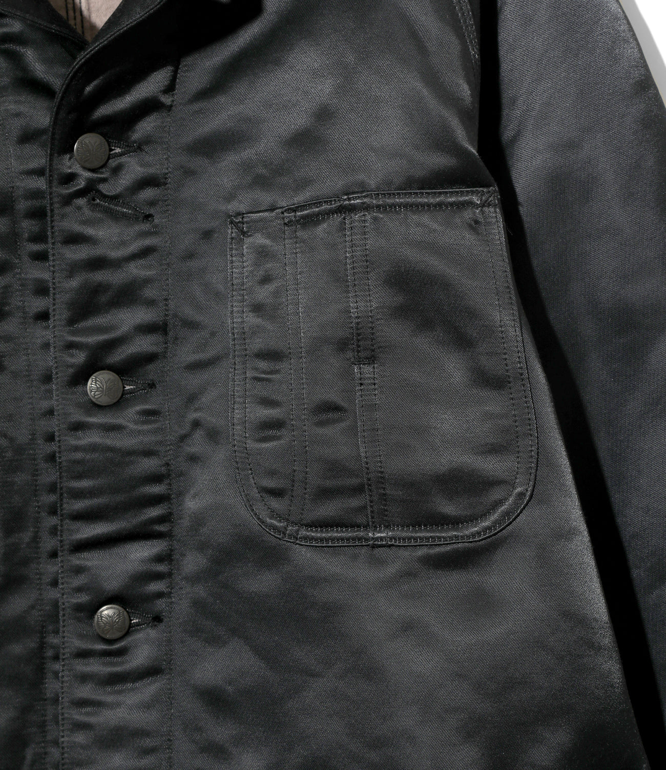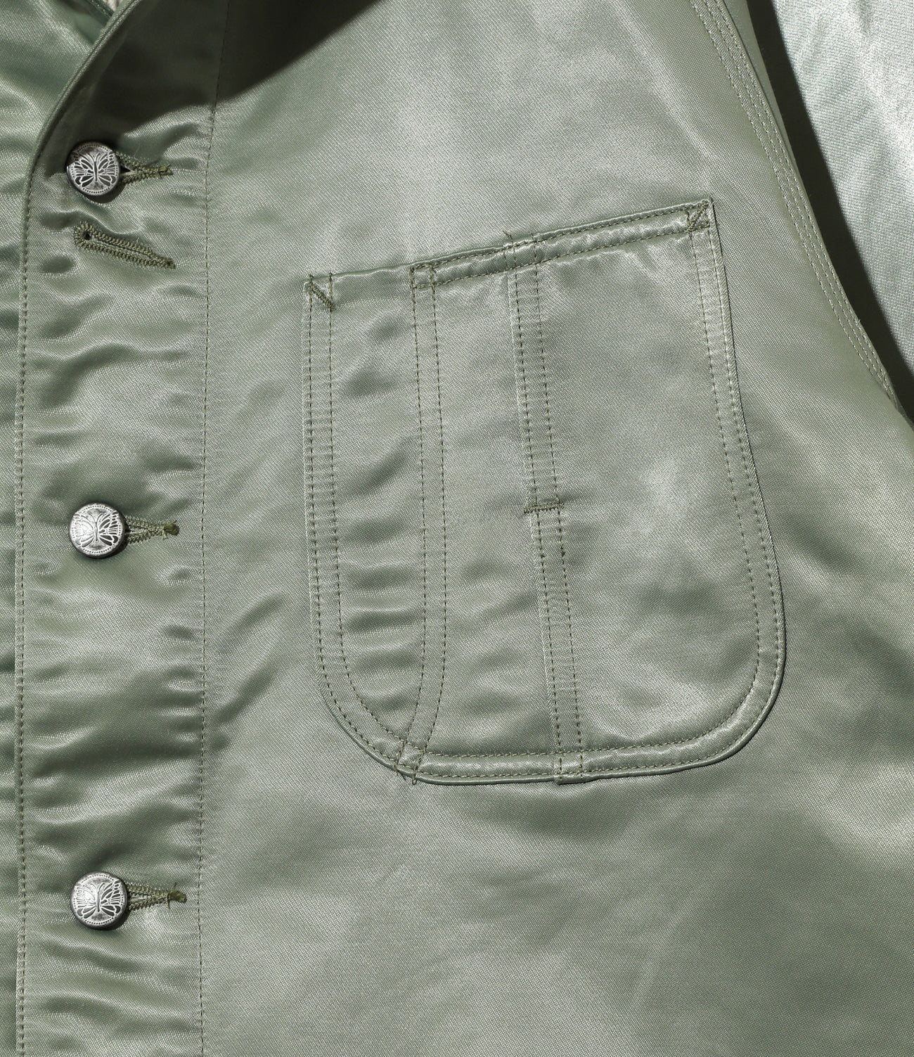 커버올 특유의 트리플 스티치, 움직임이 편한 래글런 슬리브, 중앙으로 기울어진 비대칭 가슴 포켓, 그리고 나비 문양이 새겨진 메탈 버튼 등, 브랜드의 아이덴티티가 담긴 디테일이 돋보입니다.