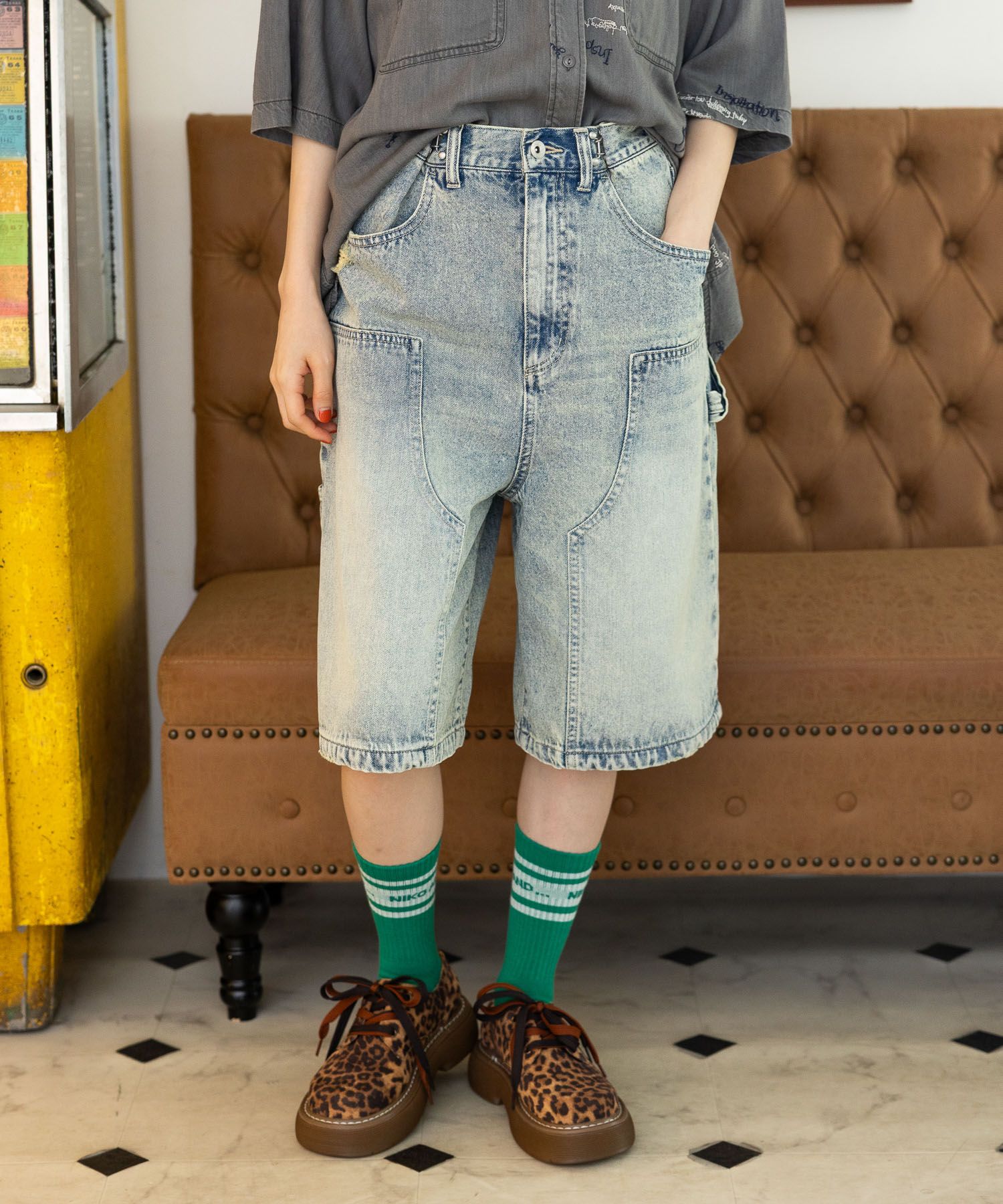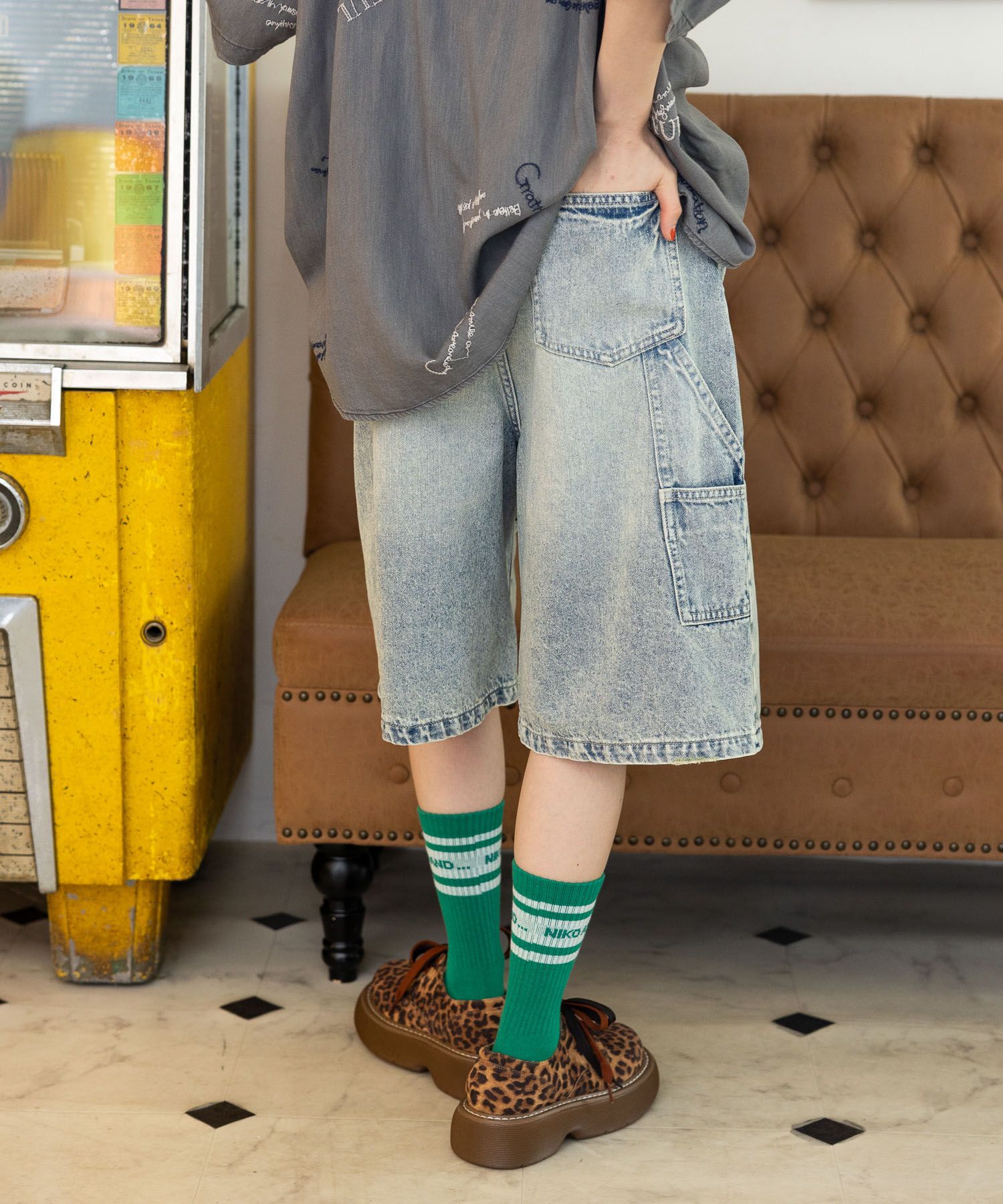 무릎을 가볍게 덮는 적당한 길이 의 데님 팬츠