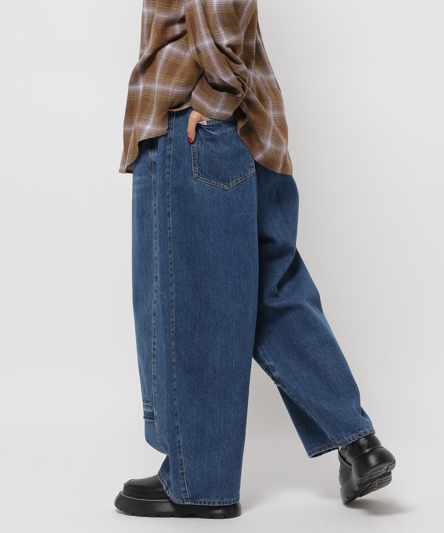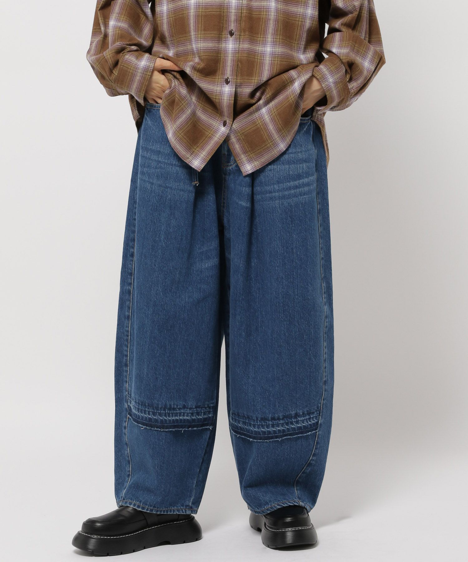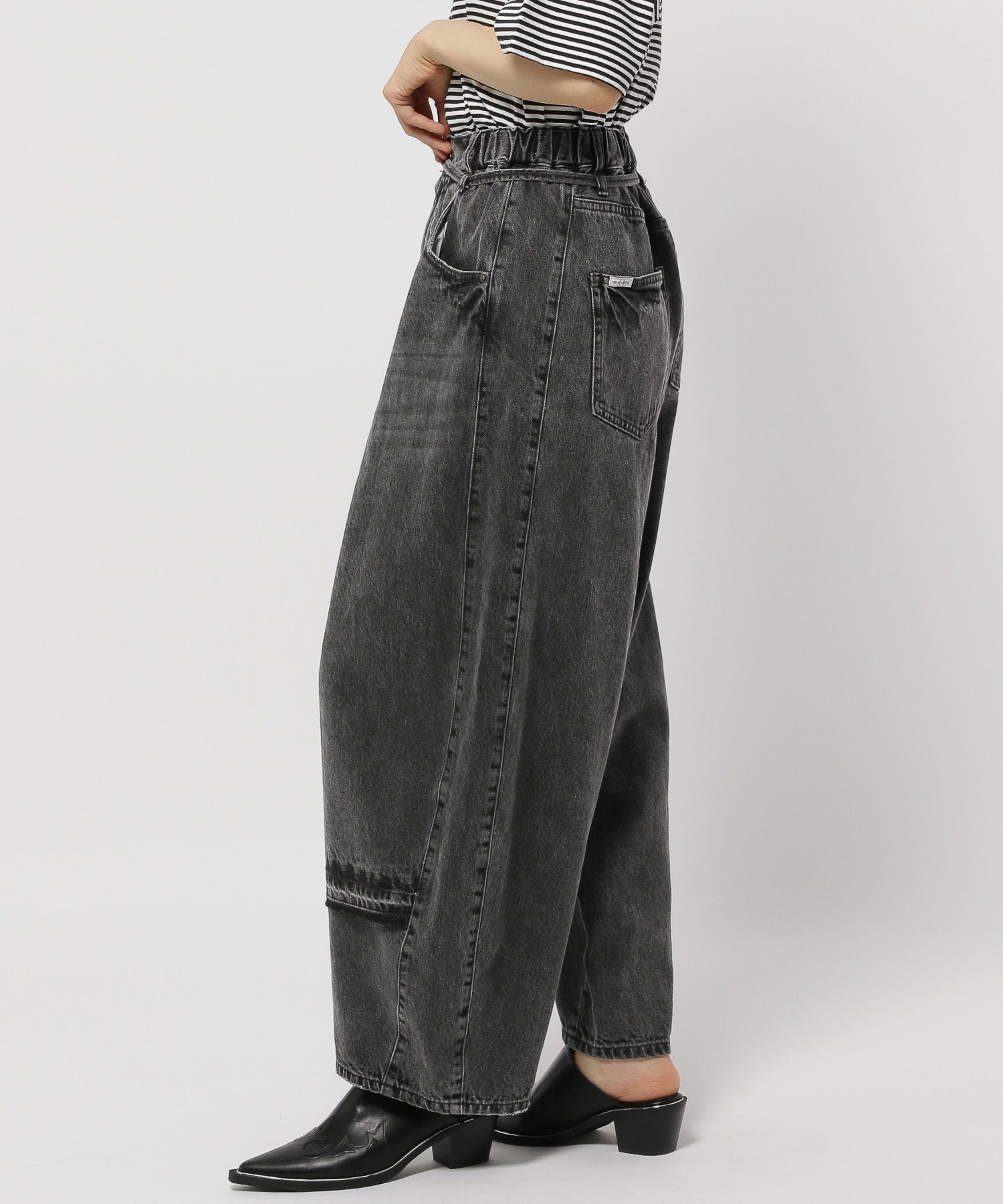 옆선 곡선을 낮게 설정해 밑단으로 자연스럽게 볼륨감이 생기는 배럴 실루엣으로 제작되었으며, 허리는 올밴딩 처리로 착용감이 매우 편안합니다.