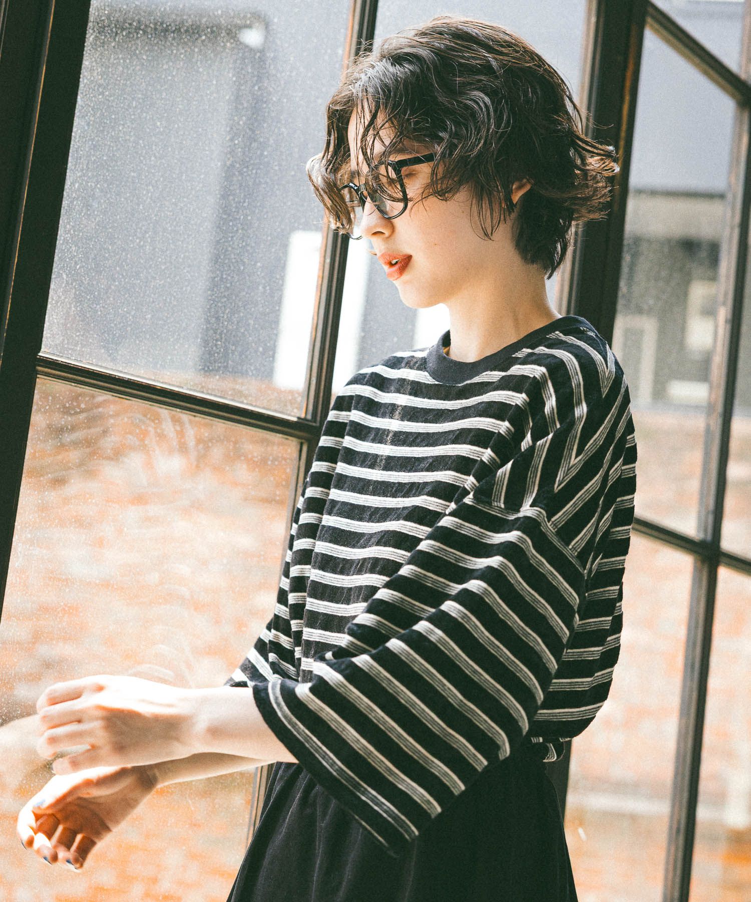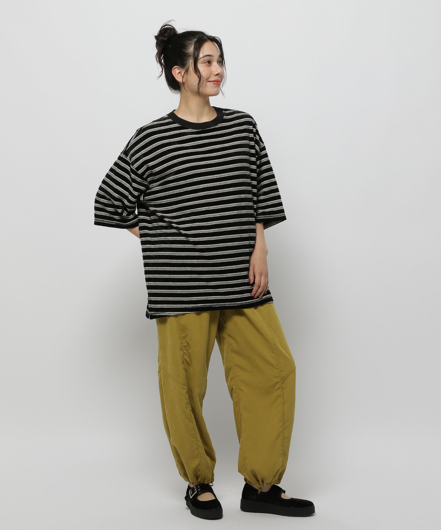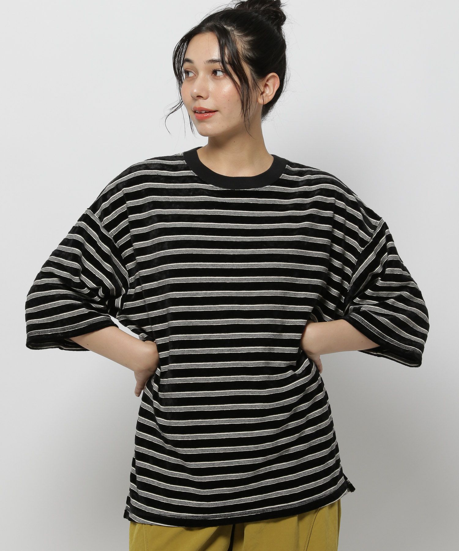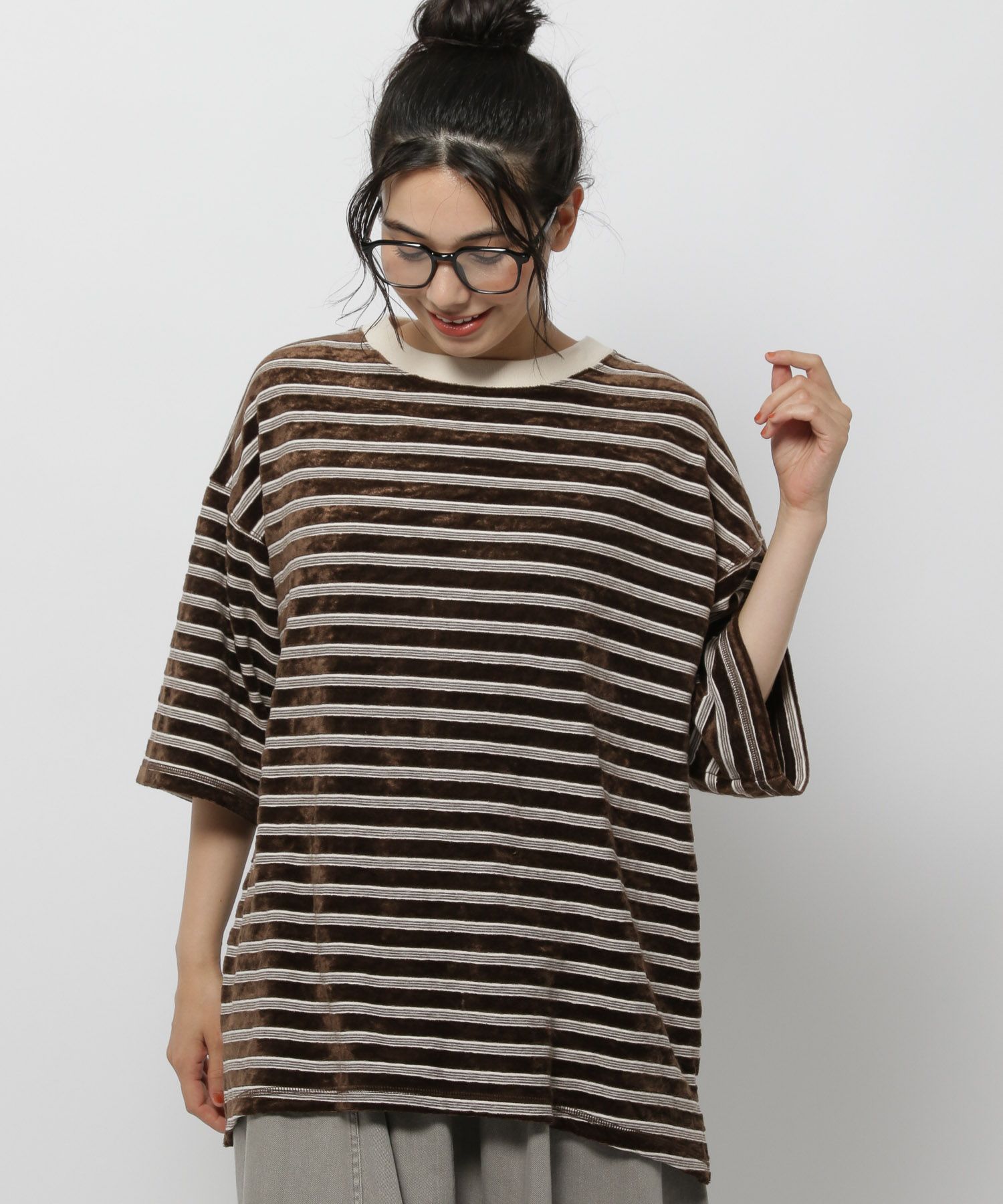 은은한 광택이 돋보이는 부드러운 벨벳 원단 으로 제작된 스트라이프 반팔 티셔츠 입니다.