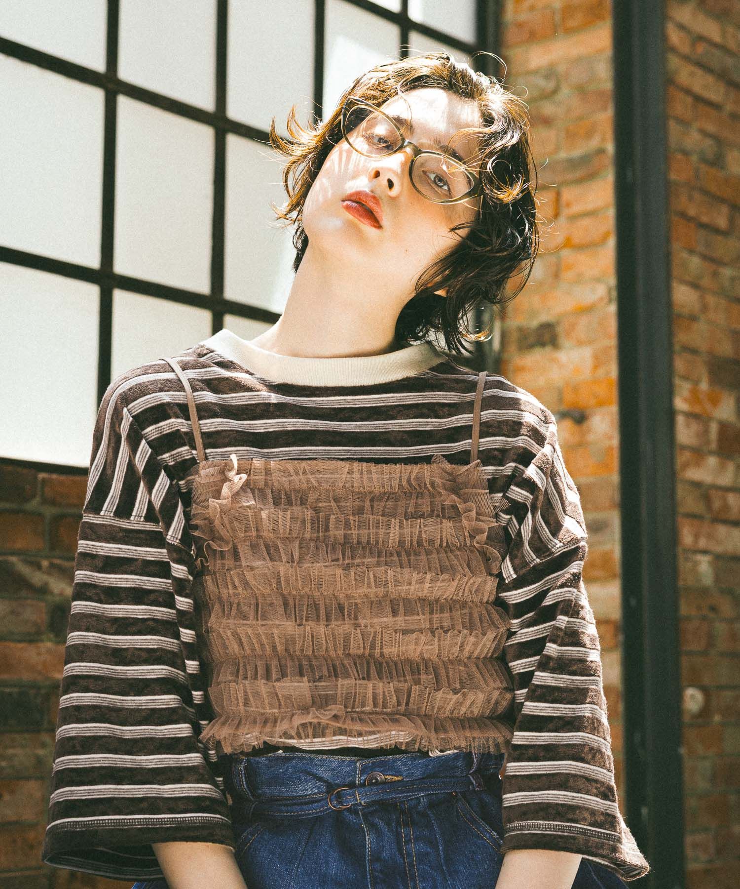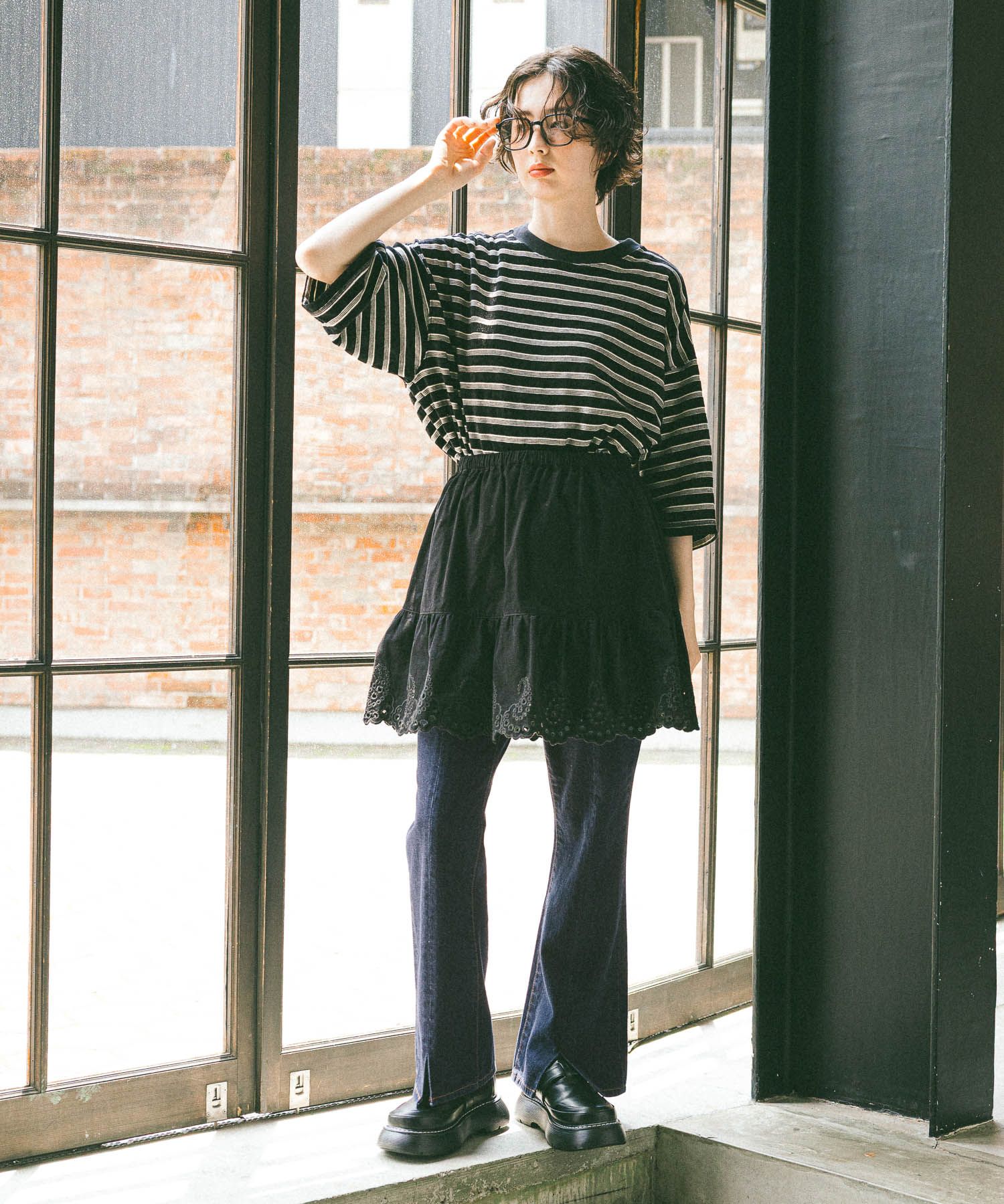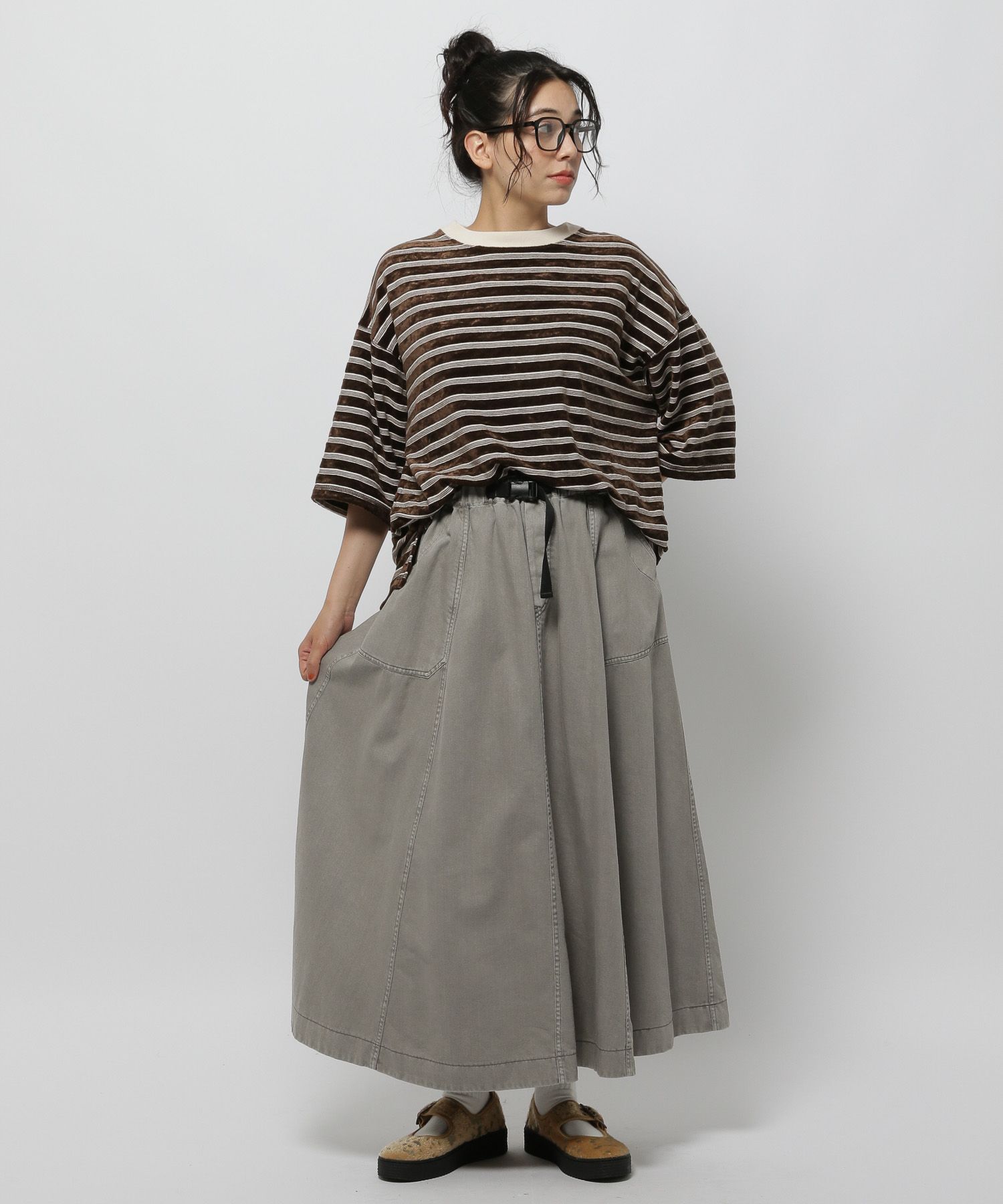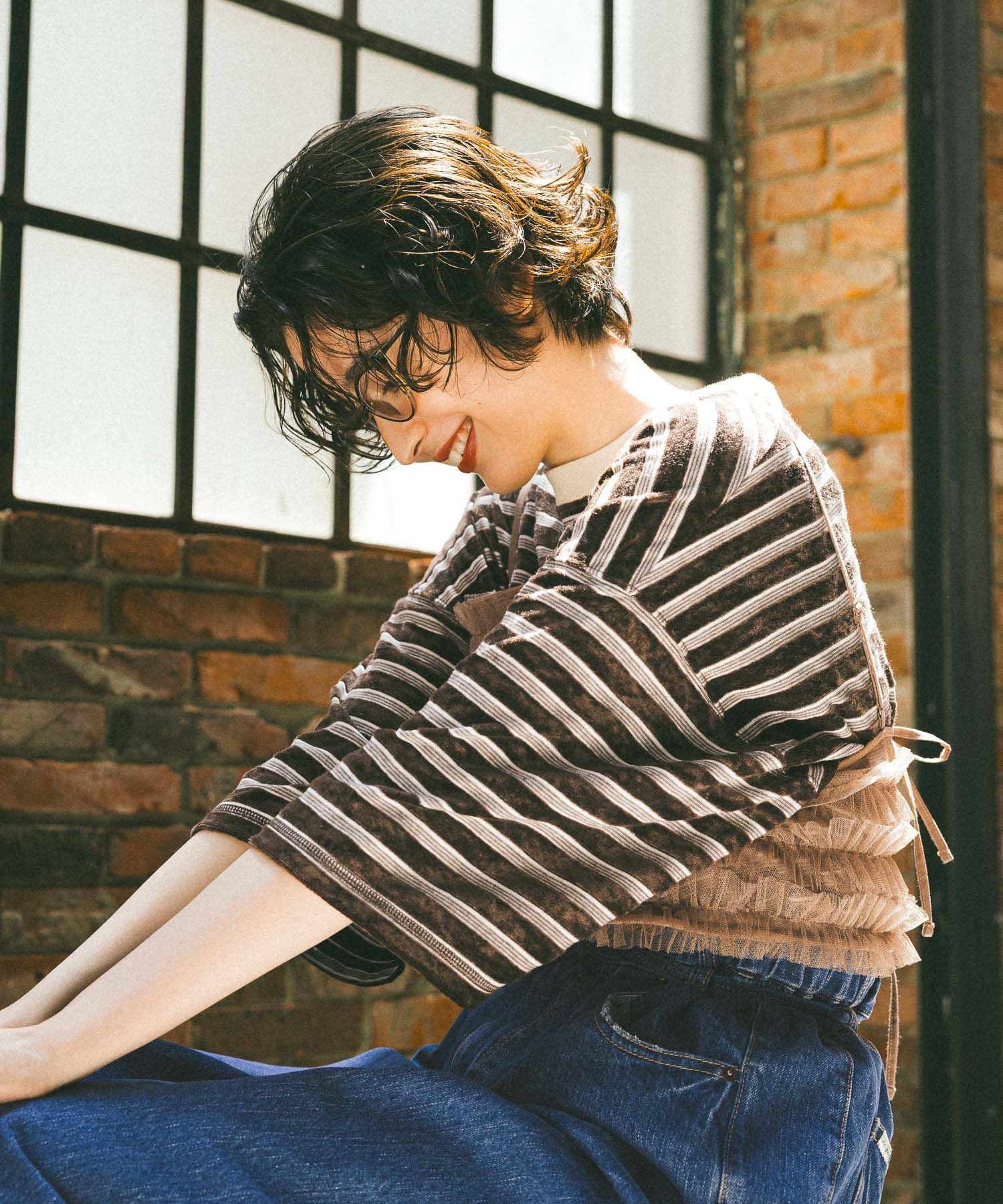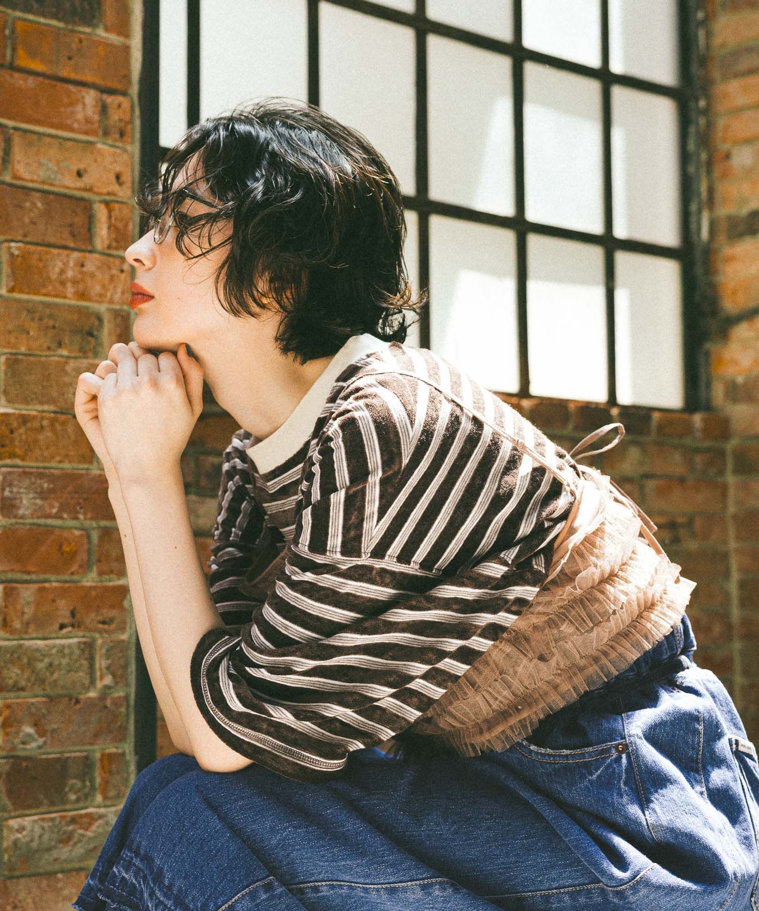 은은한 광택이 돋보이는 부드러운 벨벳 원단 으로 제작된 스트라이프 반팔 티셔츠 입니다.