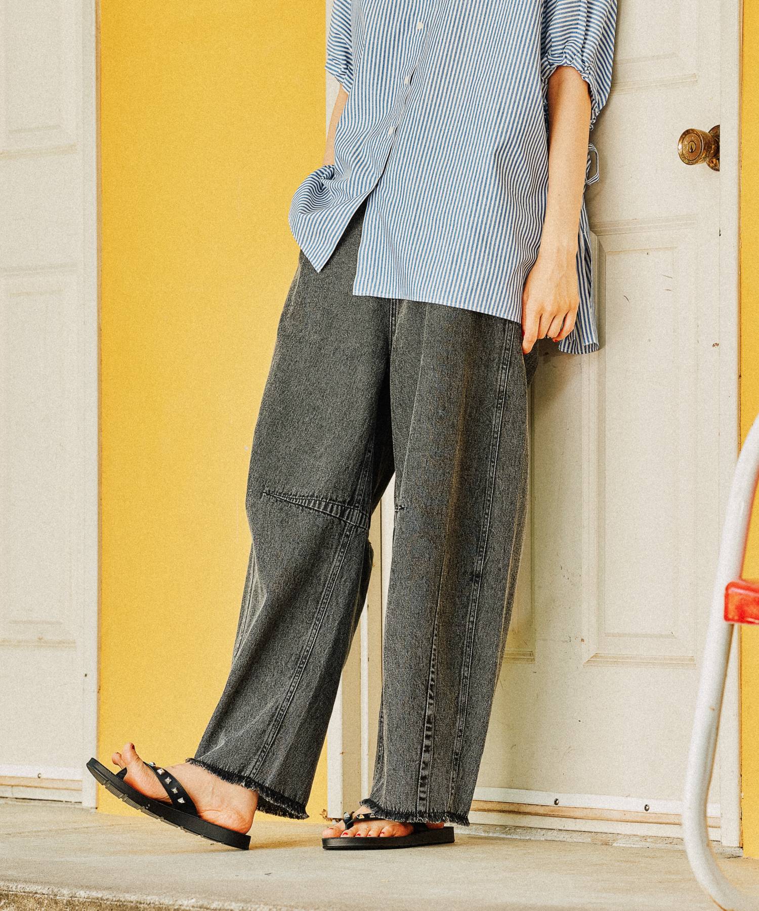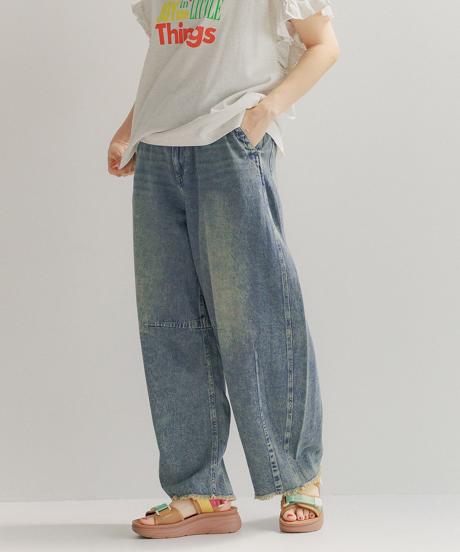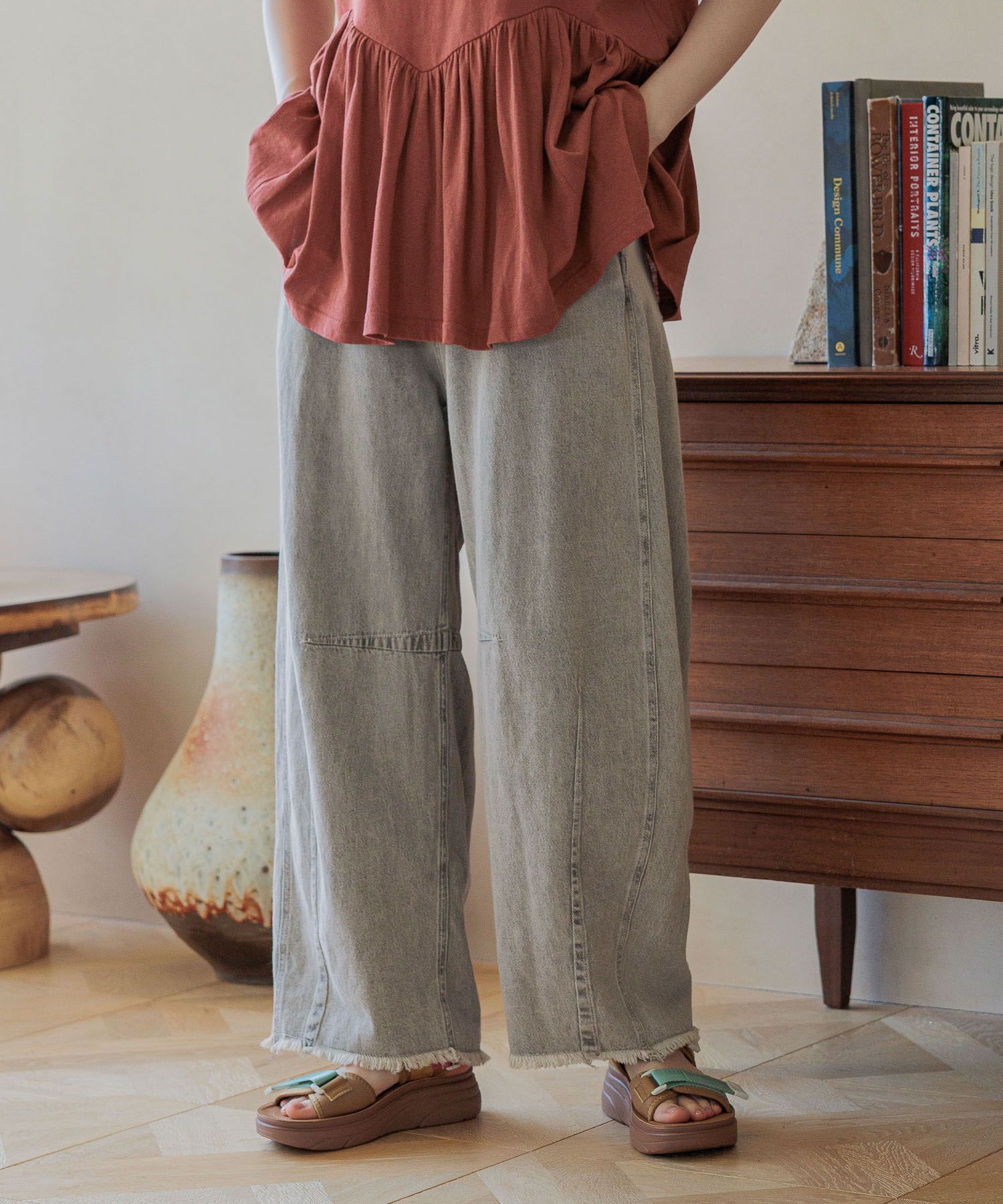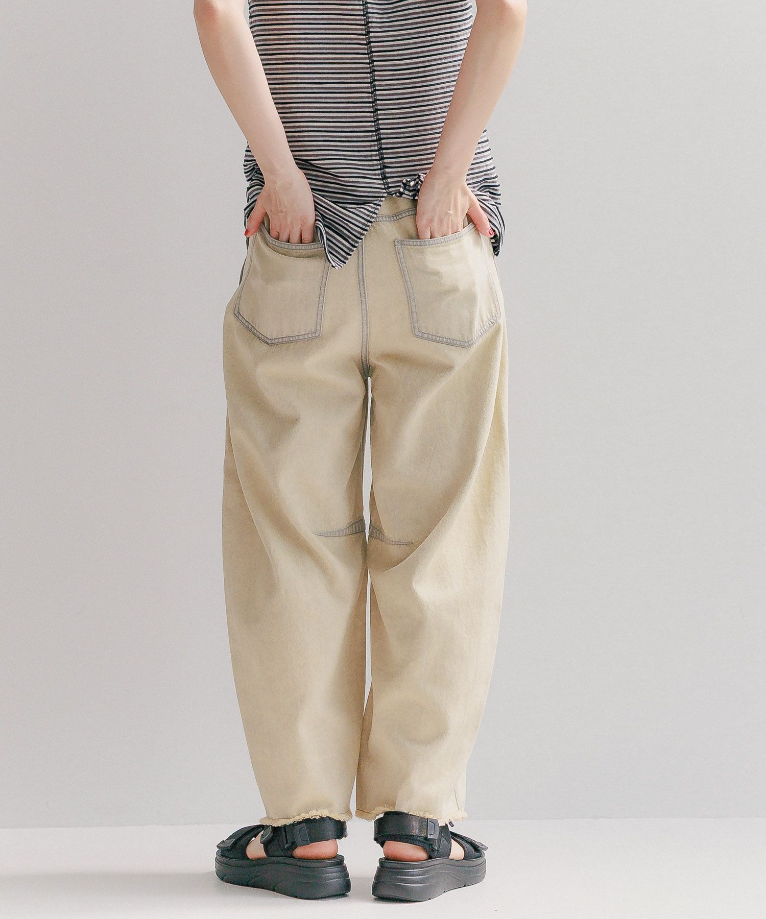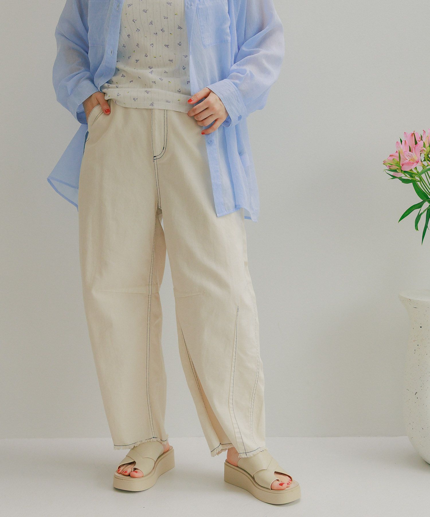 둥근 통 형태의 실루엣이 매력적인 배럴 실루엣 팬츠 입니다.