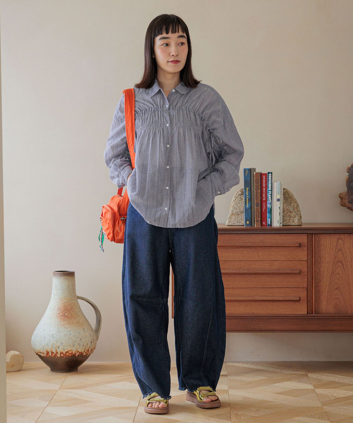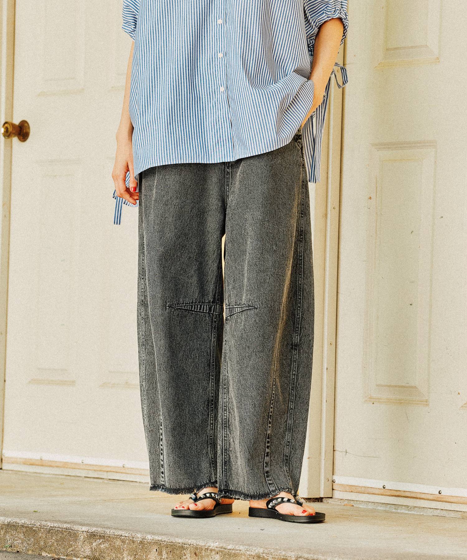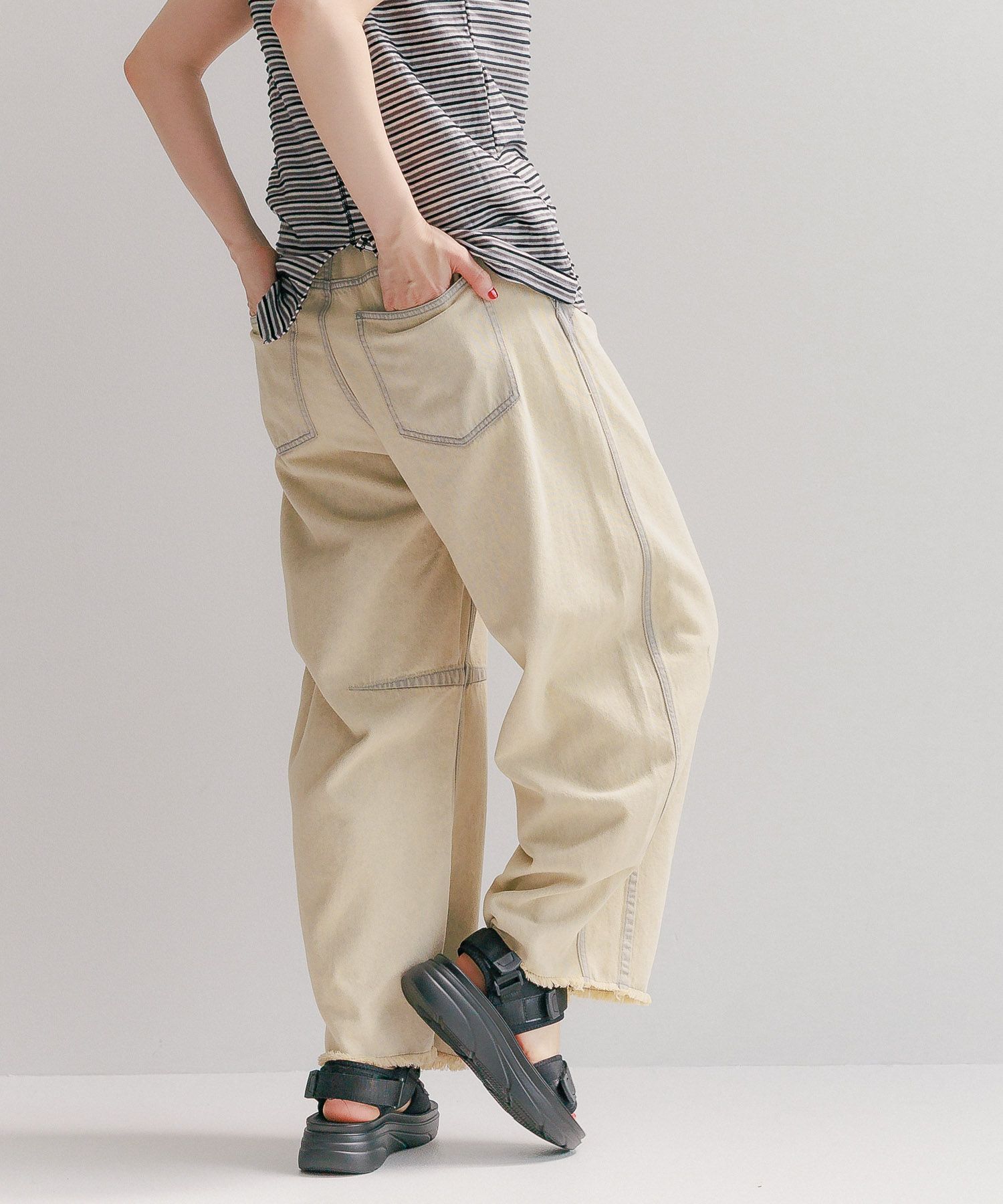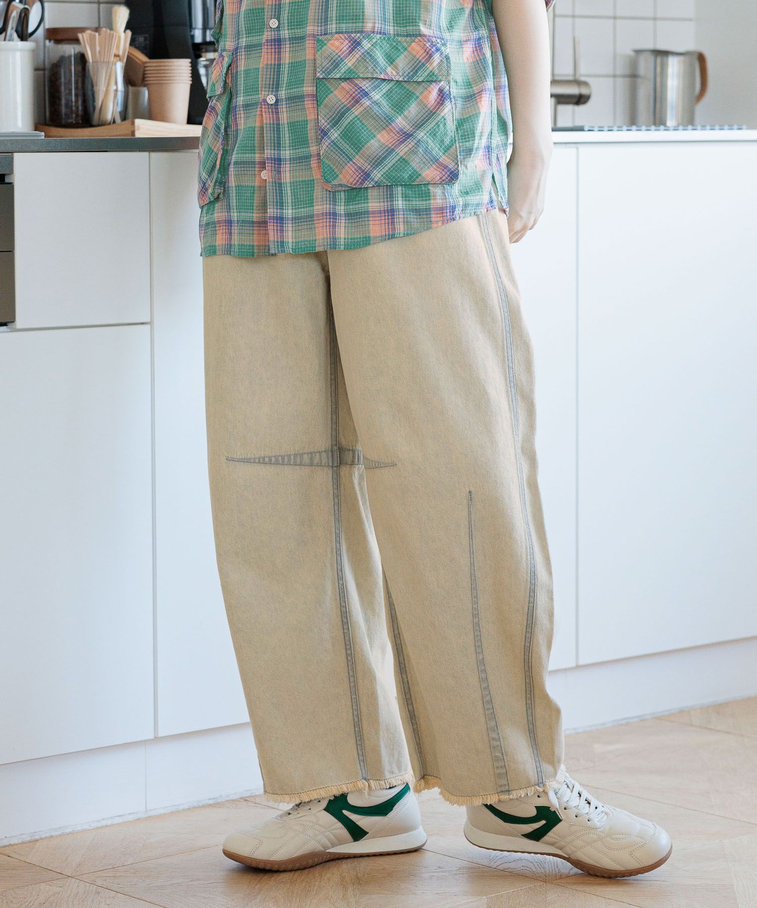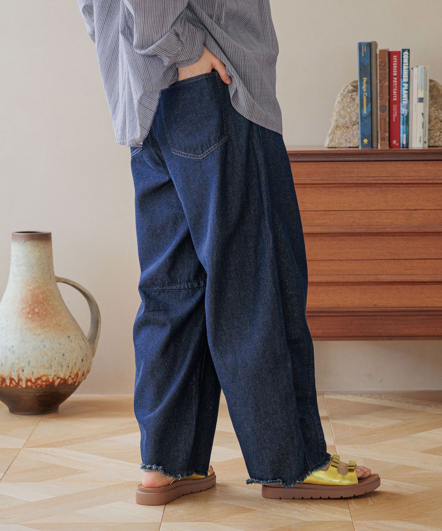 둥근 통 형태의 실루엣이 매력적인 배럴 실루엣 팬츠 입니다.
