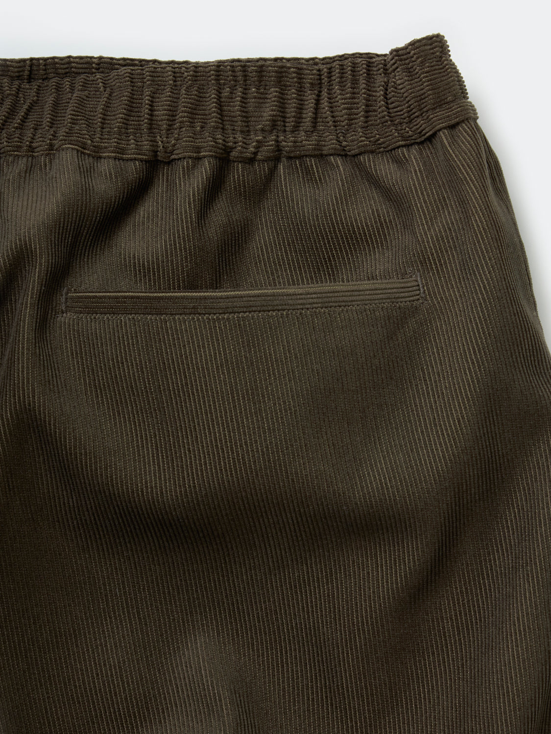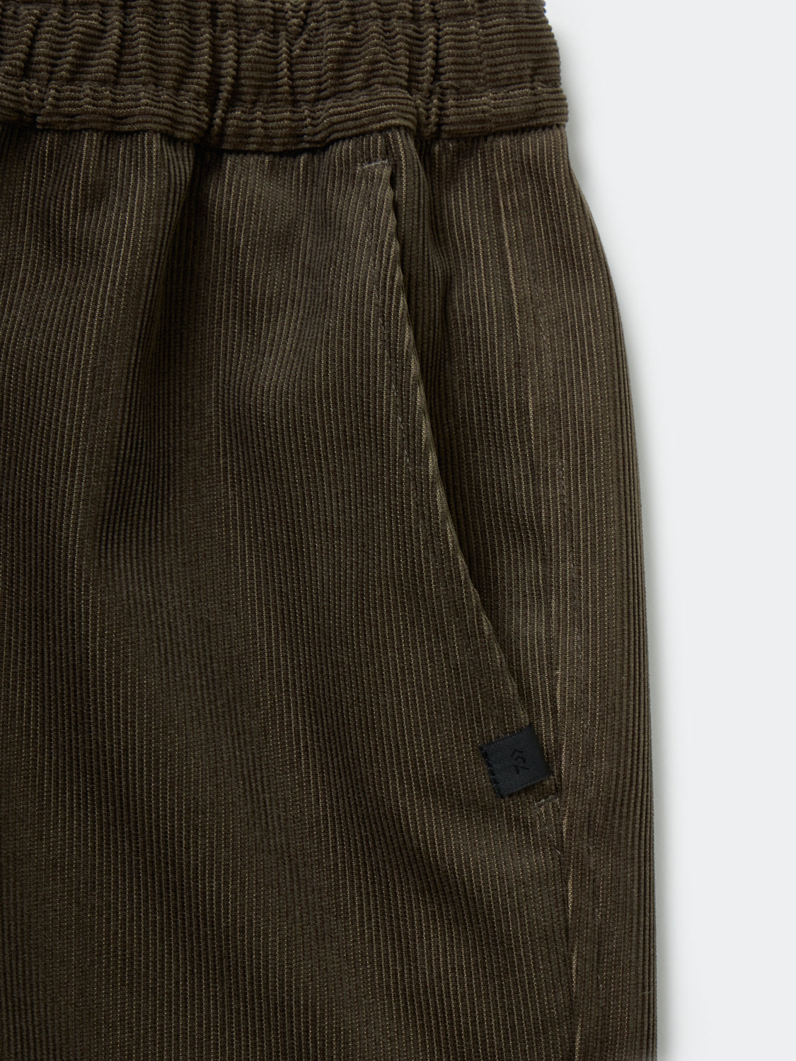 고급스러운 표면감을 의식한 세밀한 코듀로이 소재의 팬츠. 미국 전통 스타일의 베이식한 플레인 프론트 트라우저즈를 스포티하게 재해석한 디자인입니다. 허리와 밑단에 드로우코드가 있어 편안합니다.