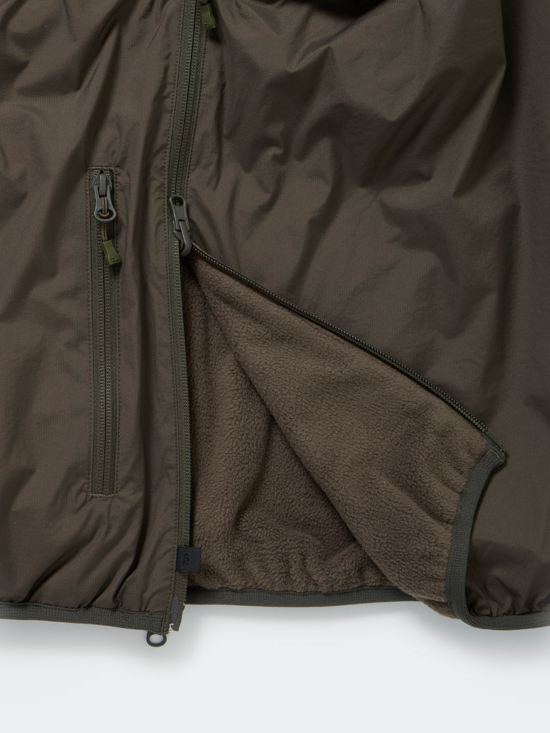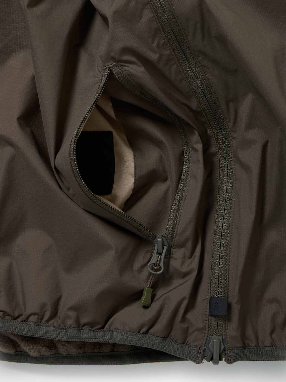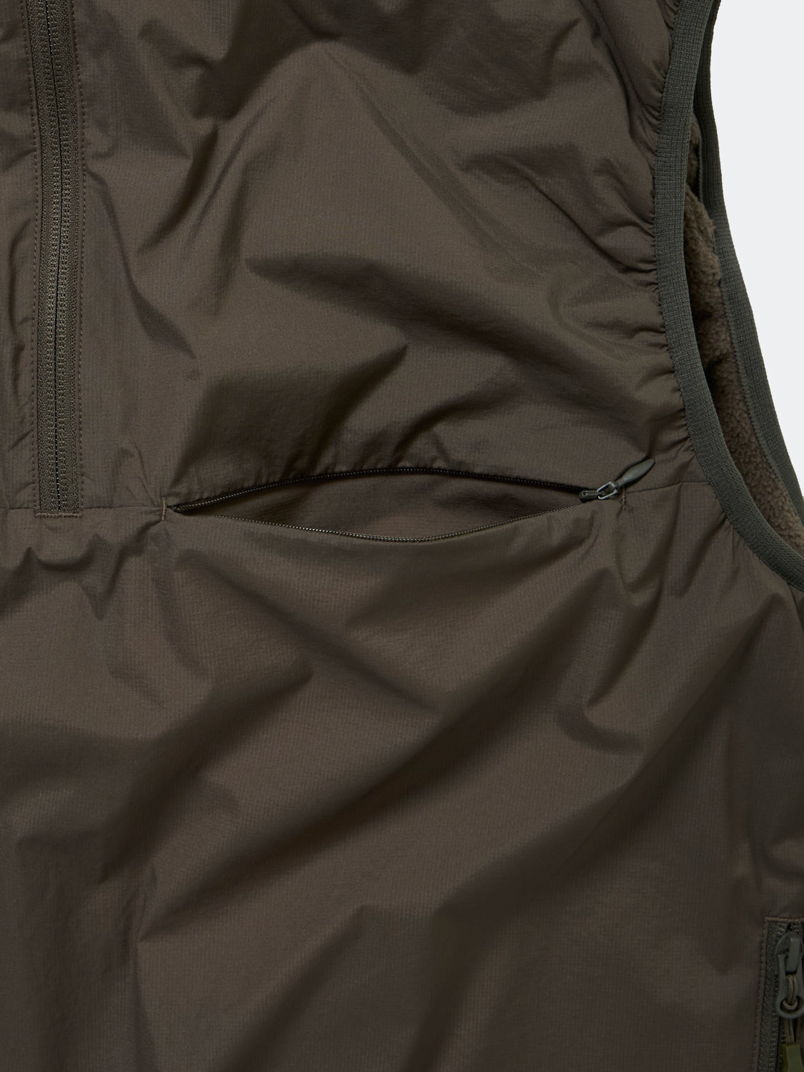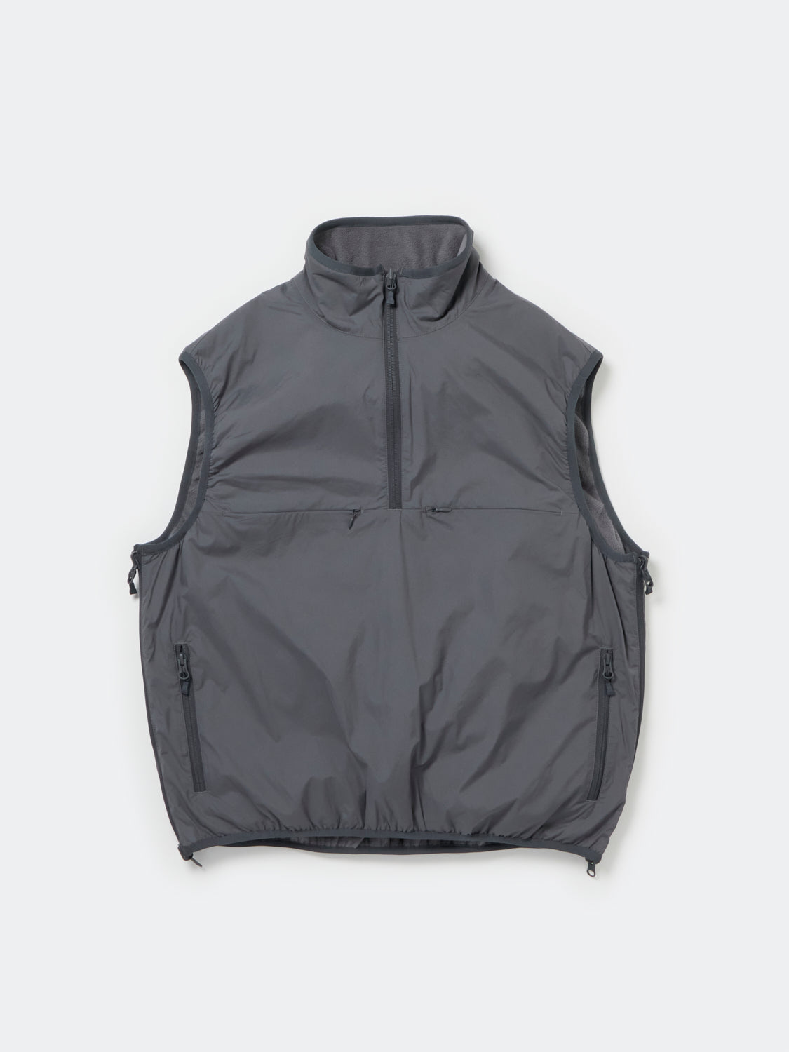 겉감은 립스톱 나일론 셸, 안감은 플리스로 되어 있어 리버서블로 착용할 수 있는 조끼. 1990년대 디자인을 연상시키는 외관과 곳곳에 보이는 파이핑 디테일이 특징입니다.