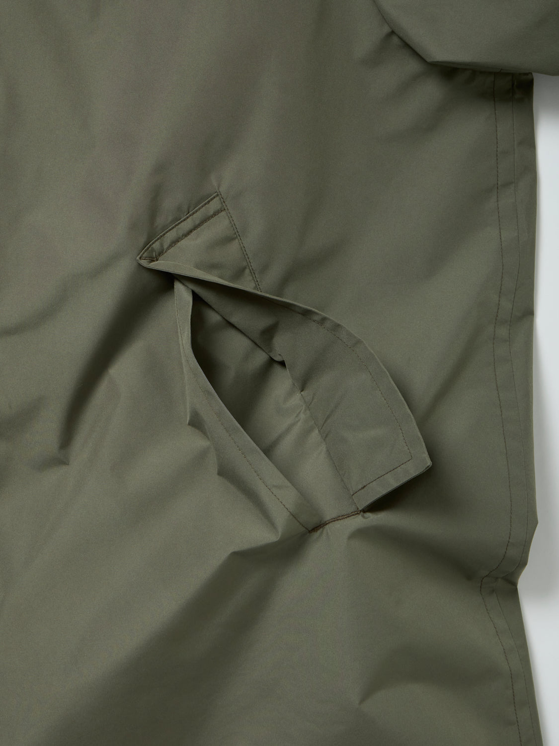50데니어 리사이클 폴리에스터 태피터 소재를 사용하며 환경을 고려한 발수 가공을 했습니다. 여러개의 인사이드 포켓이 있으며 탈착식 후드가 있습니다.