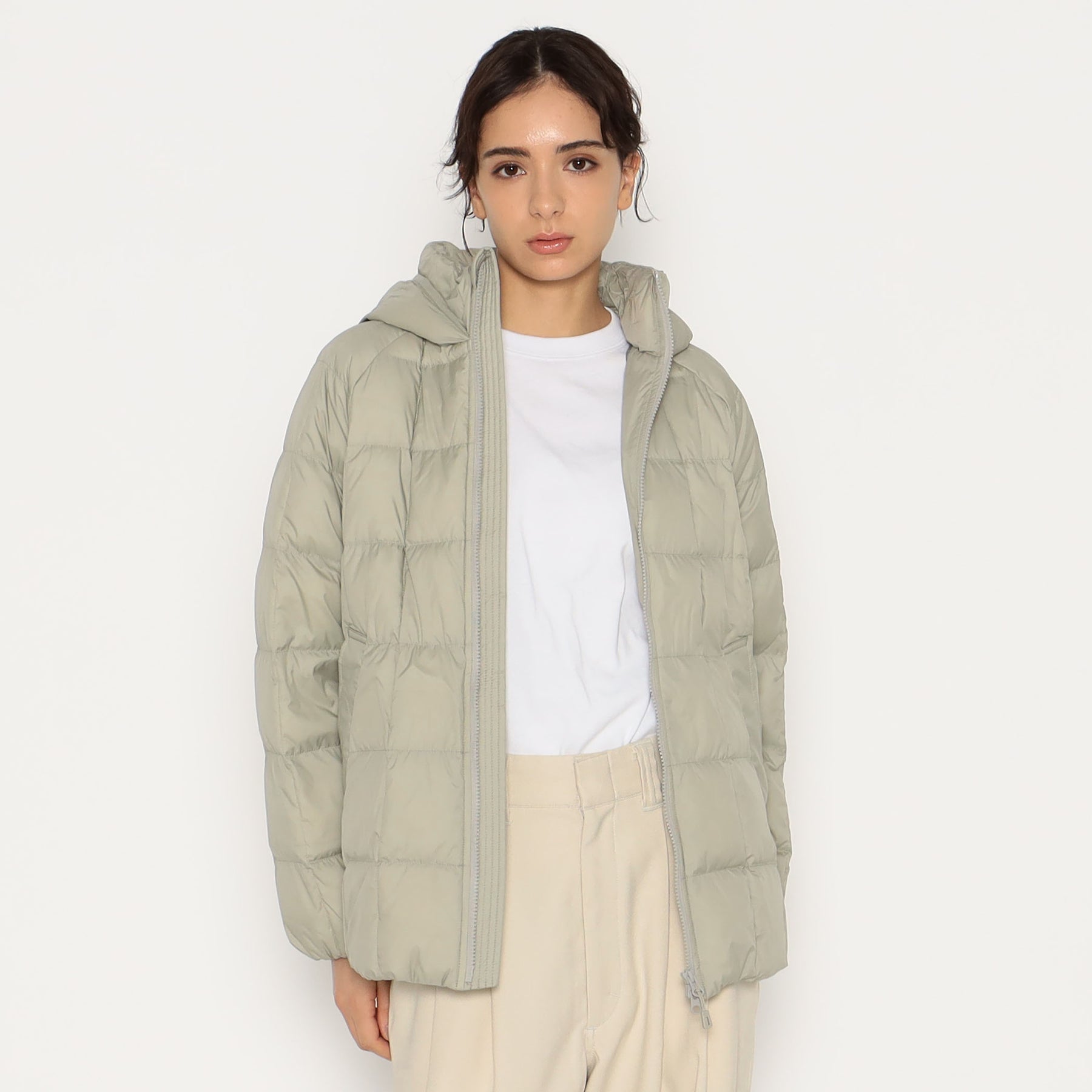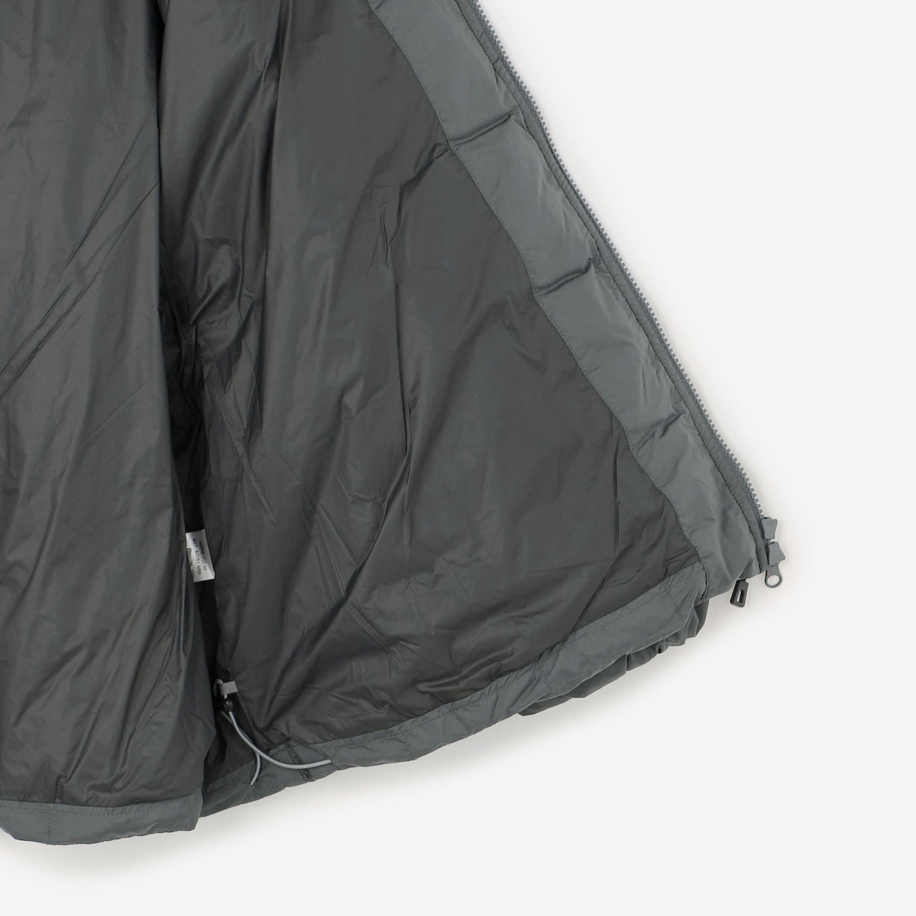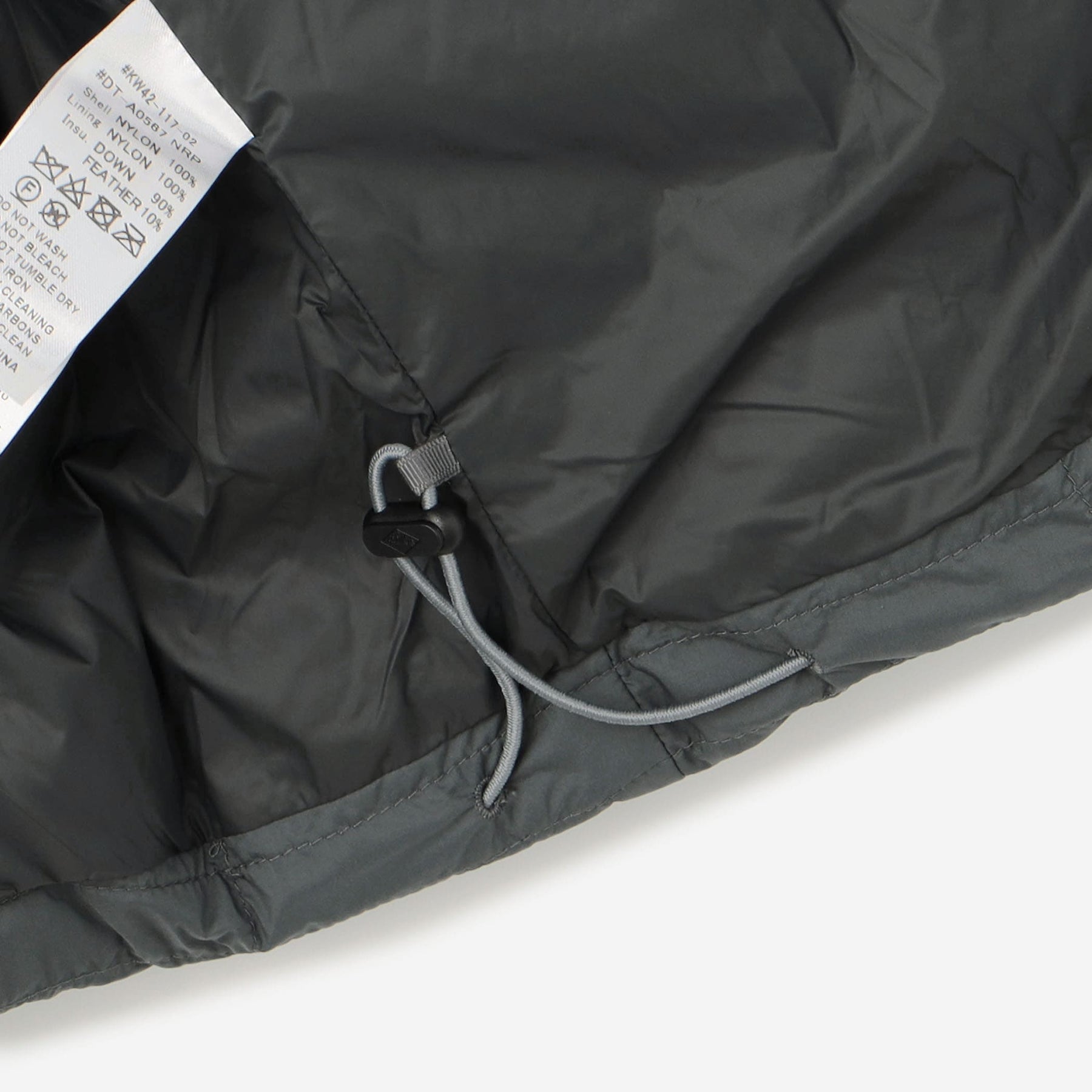 겉감은 나일론 태피터를 사용하여 매트하고 부드러운 감촉이 특징입니다. 스퀘어 쉐이프의 다운 스티치로 적당한 볼륨감이 있습니다. 허리는 신축성 있는 드로우 코드가 있어 실루엣 조절이 가능합니다.