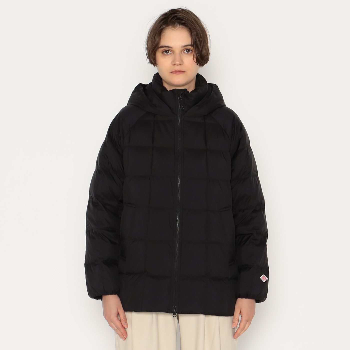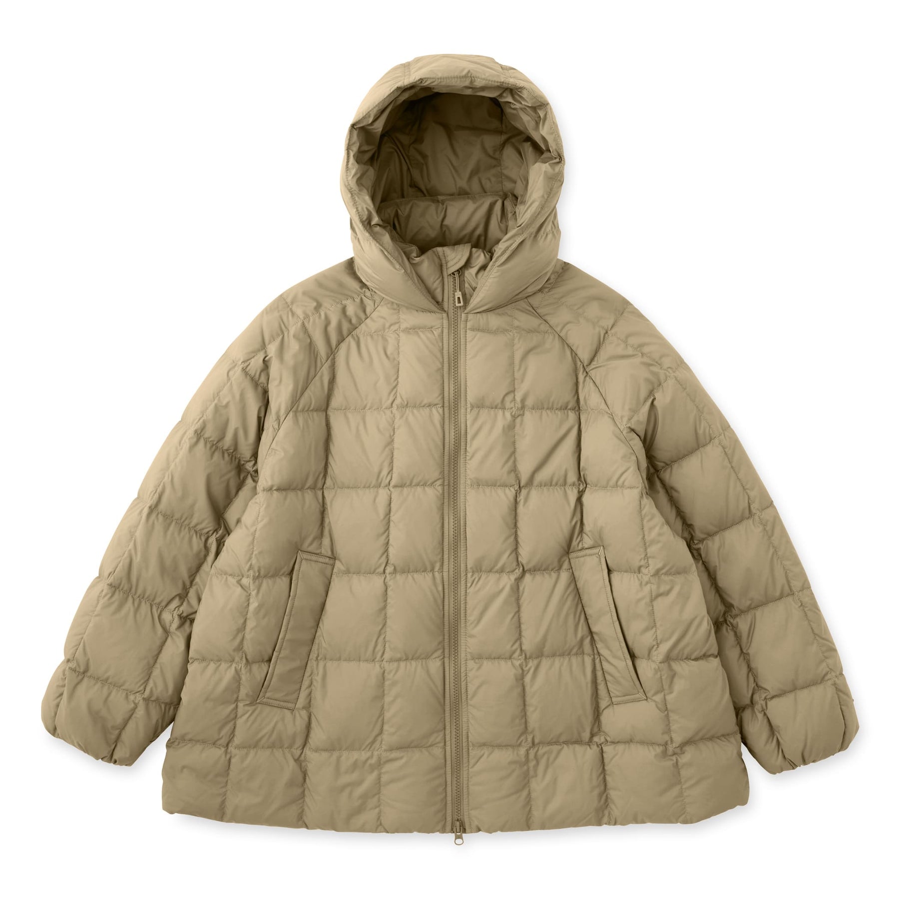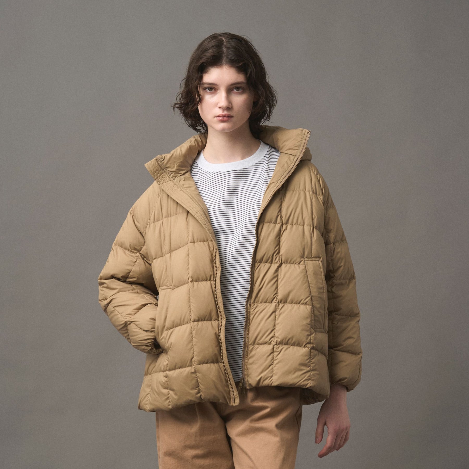 겉감은 나일론 태피터를 사용하여 매트하고 부드러운 감촉이 특징입니다. 스퀘어 쉐이프의 다운 스티치로 적당한 볼륨감이 있습니다. 허리는 신축성 있는 드로우 코드가 있어 실루엣 조절이 가능합니다.