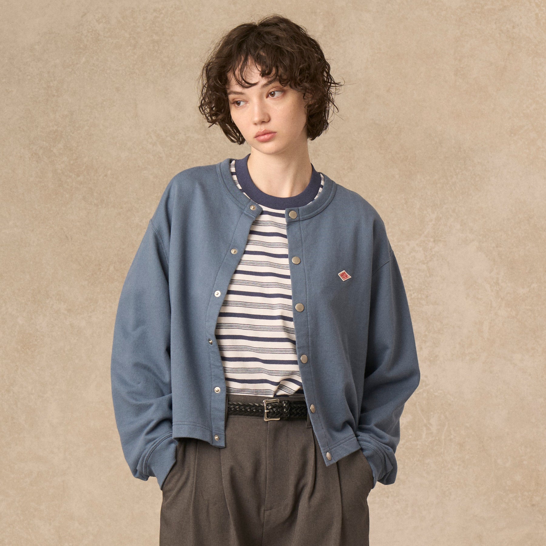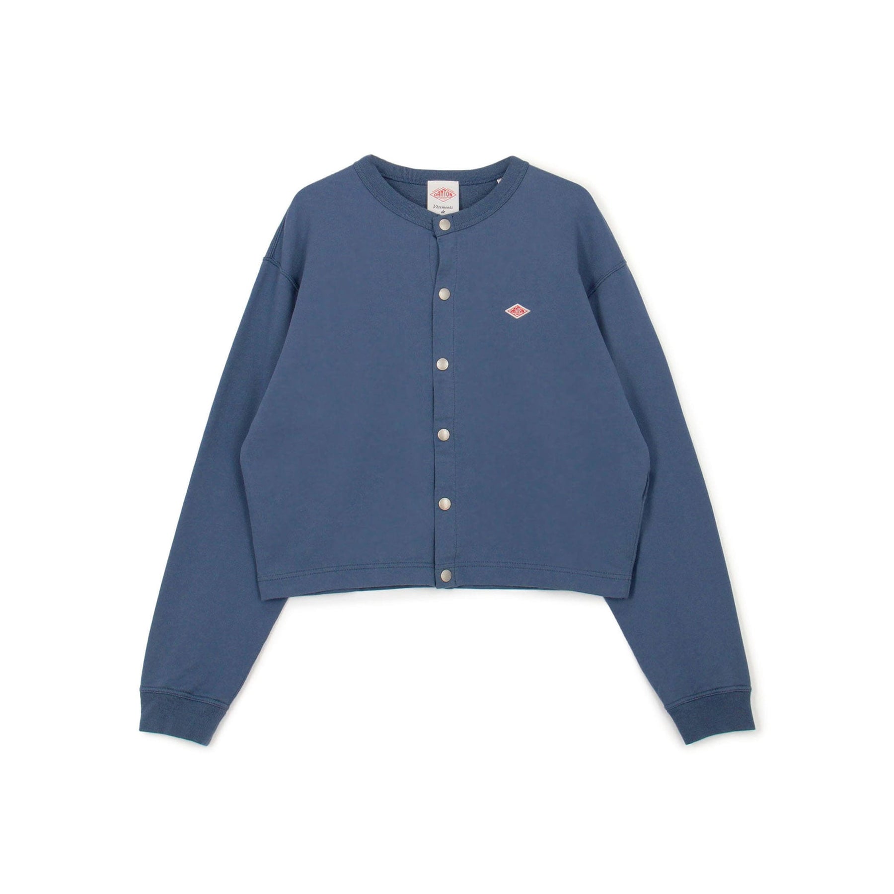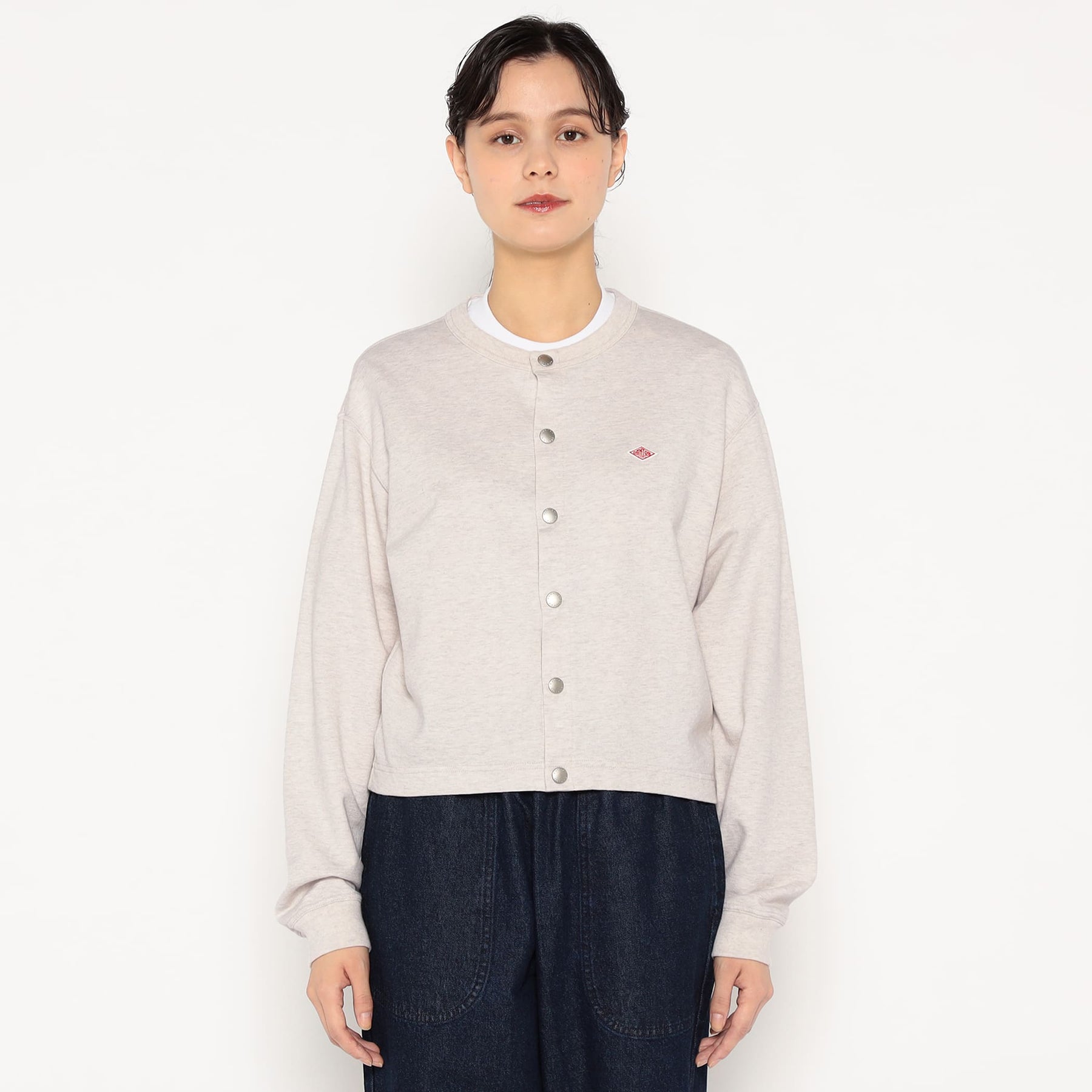 약간 넓은 네크라인, 짧은 길이, 넓은 박시한 실루엣이 특징입니다. 단톤 로고가 새겨진 도트 버튼을 사용합니다.
