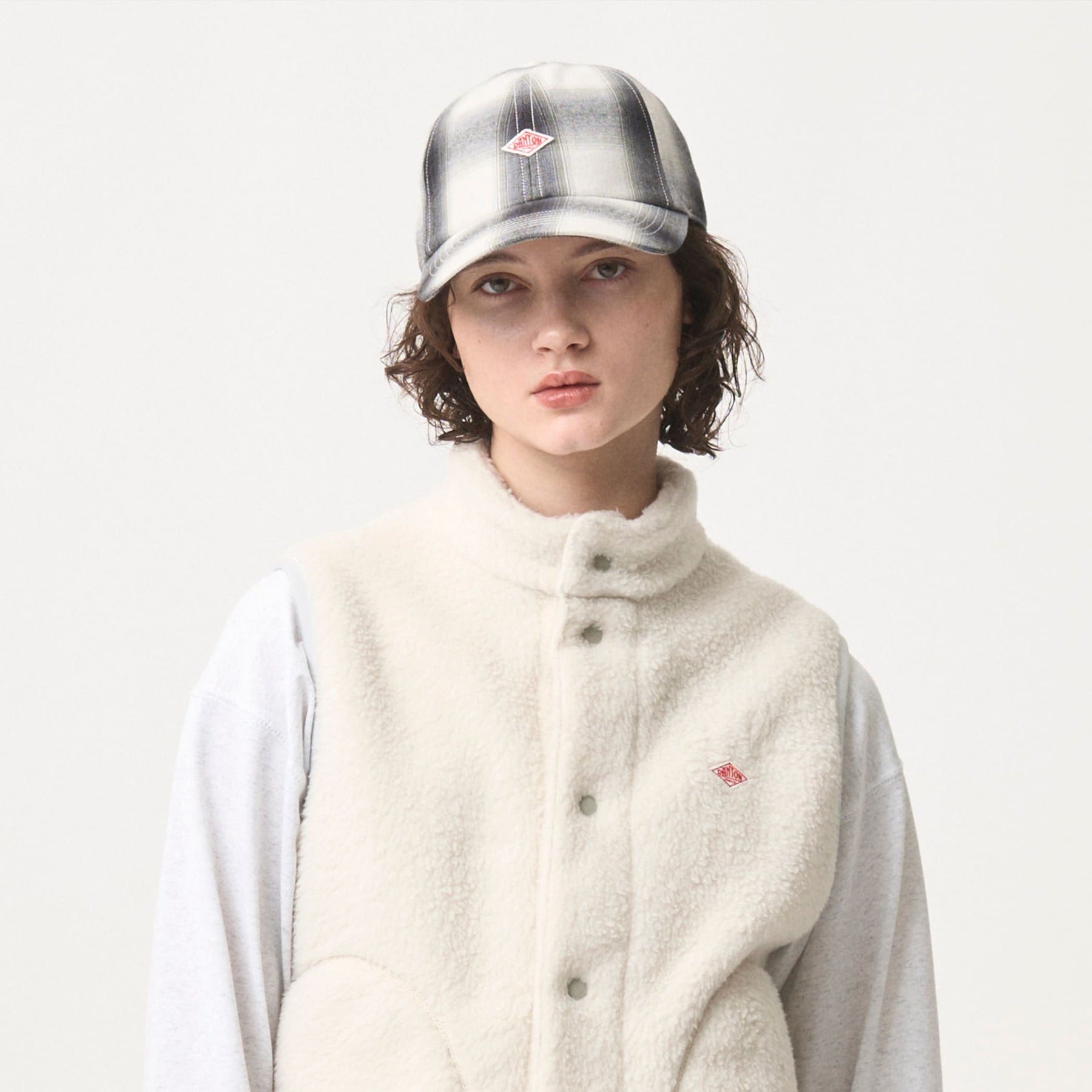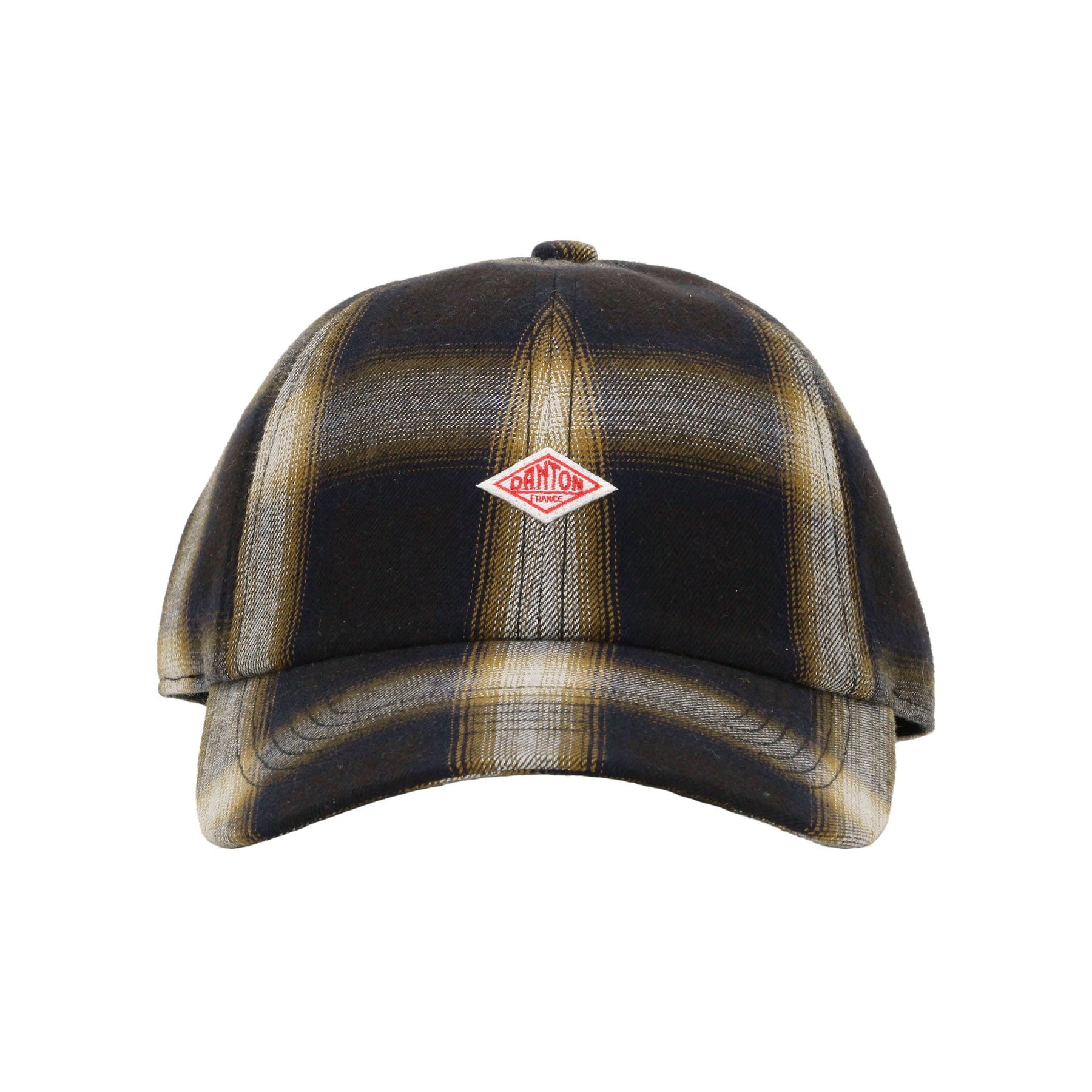 전면에 로고 패치가 더해진 옴브레 체크 패턴의 6패널 캡