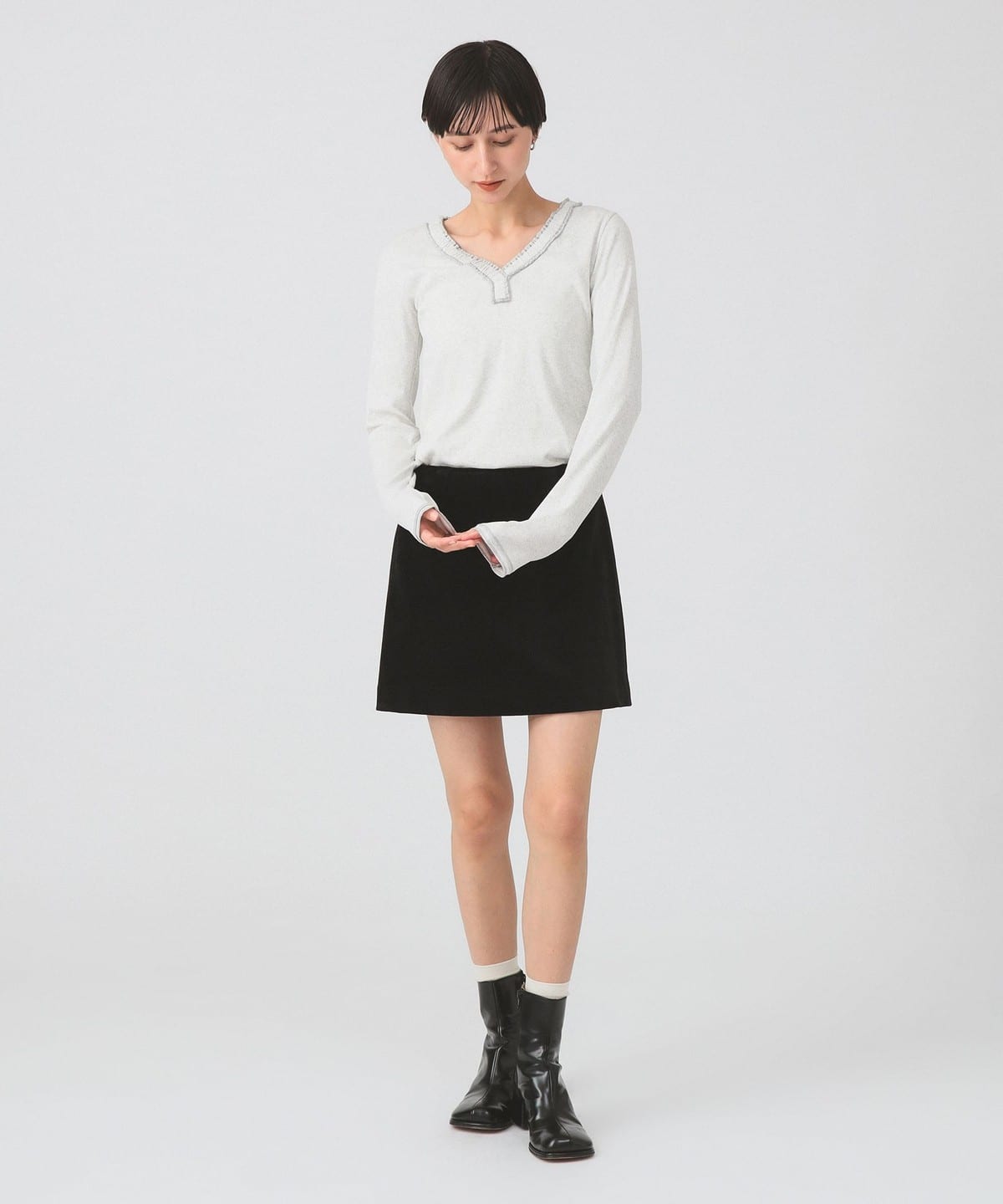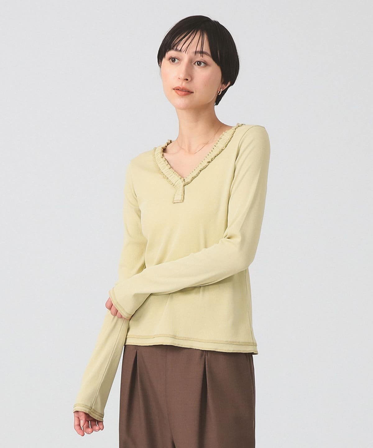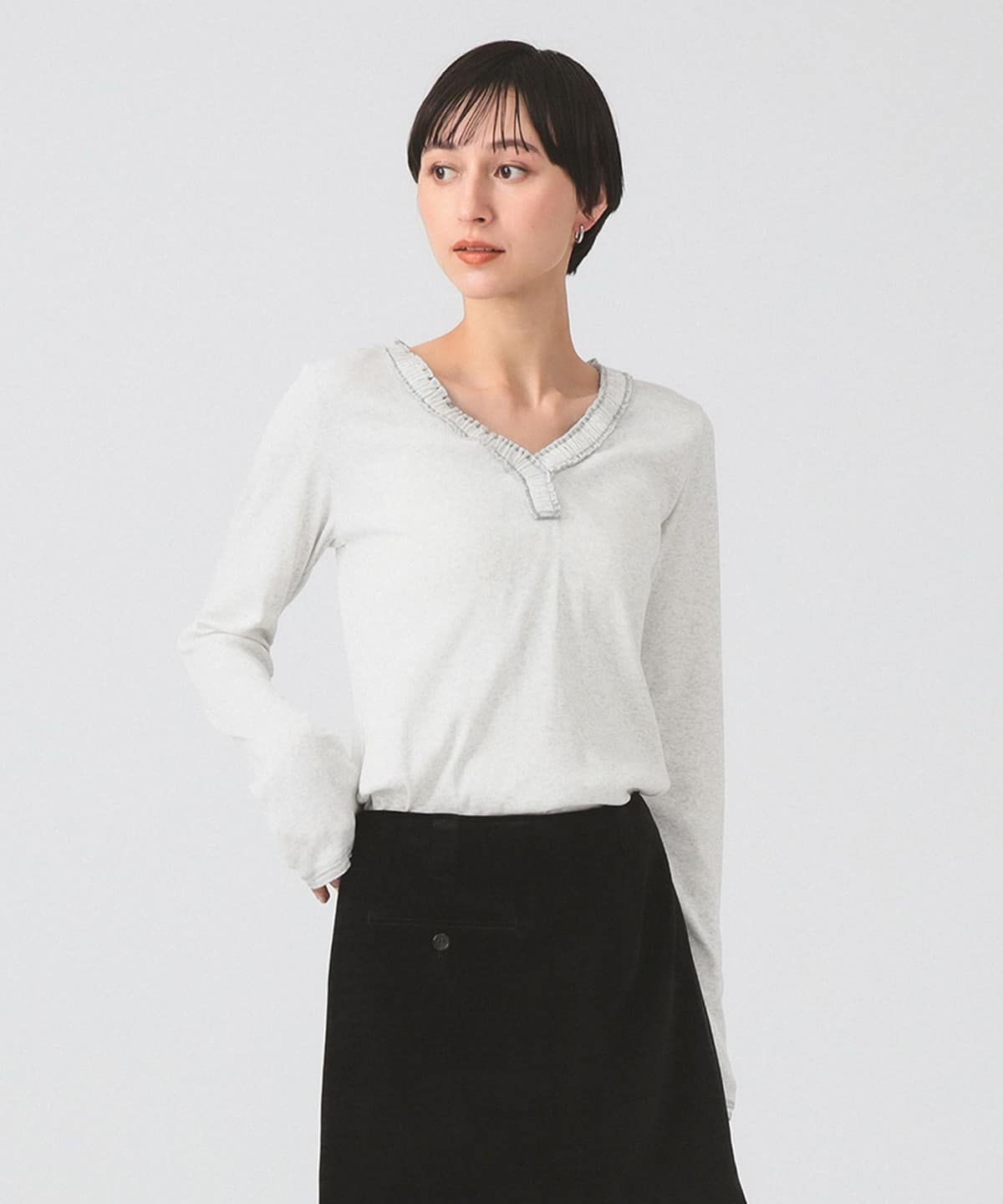 깊지 않은 브이넥 디자인이며 소매와 밑단은 이중 마감 처리로 약간 길게 디자인되어 팔 라인을 슬림해 보입니다.
