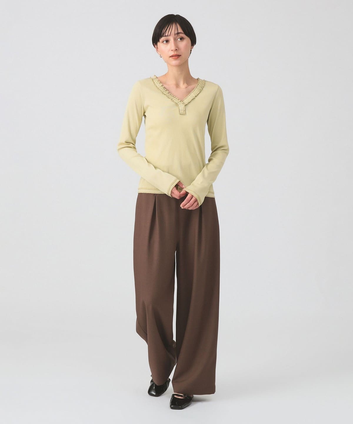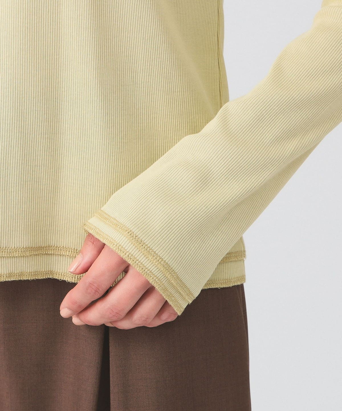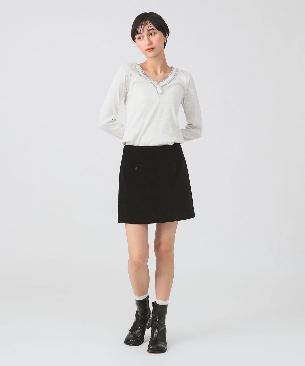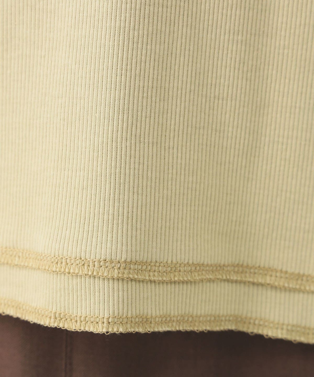 깊지 않은 브이넥 디자인이며 소매와 밑단은 이중 마감 처리로 약간 길게 디자인되어 팔 라인을 슬림해 보입니다.