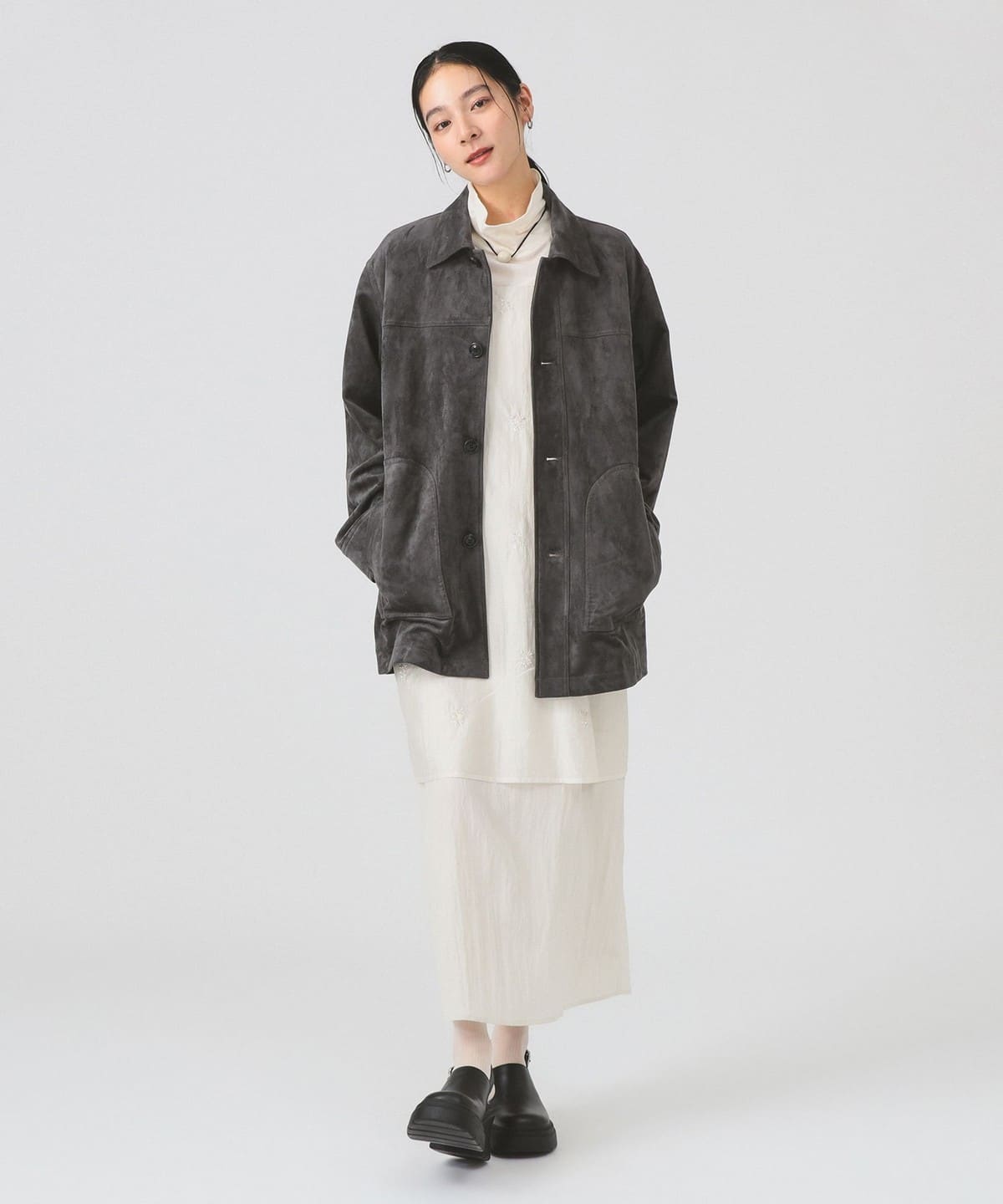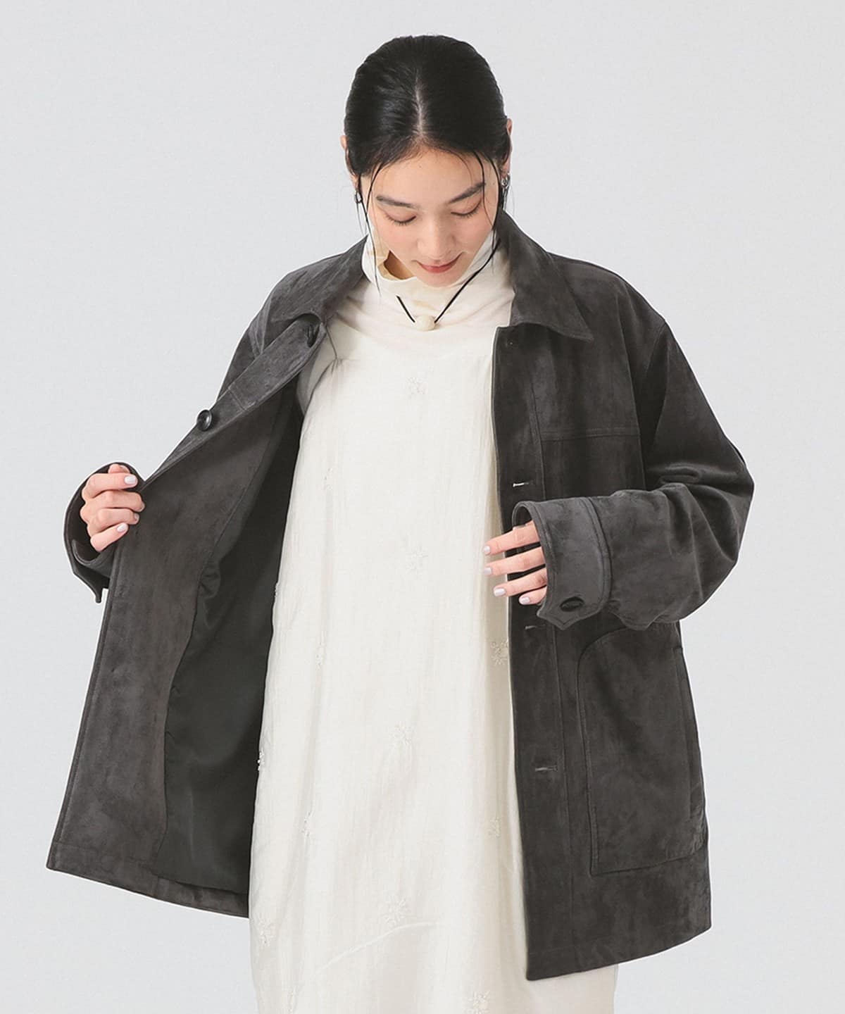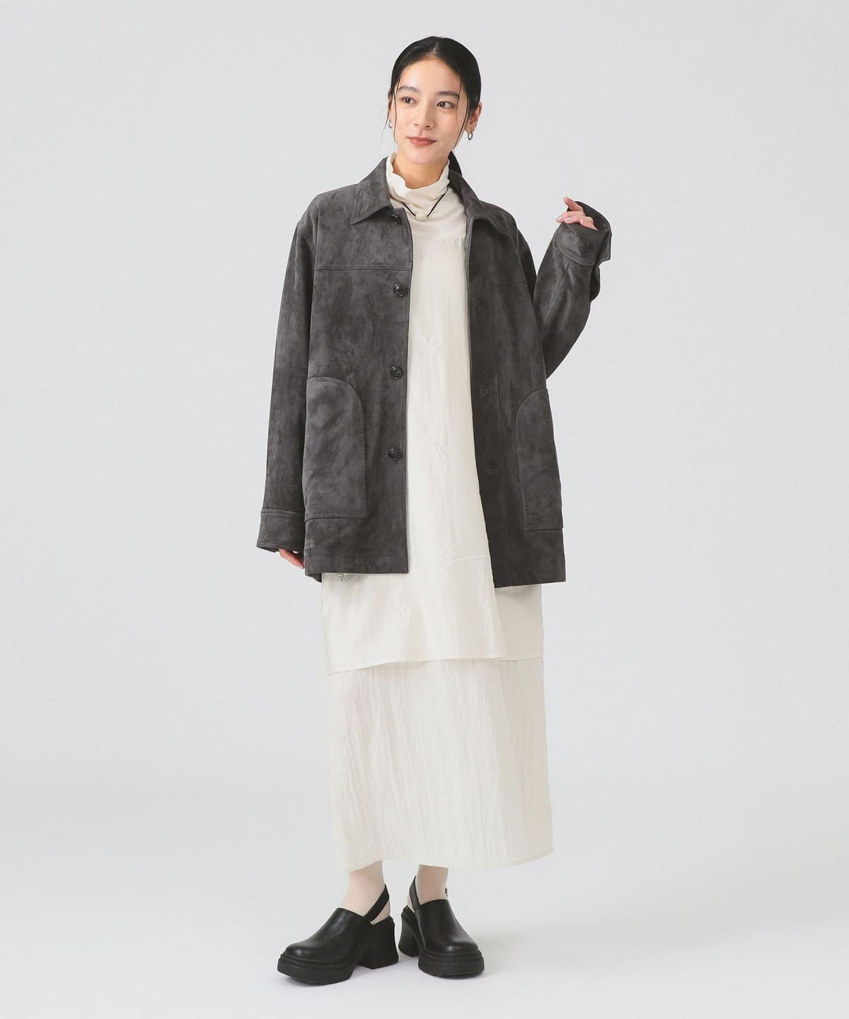 커버올 형태의 디자인을 모티프로 한 하프코트입니다. 은은한 드레이프감이 느껴지는 원단이며 부드럽고 매끄러운 촉감의 페이크 스웨이드 원단을 사용합니다. 여유로운 실루엣으로 이너를 겹쳐 입기에도 편안합니다.