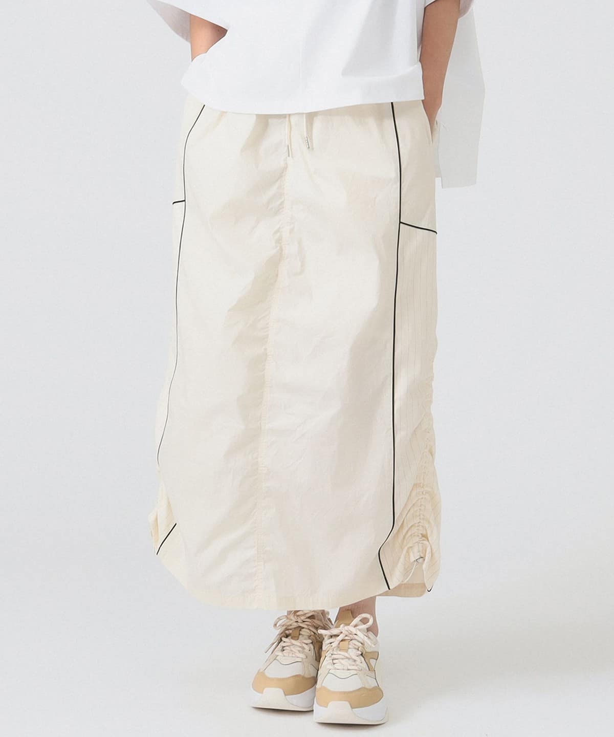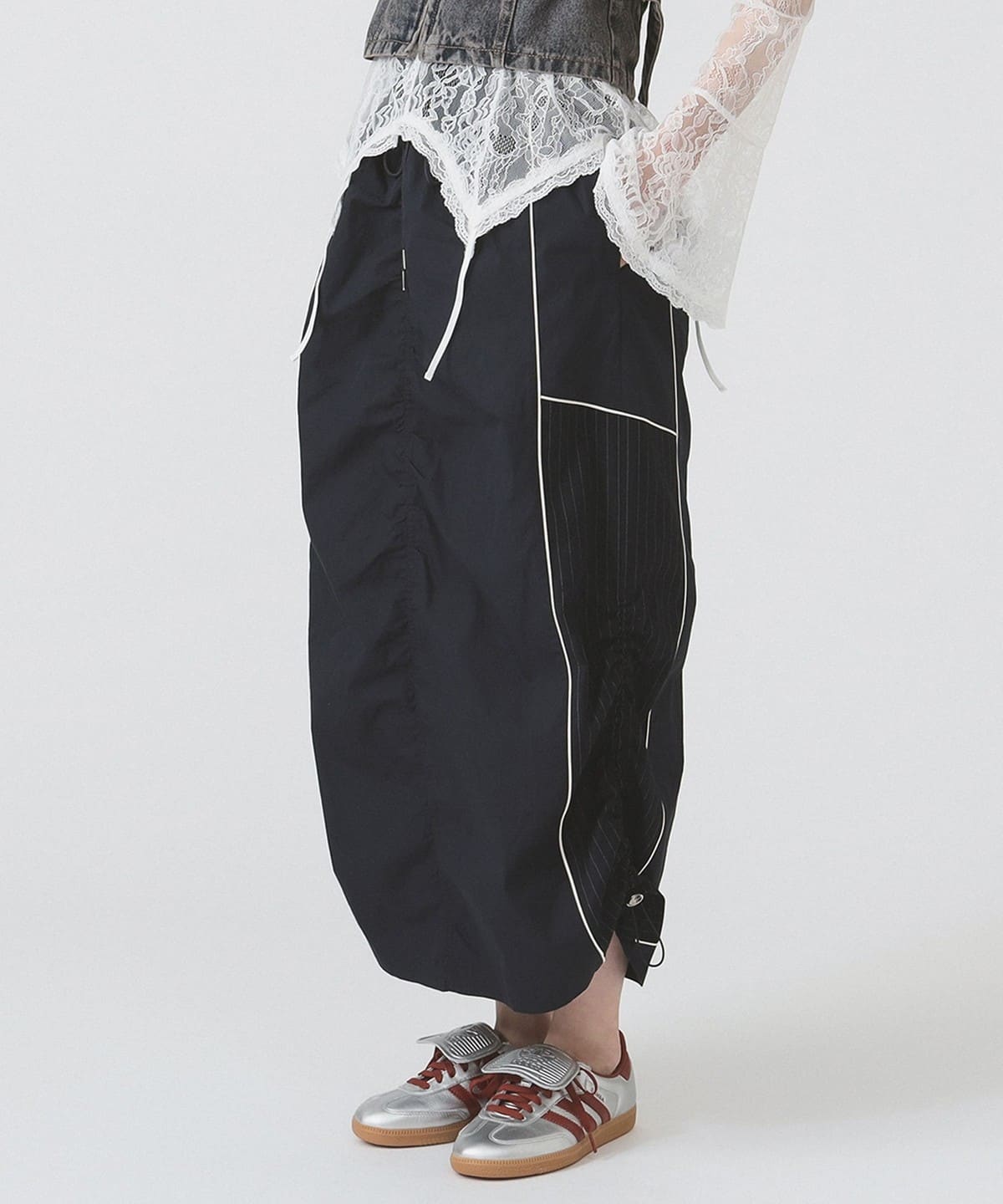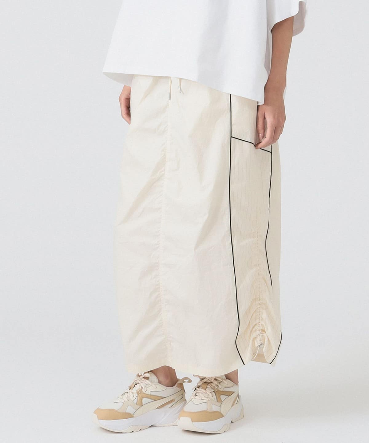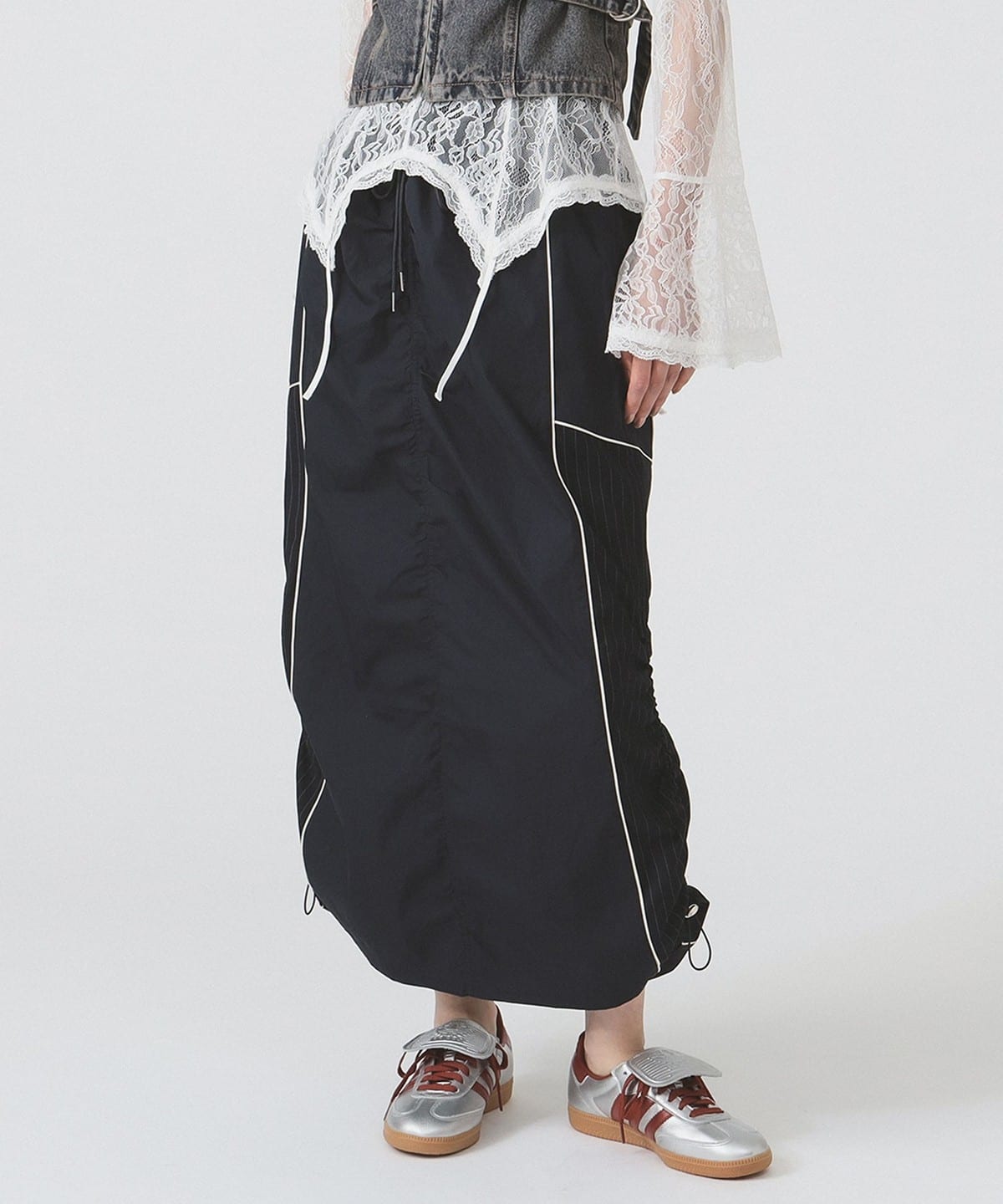 사이드에 스트라이프 배색을 더해 입체적인 포인트를 준 롱스커트입니다.