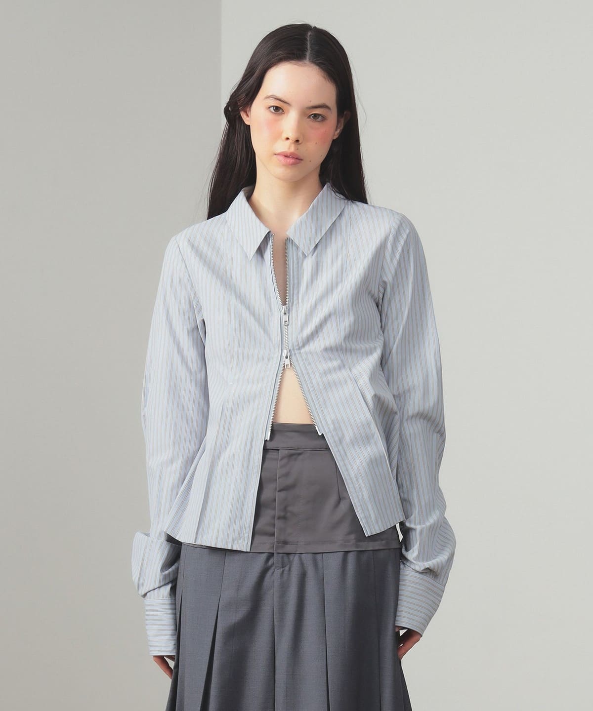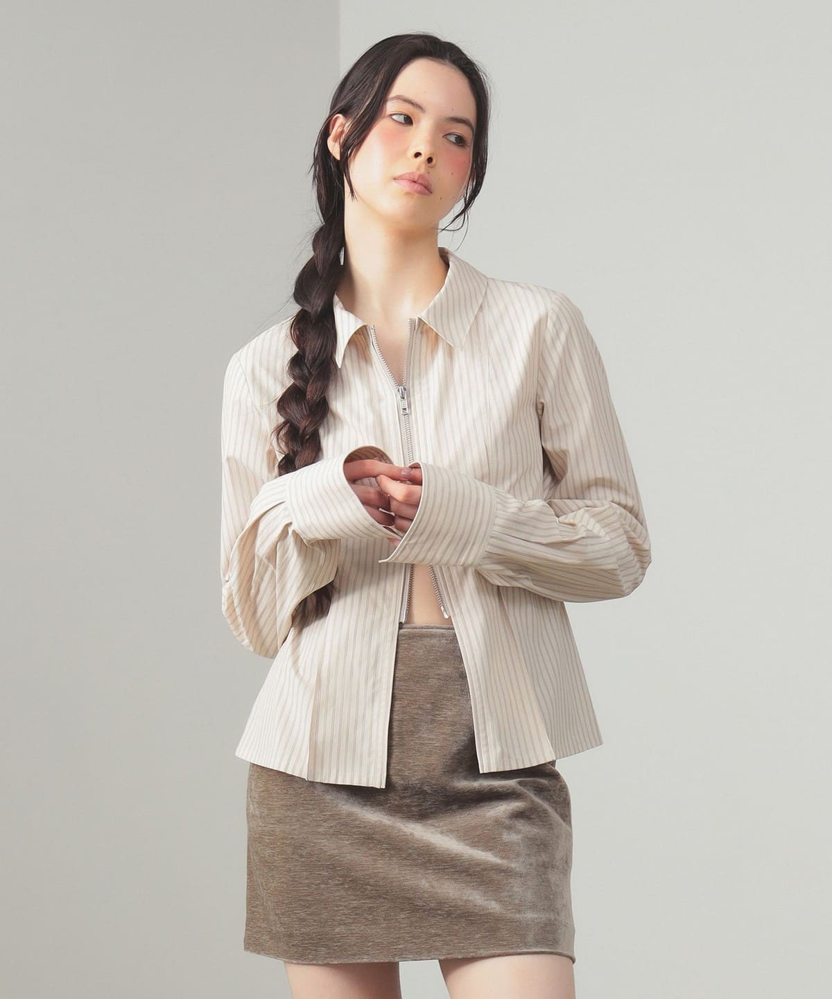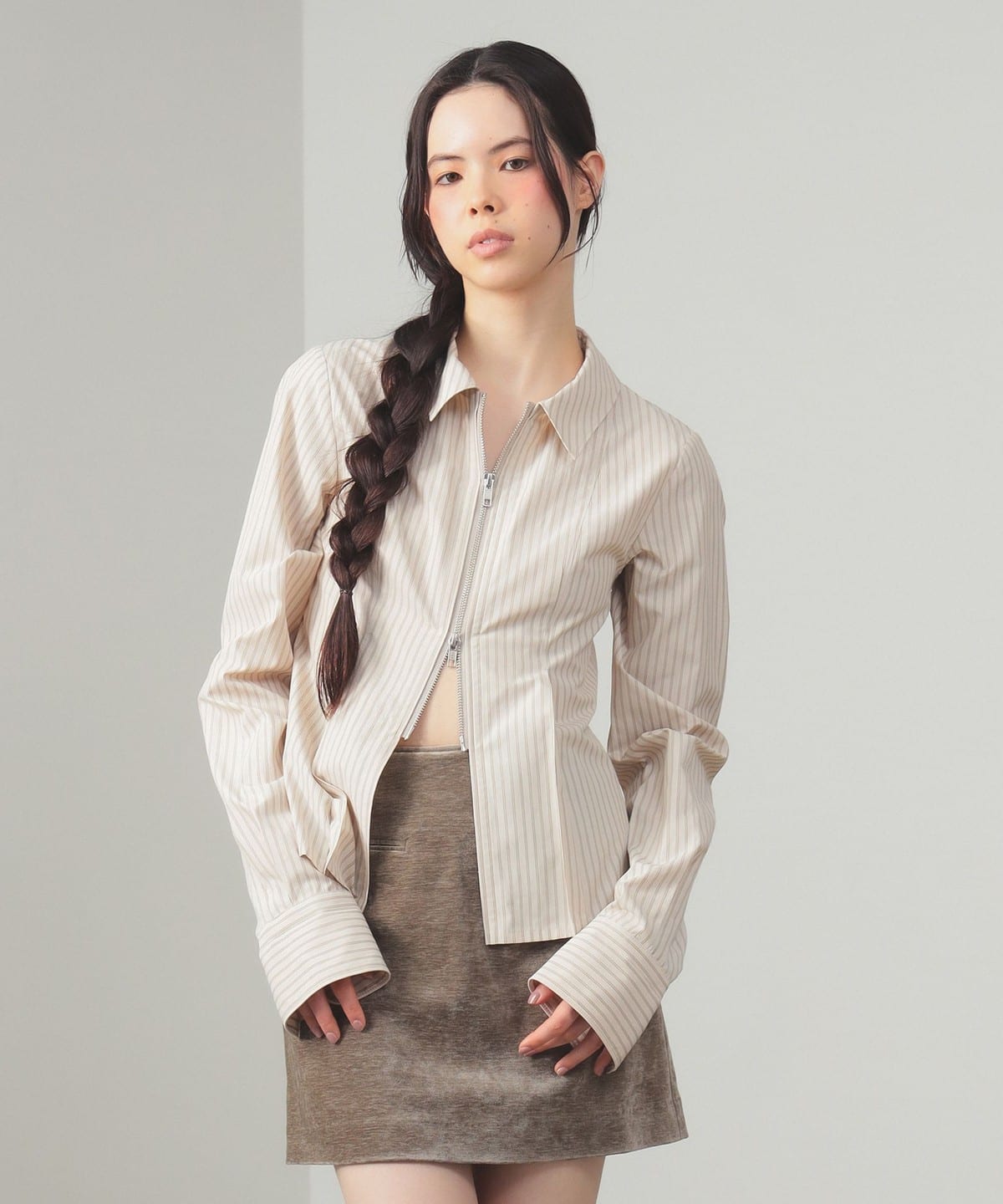 허리 라인을 살짝 조여주는 실루엣과 길고 슬림한 소매 디자인이 특징인 셔츠입니다.