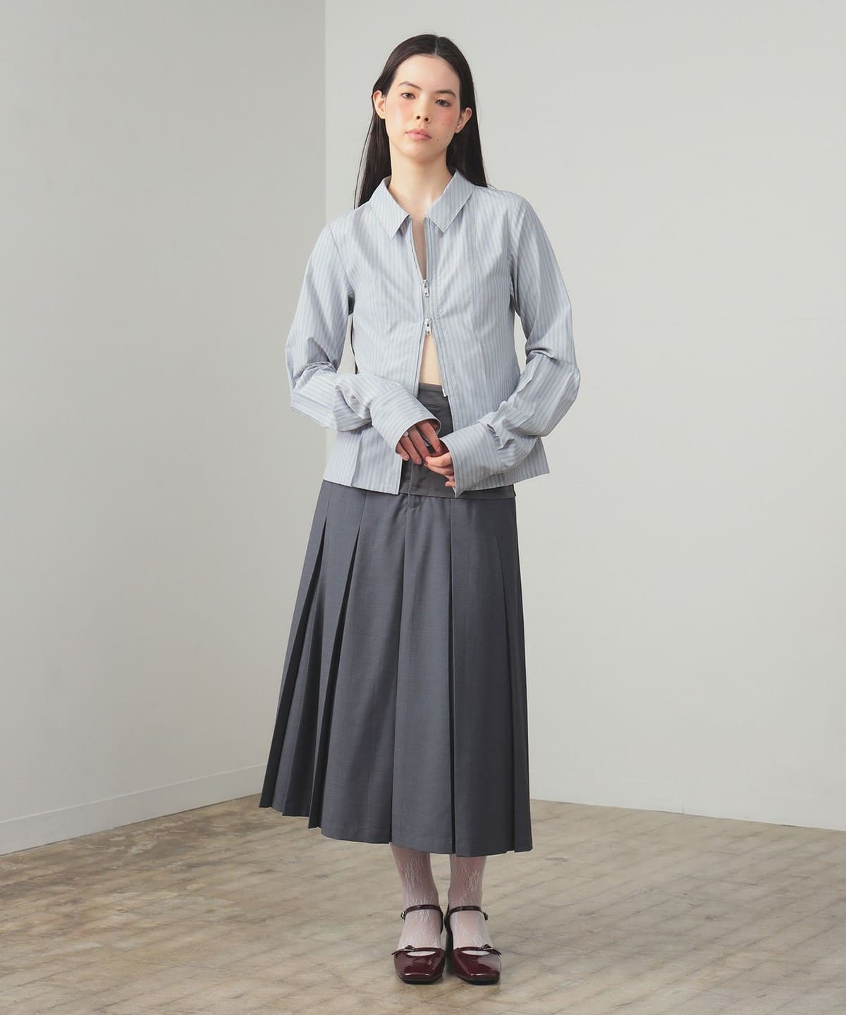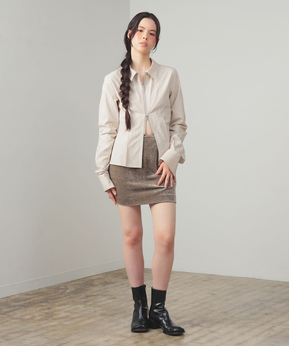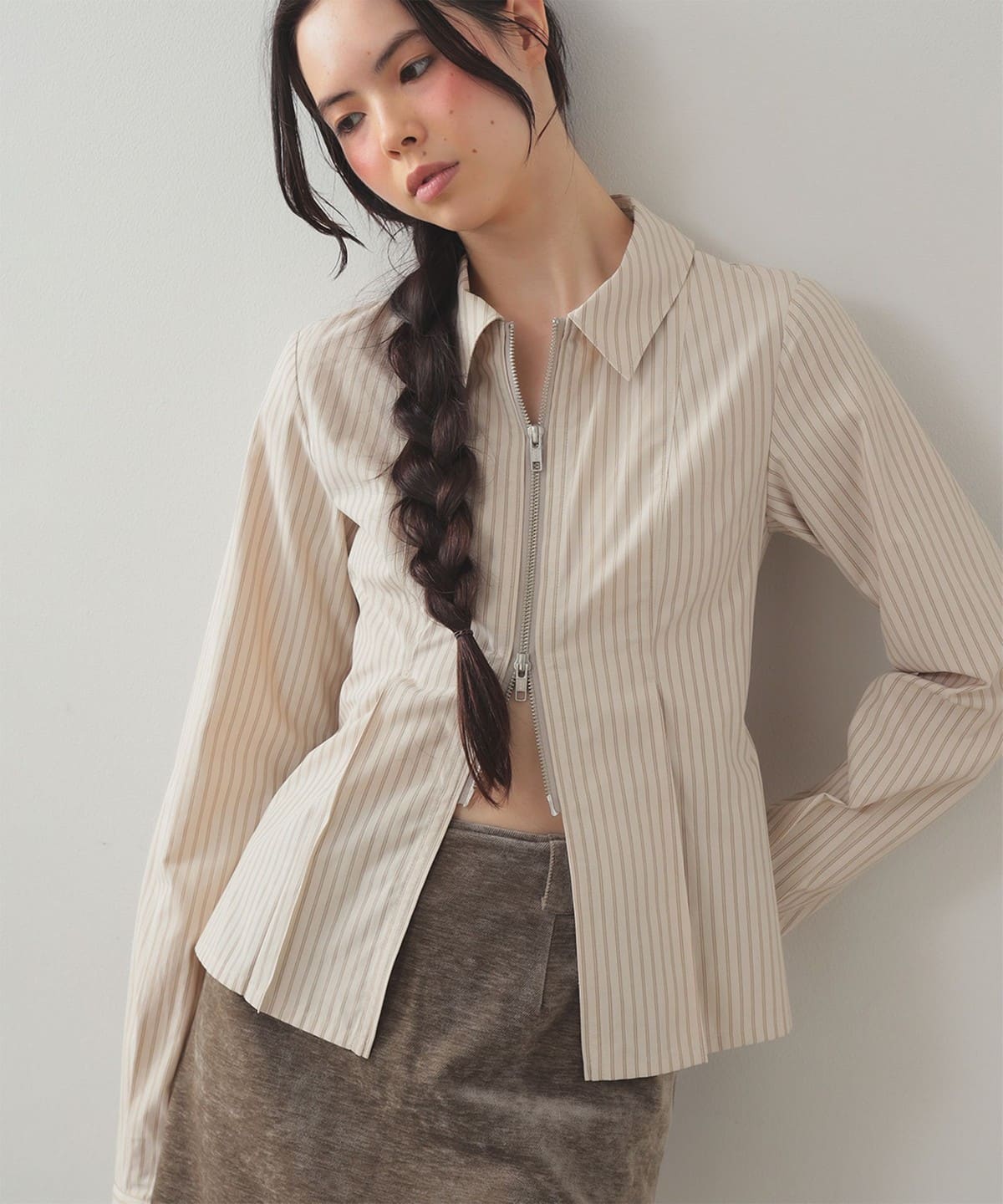 허리 라인을 살짝 조여주는 실루엣과 길고 슬림한 소매 디자인이 특징인 셔츠입니다.