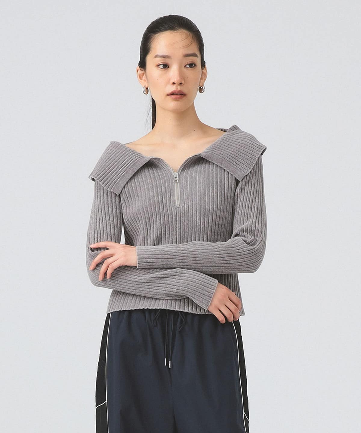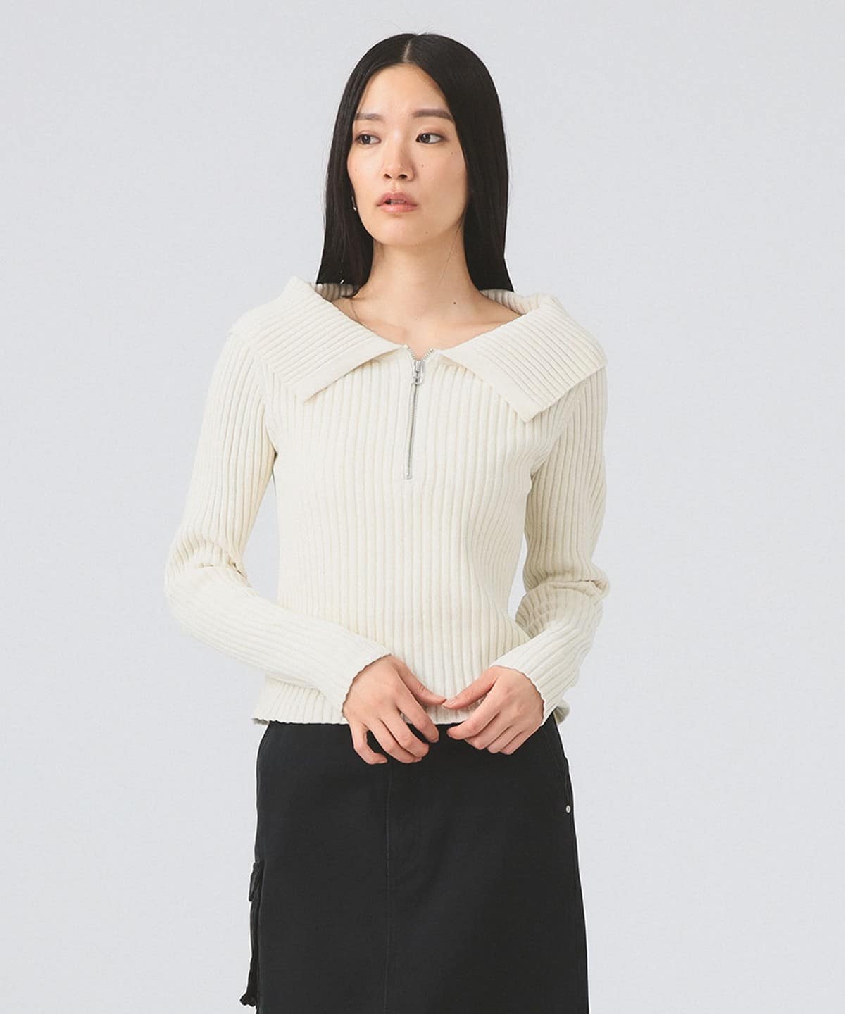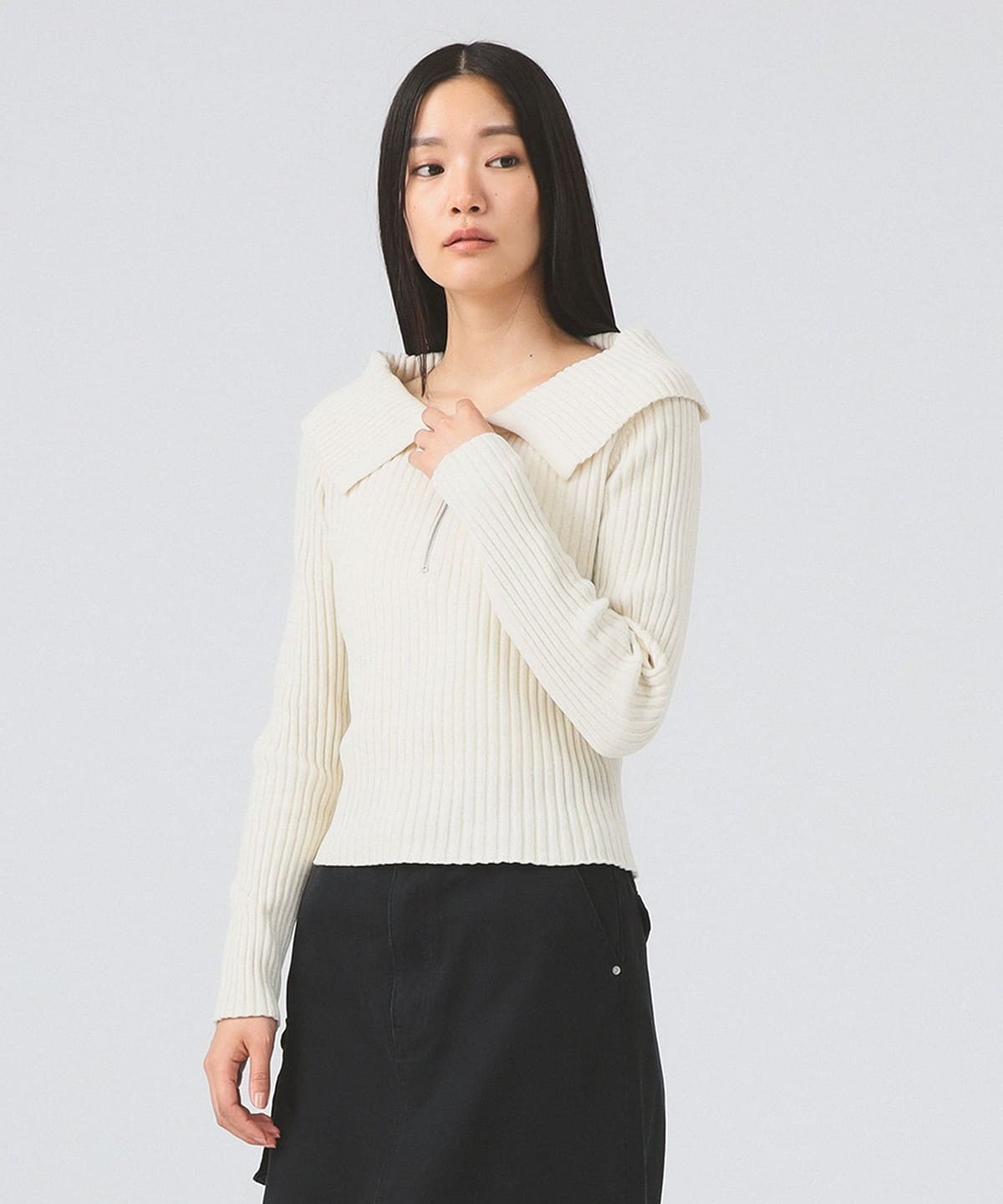 넓은 칼라와 쇄골라인을 아름답게 드러내는 네크라인이 매력적인 니트입니다. 하프 지퍼 디자인으로 오픈 정도에 따라 다양한 스타일링을 즐길 수 있습니다. 적당히 몸에 핏되는 컴팩트한 실루엣입니다.