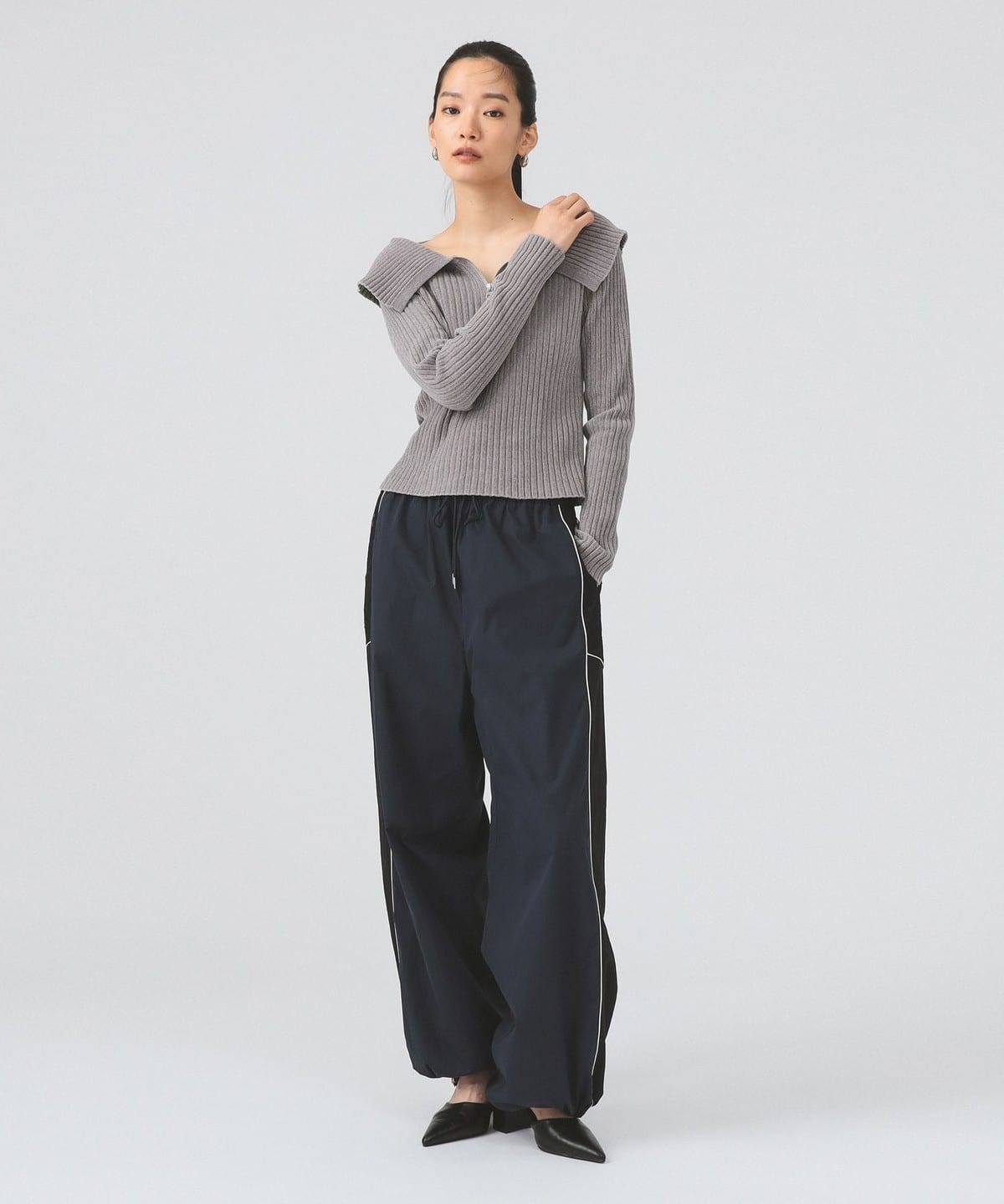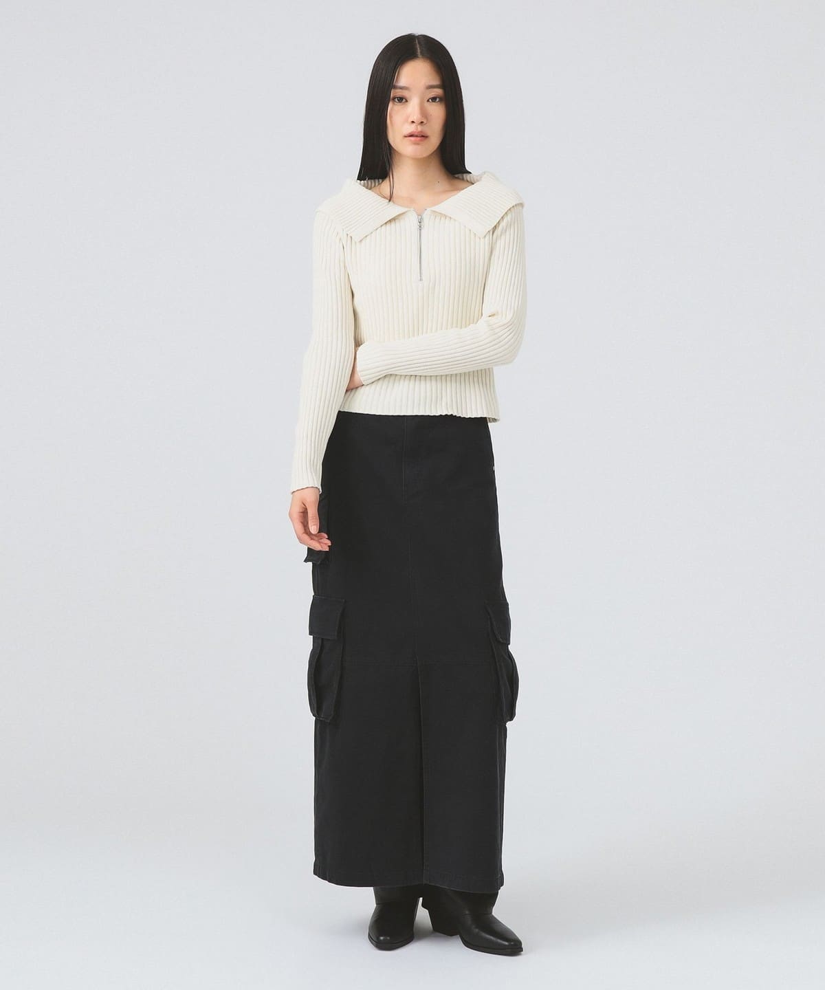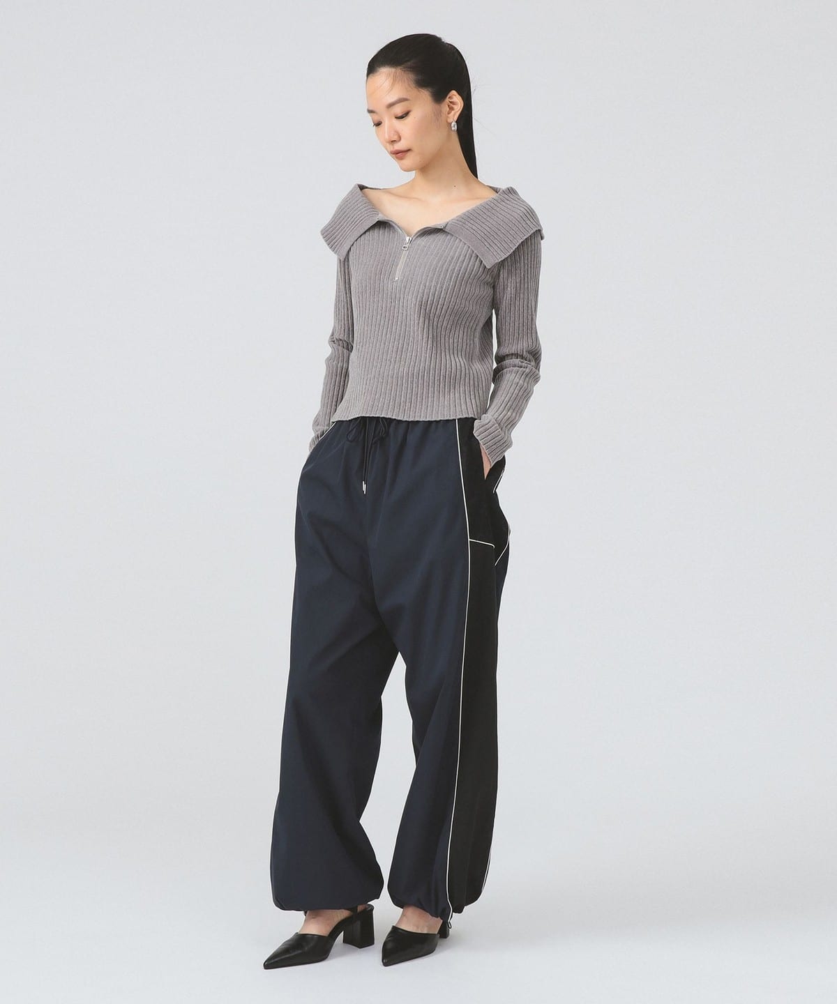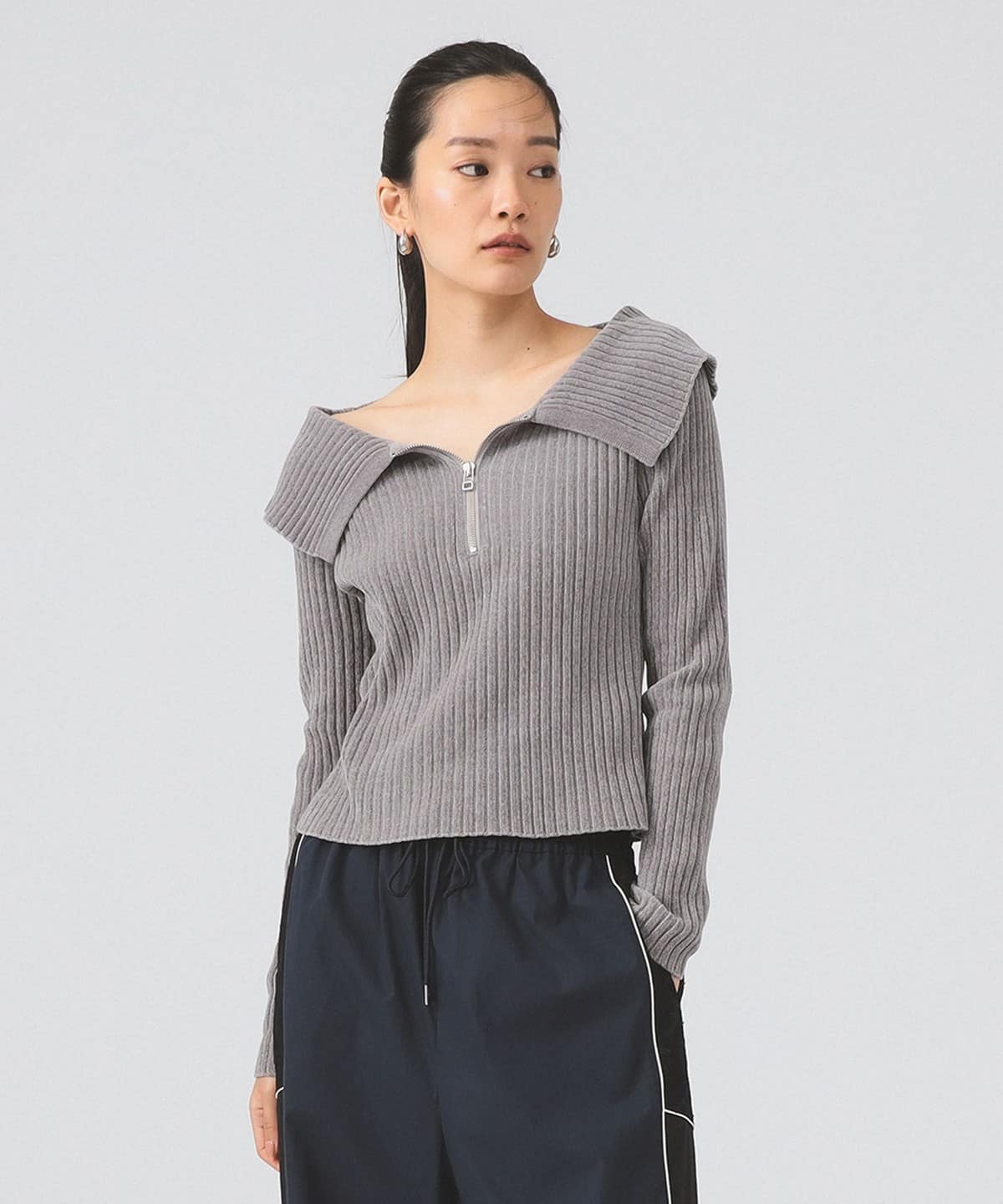 넓은 칼라와 쇄골라인을 아름답게 드러내는 네크라인이 매력적인 니트입니다. 하프 지퍼 디자인으로 오픈 정도에 따라 다양한 스타일링을 즐길 수 있습니다. 적당히 몸에 핏되는 컴팩트한 실루엣입니다.