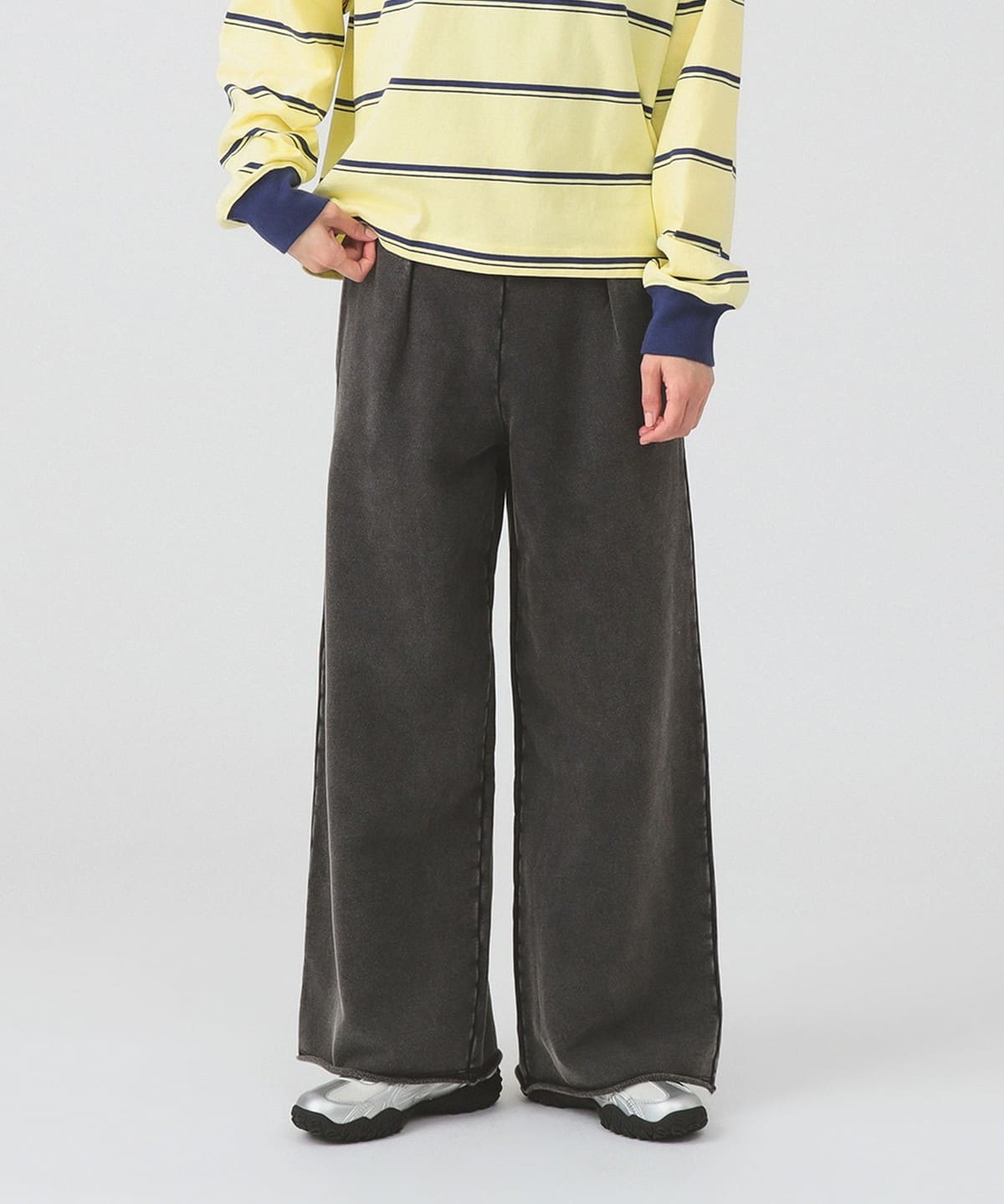 유즈드 감성이 살아있는 빈티지 워싱 처리된 기모 팬츠. 허리끈은 안쪽에 배치되어 있습니다.