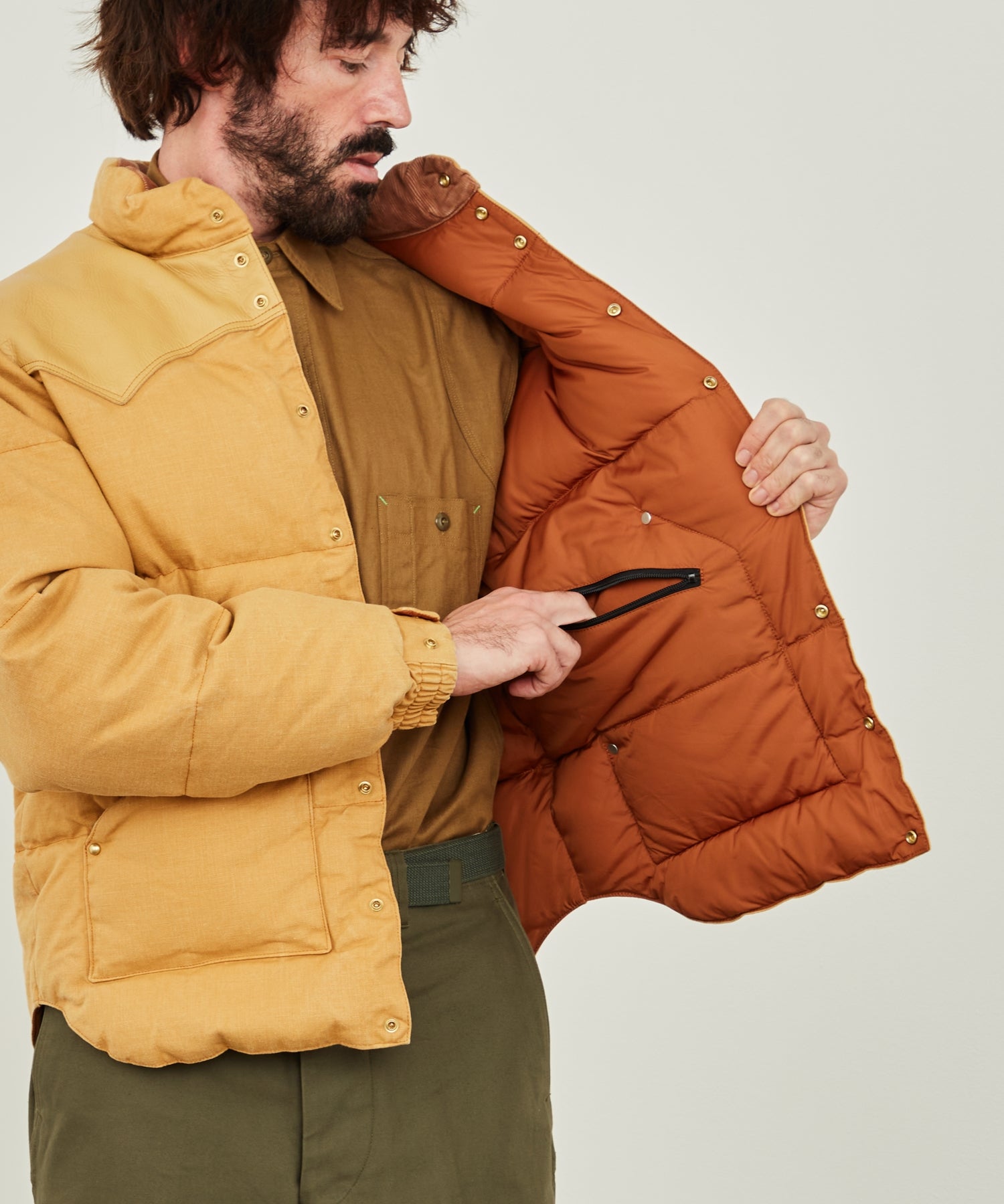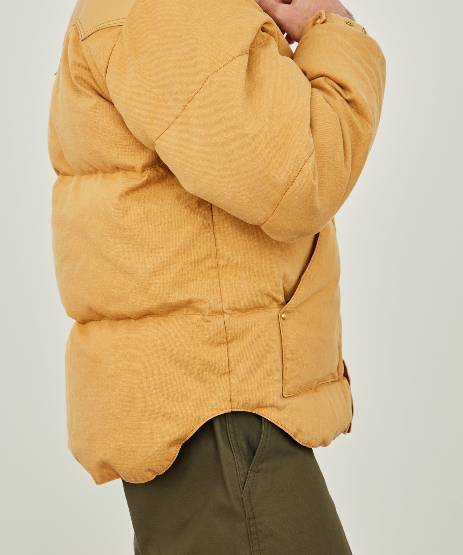 안감은 70 데니어 오리지널 나일론 태피터를 사용했으며 충전재는 다운 90% 깃털 10%의의 700FP으로 보온성, 가벼움이 특징입니다. 요크의 가죽에는 워셔블 레더를 사용하여 가죽 본래의 자연스러운 감촉을 남기면서 내구성도 높은 가죽으로되어 있습니다.