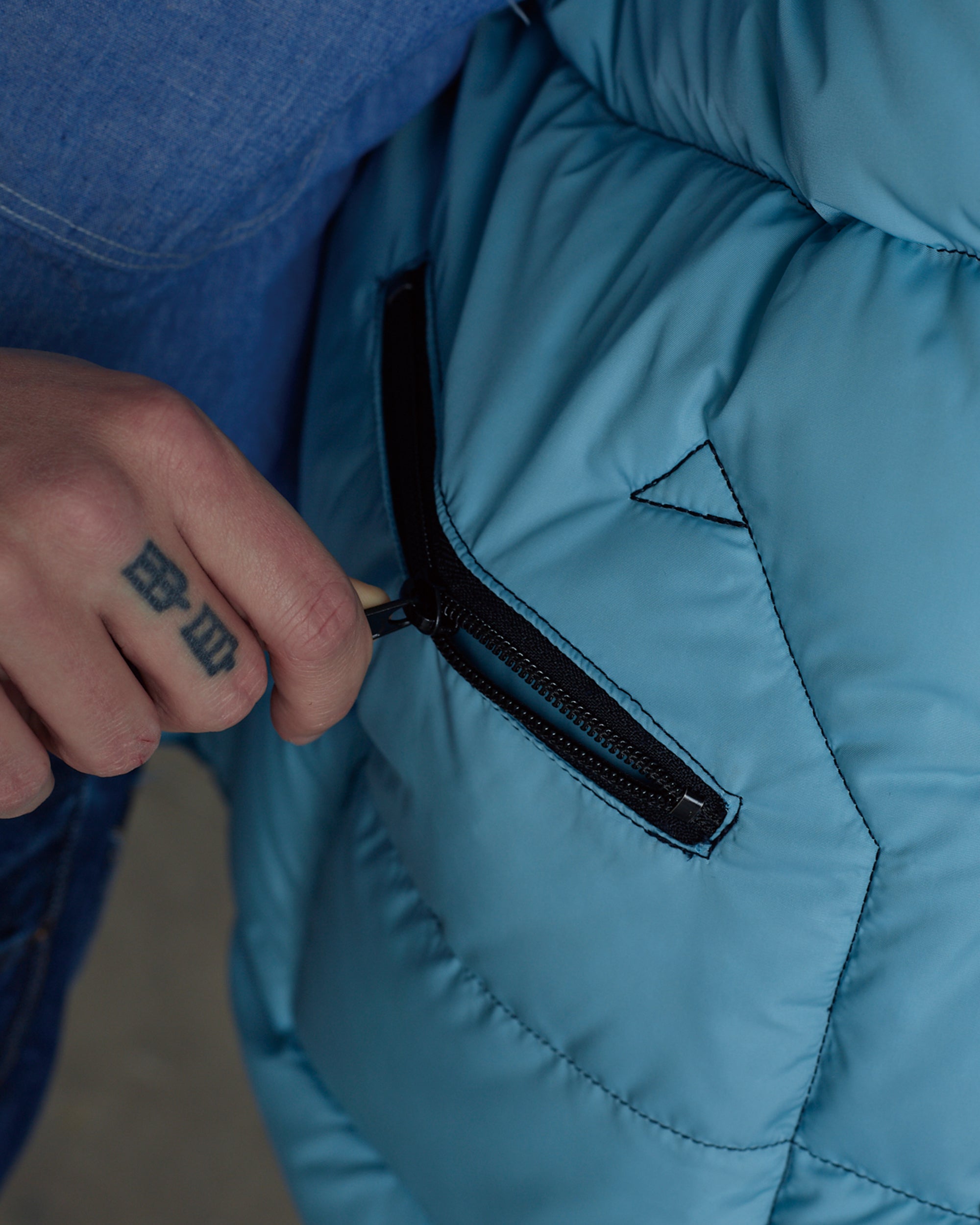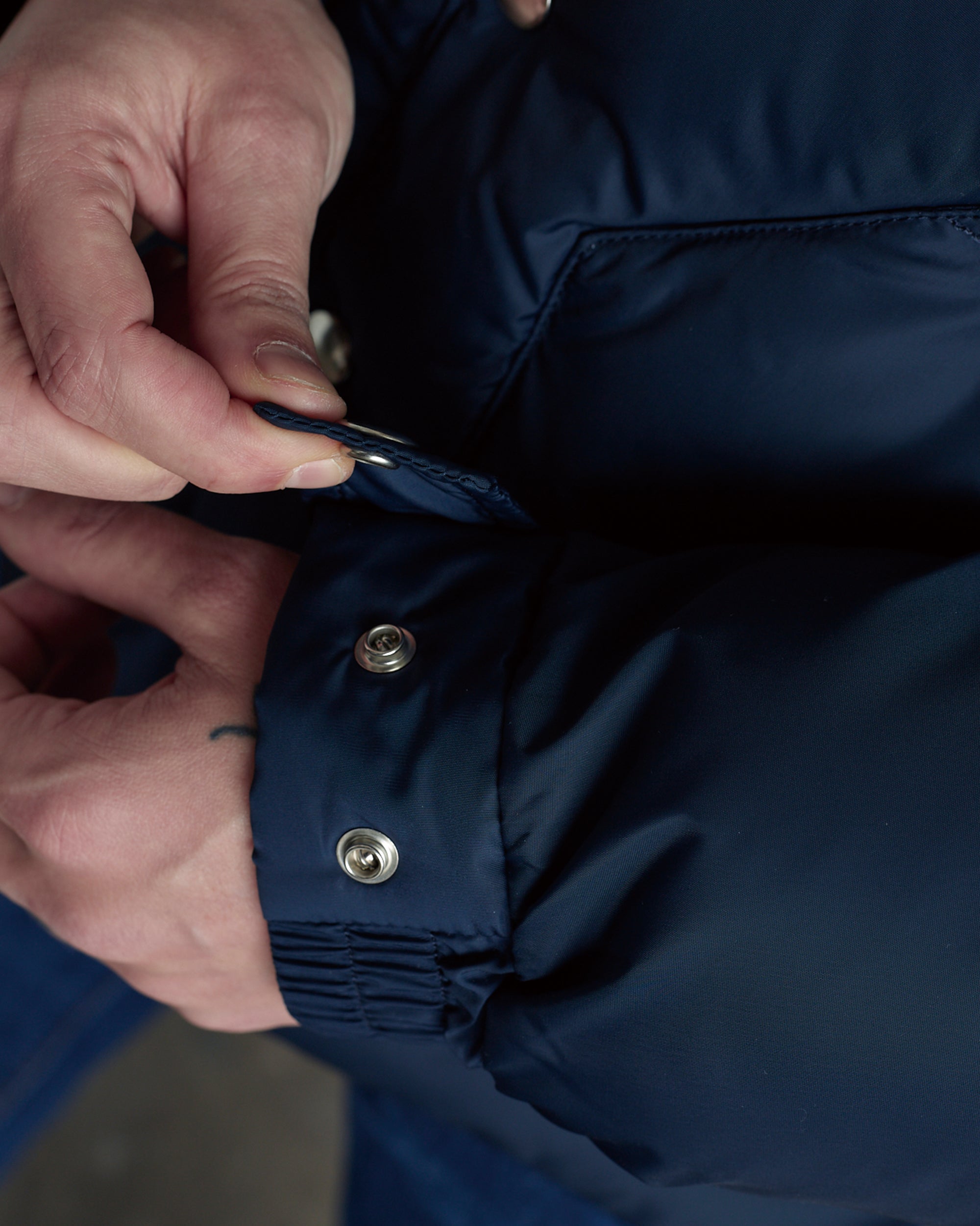 겉감과 안감에는 RMFC가 독자적으로 개발한 70데니어 나일론 타프타 를 사용했습니다. 가볍고 내구성이 뛰어나며, 다운팩 기능을 갖춘 삼중 구조 로 높은 보온성을 발휘합니다.
