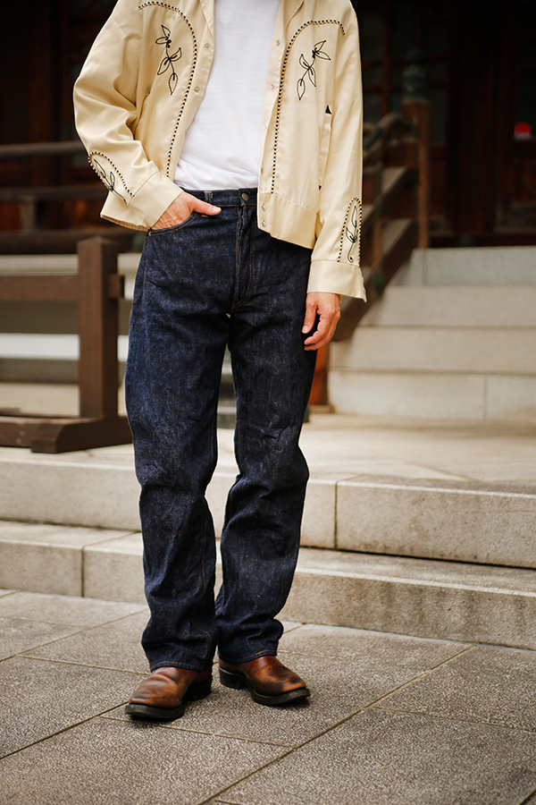 1950년대 5포켓 데님을 복각한 모델입니다. 허리에서 밑단으로 자연스럽게 이어지는 곡선형 테이퍼 라인은 당시를 대표하는 스트레이트 실루엣을 재현합니다.