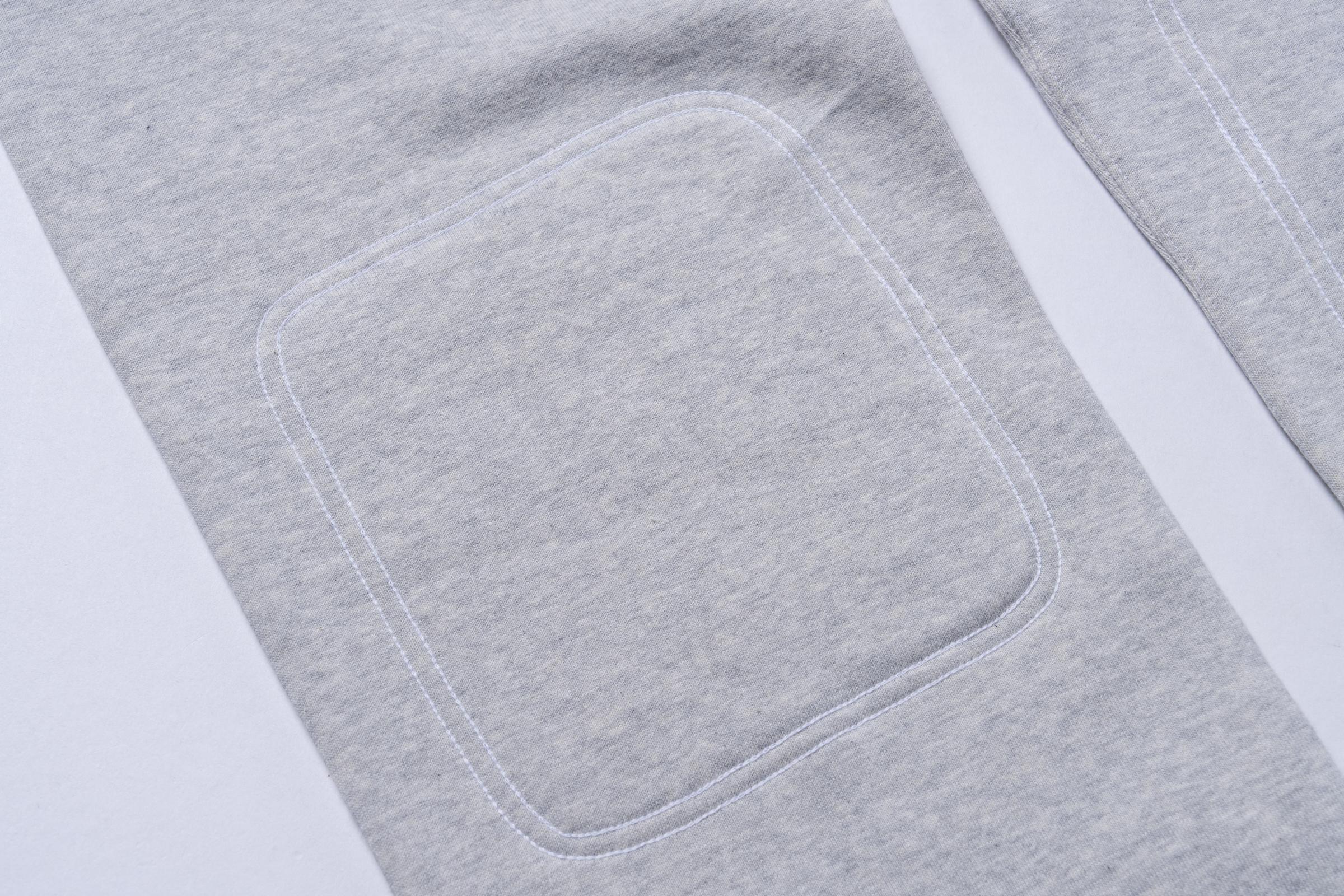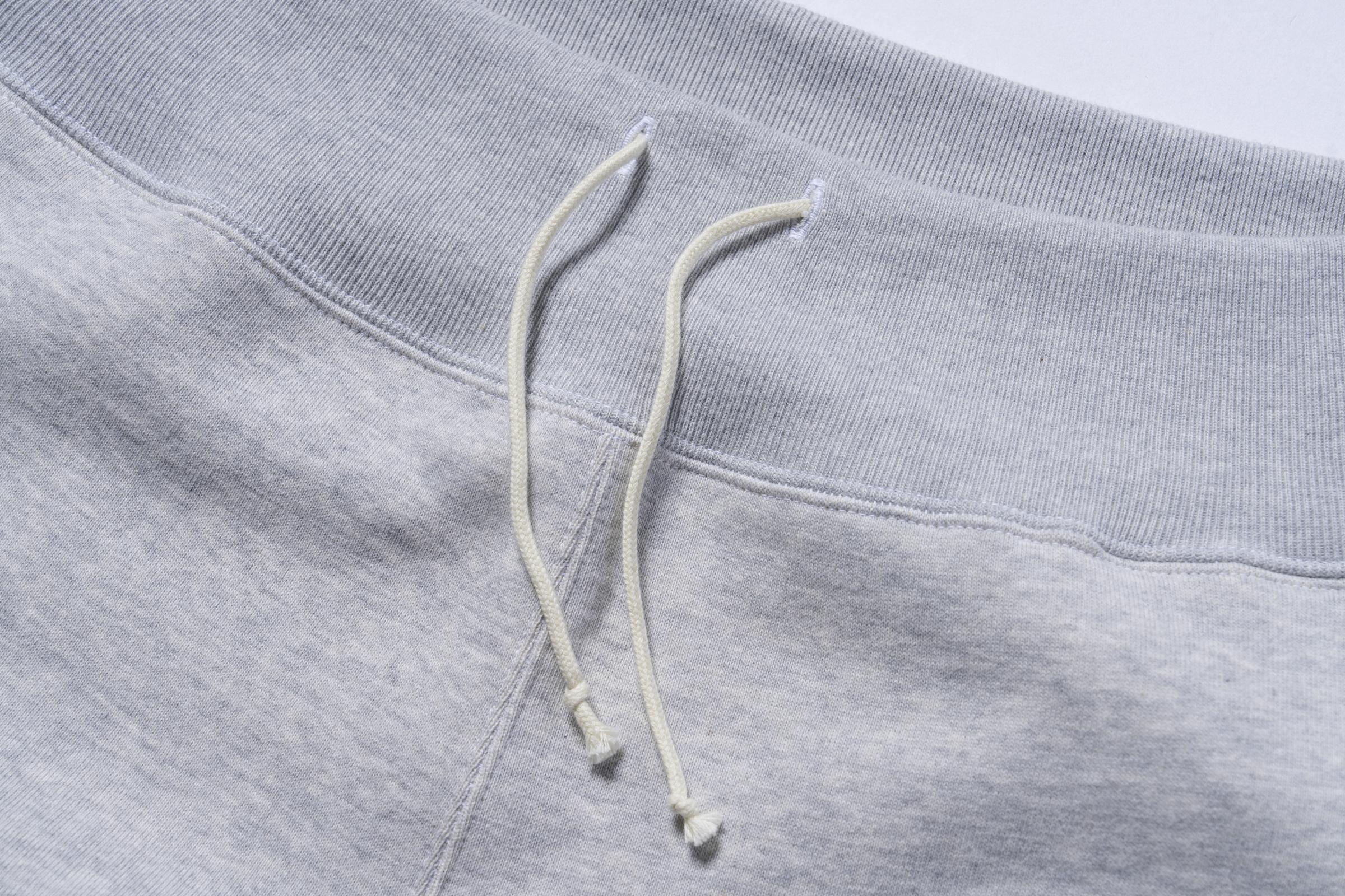 무릎 패치가 달린 이 스웨트팬츠는 1940년대 미 해군에서 체력 단련 및 훈련용 운동복으로 사용되었던 모델을 기반으로 하고 있습니다. 무릎 보강 부분은 원단을 이중으로 덧대어 안쪽에서 2바늘 체인스티치로 봉제되었습니다. 밑단의 스핀들홀 위치의 미세한 어긋남이나 홀 안쪽 보강 원단까지도 당시의 디테일을 충실히 재현했습니다.