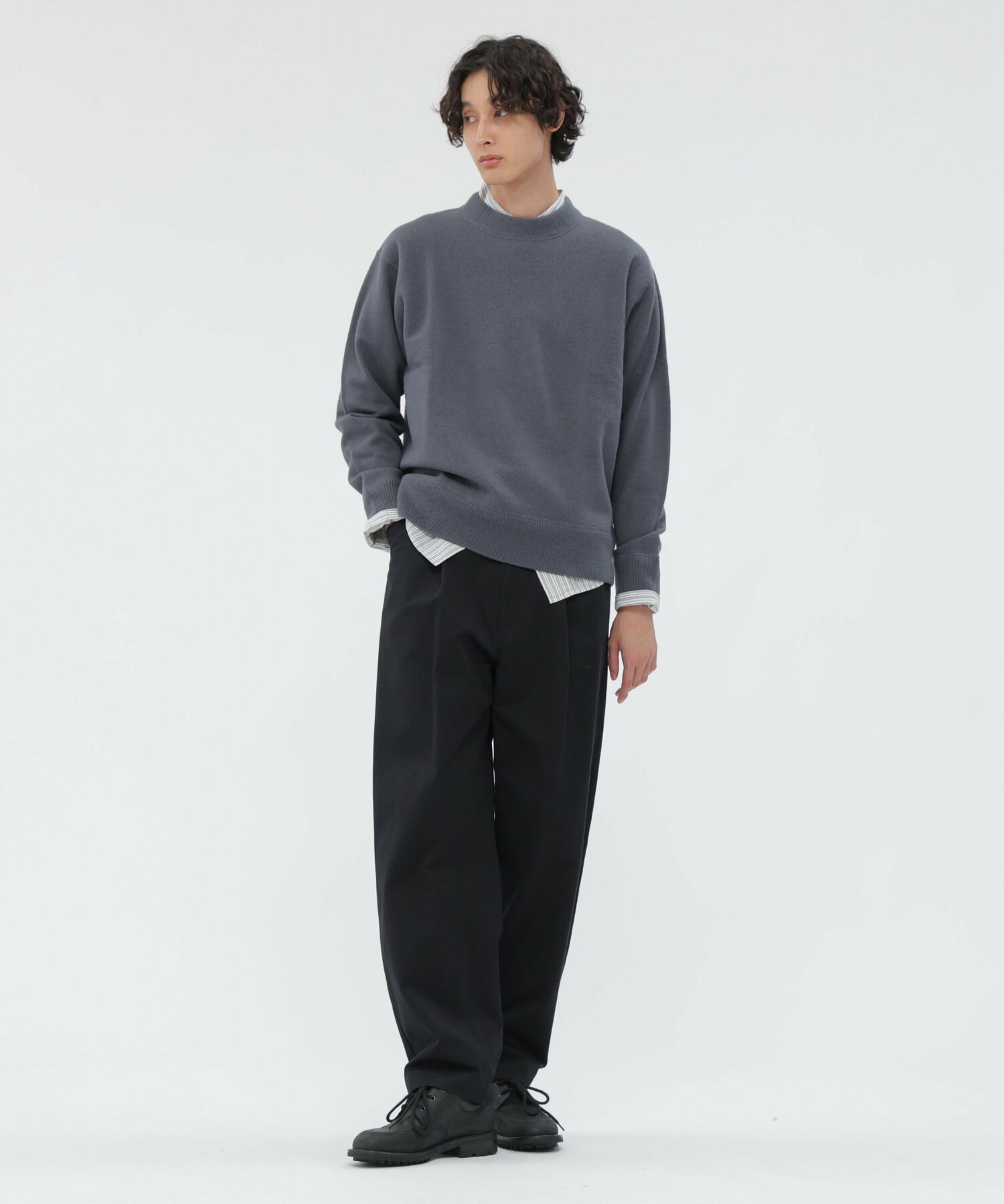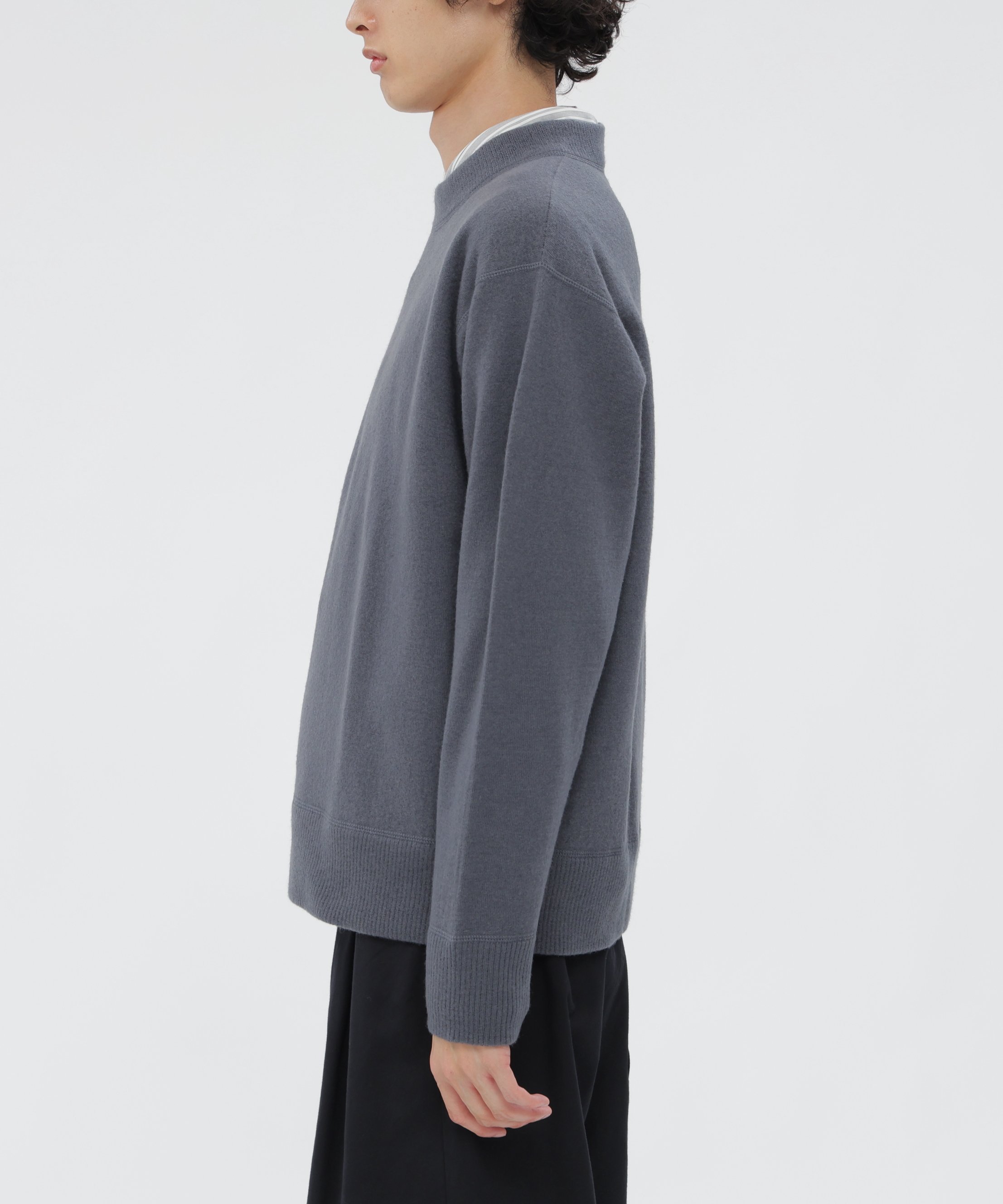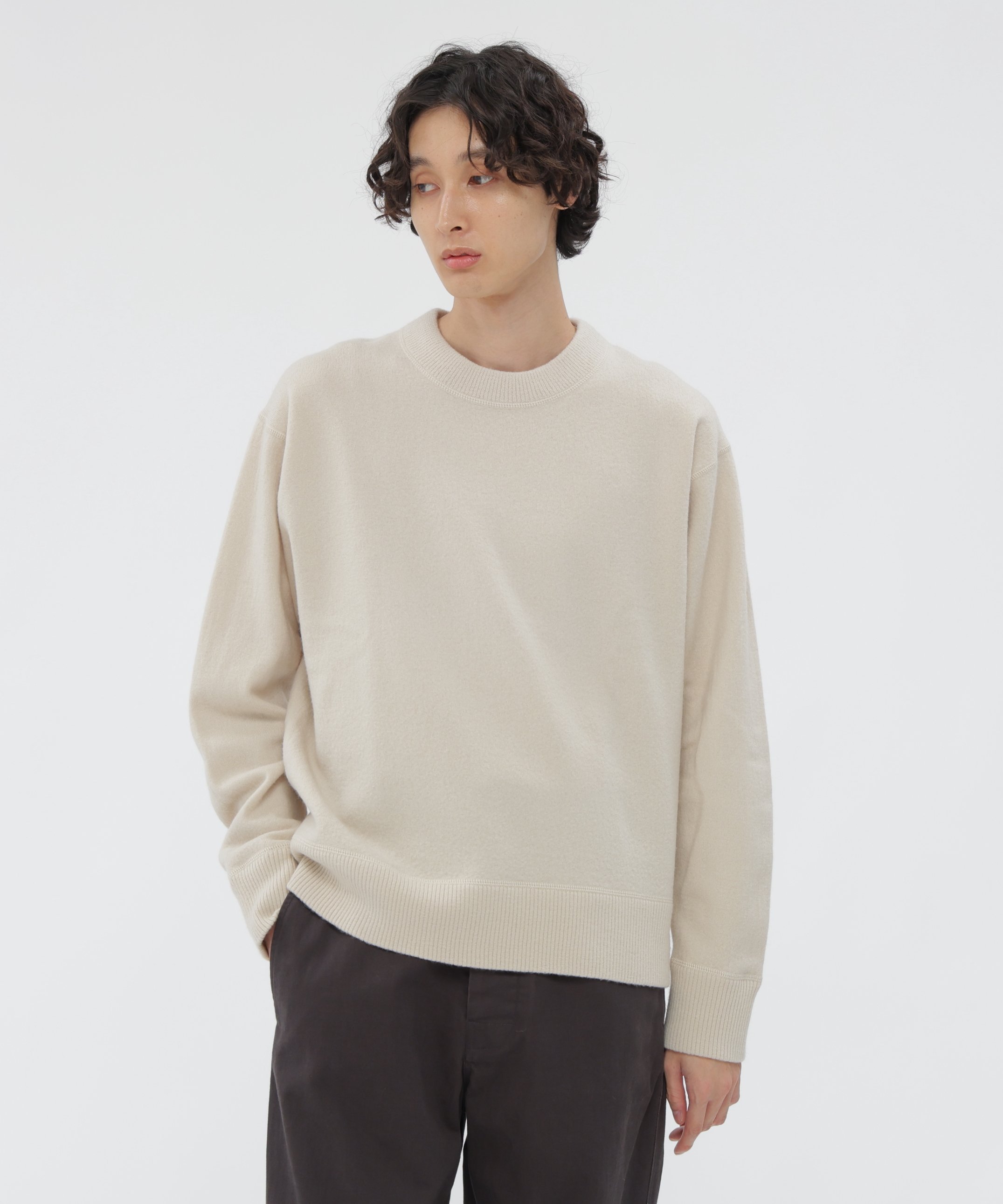 호주산 메리노울을 사용해 축융 가공으로 완성한 니트 스웨터입니다. 양모 특유의 컬 모양 섬유 구조를 살려, 얇은 멜튼 원단처럼 보이면서도 가볍고 따뜻한 착용감을 제공합니다.