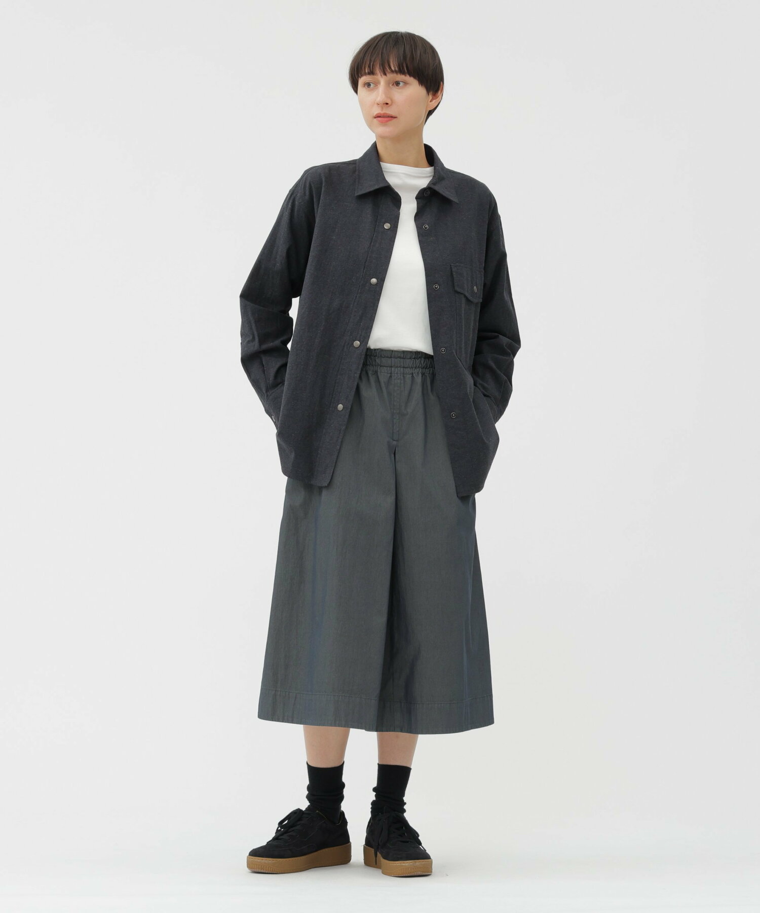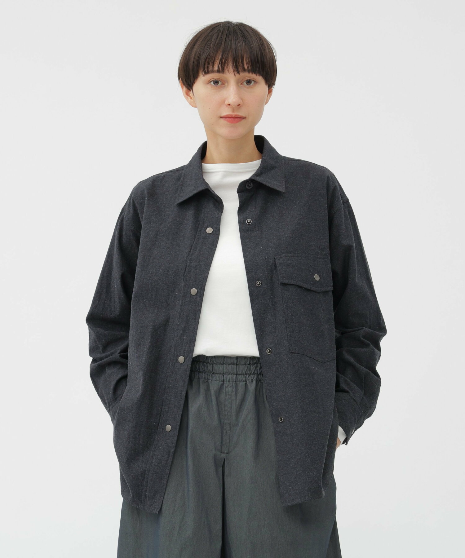촘촘하게 짜여진 탄탄한 조직감 덕분에, 셔츠이면서도 아우터처럼 걸칠 수 있는 묵직한 착용감을 자랑합니다. 스냅 단추로 구성된 전면 여밈과 플랩 포켓이 웨스턴 셔츠 느낌을 주며, 칼라 부분의 너트 버튼, 등판 요크, 이중 소매 구조 등은 워크웨어 감성을 더해줍니다.