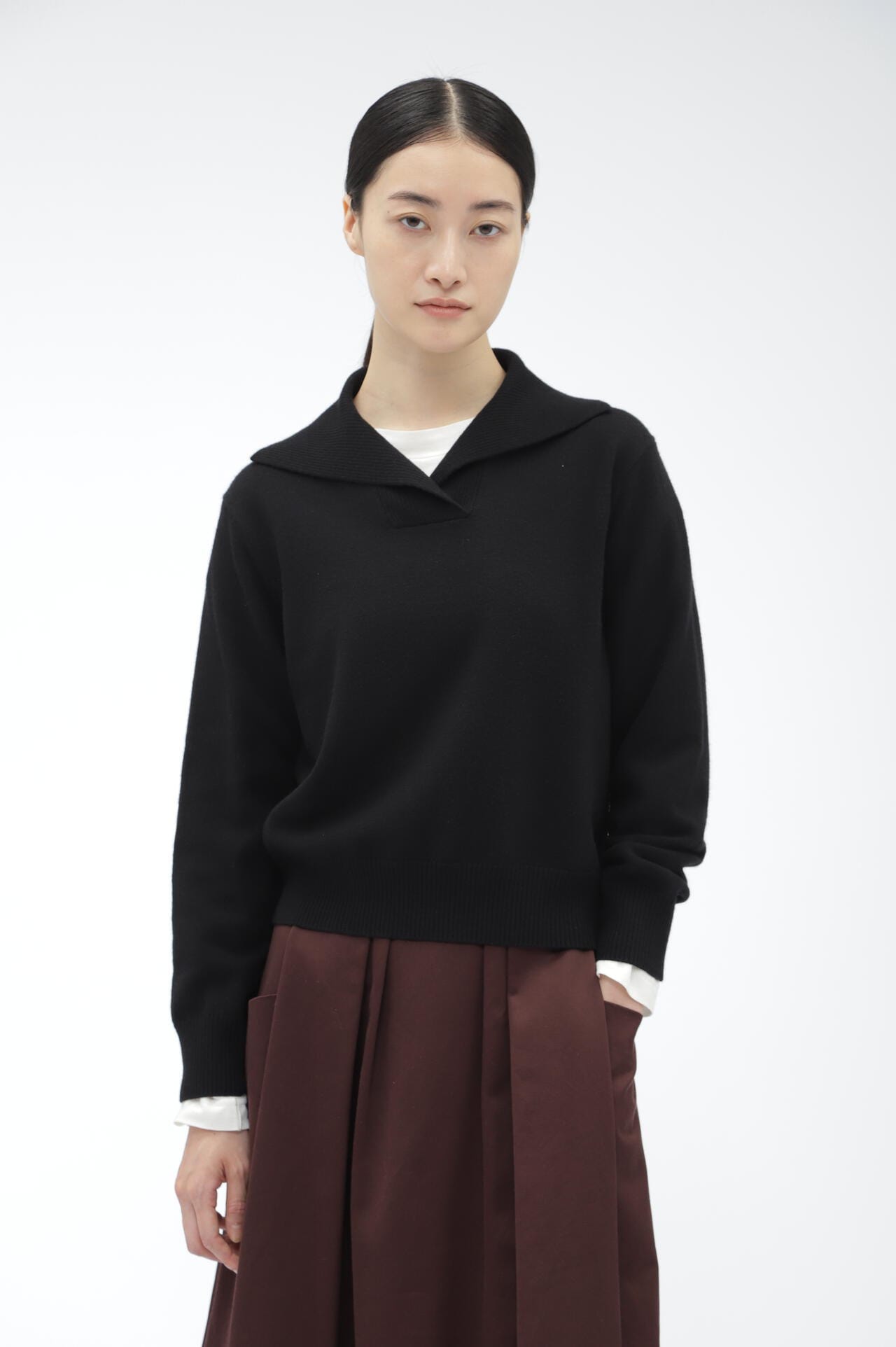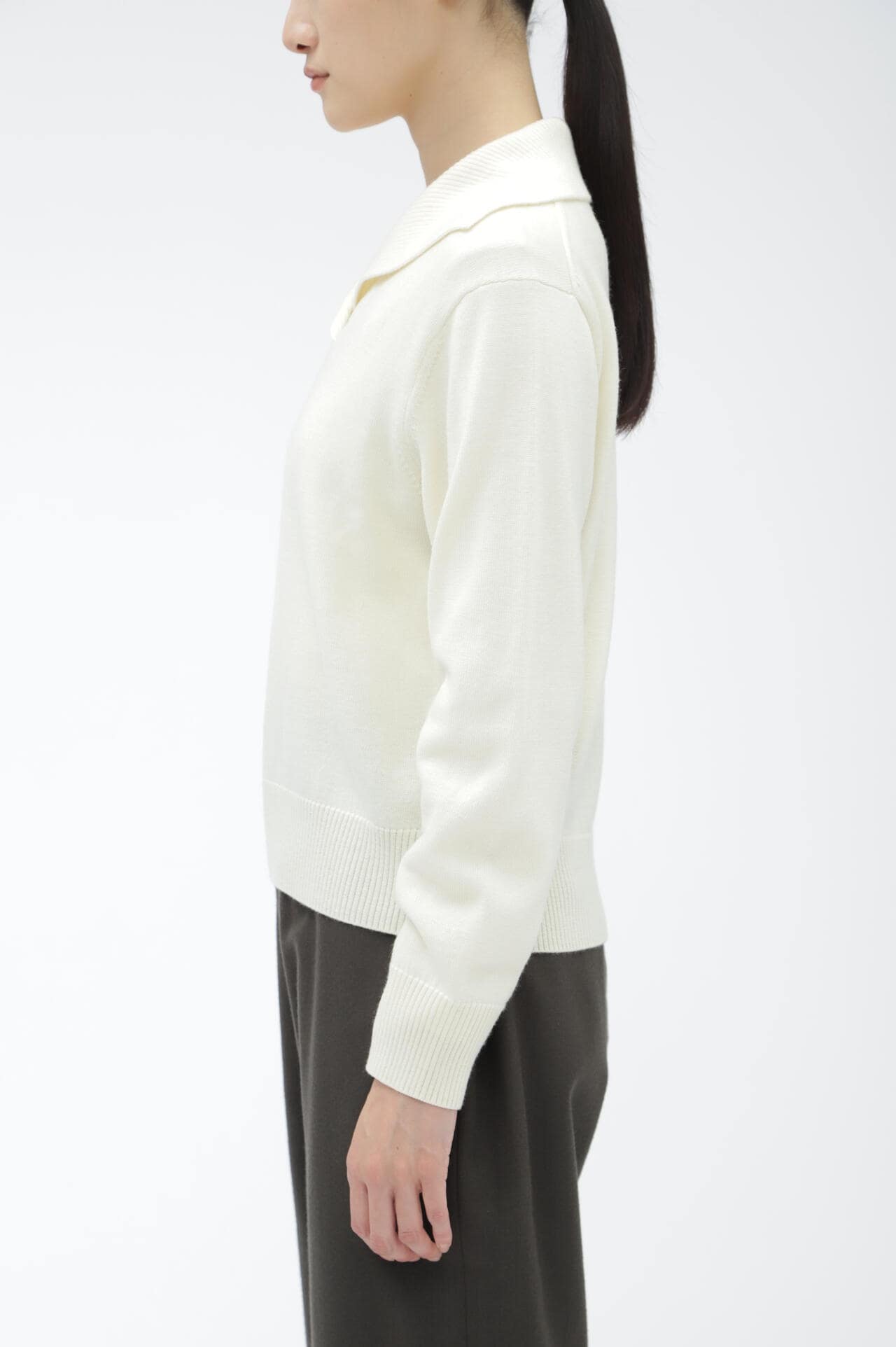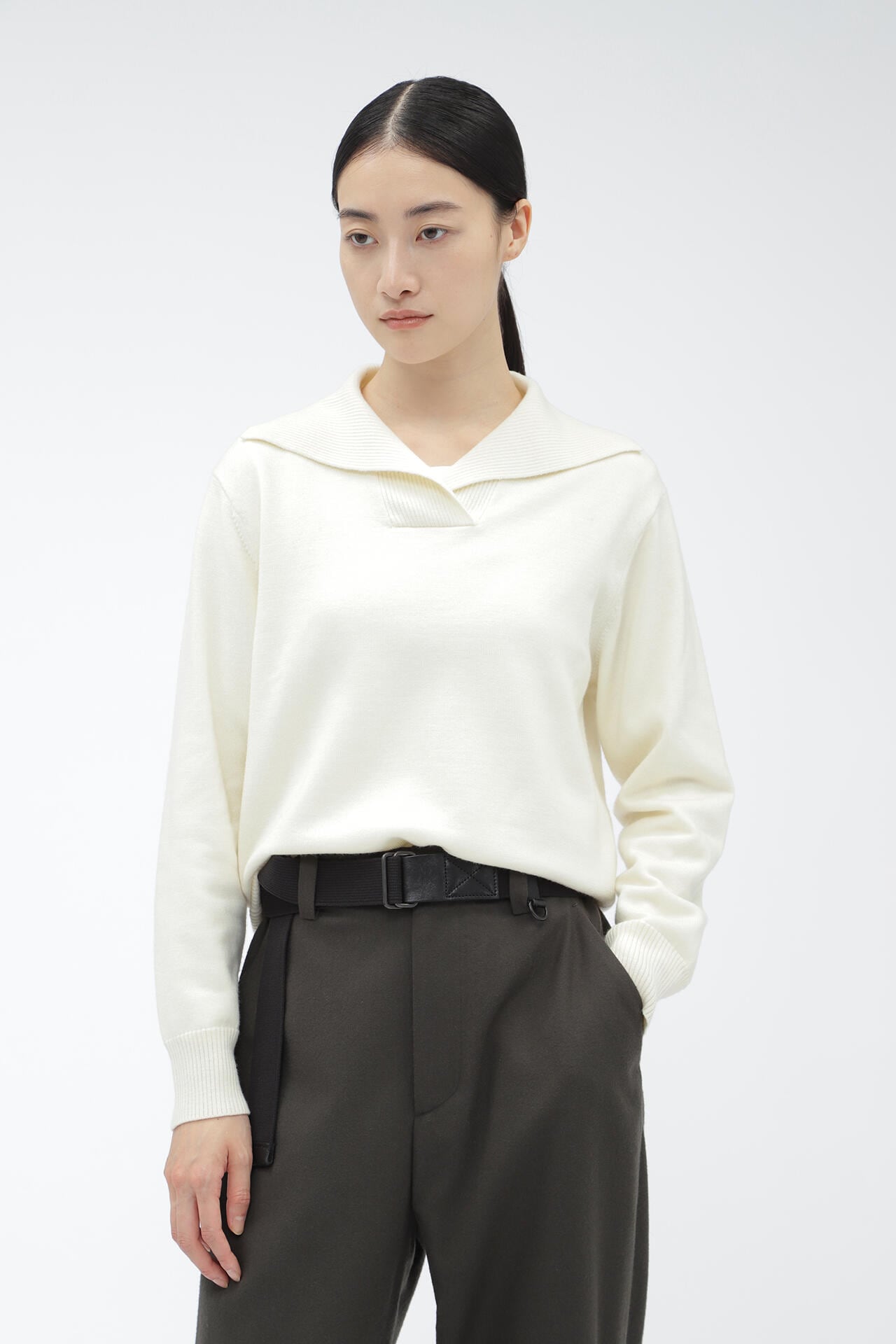울 소재의 세일러 칼라 니트. 오픈 넥 디테일이 스포티한 인상을 줍니다.