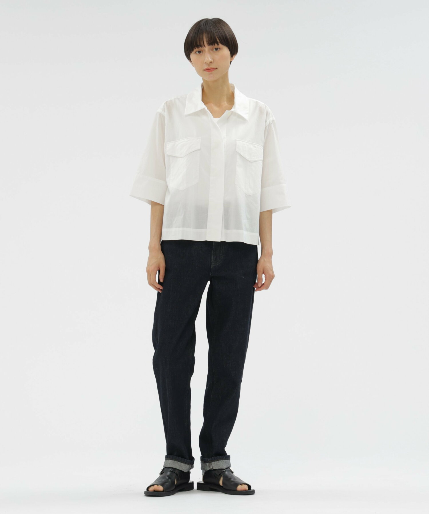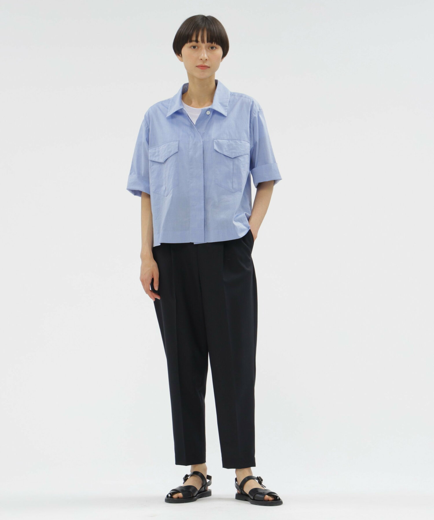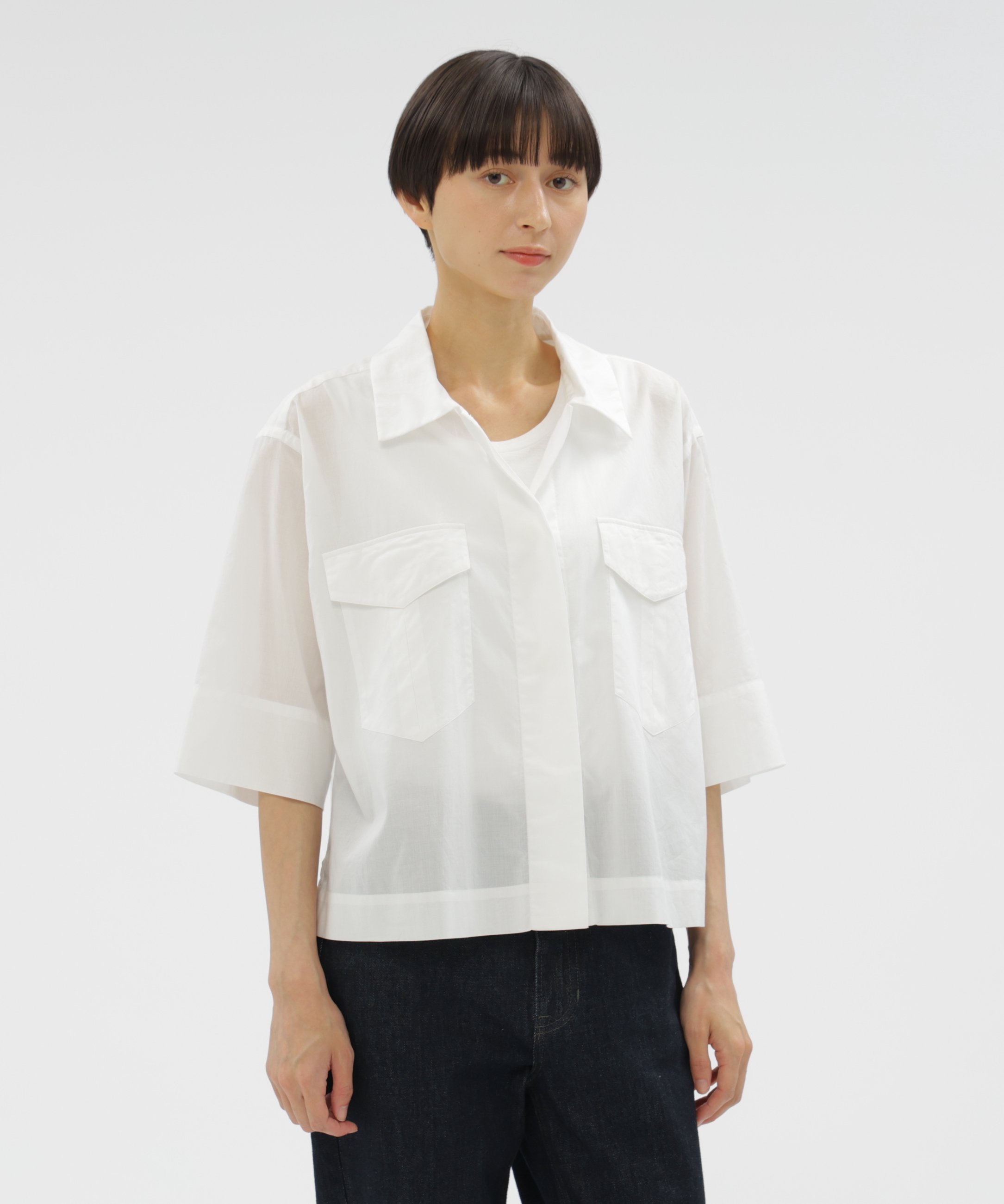 가슴 부분의 더블 포켓이 적당한 포인트가 되며, 소매를 롤업하거나 앞을 열어 아우터처럼 걸쳐 입는 등 가볍게 스타일링하기에 좋은 아이템입니다.