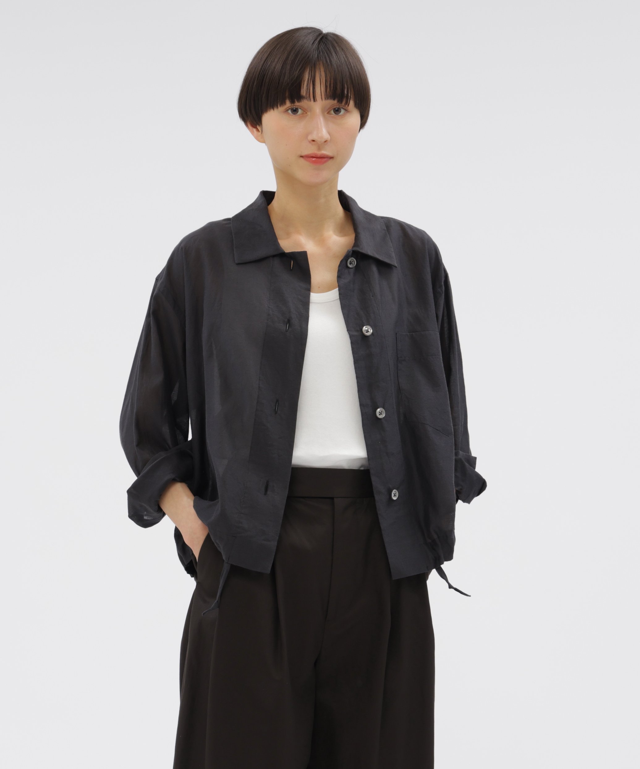 코튼과 실크를 섞어 직조한 얇고 은은한 광택감의 시어 셔츠입니다. 단사 코튼과 생사 실크의 조합으로 섬세하고 고급스러운 표면감을 표현했으며, 워싱 가공을 통해 내추럴하고 편안한 느낌을 더했습니다. 밑단에는 스트링을 넣어 셔링 연출이 가능하며, 두꺼운 앞단과 큼직한 버튼이 포인트로 들어가 있습니다. 셔츠 칼라의 중성적 느낌과 소재의 부드러움을 결합한 디자인입니다.