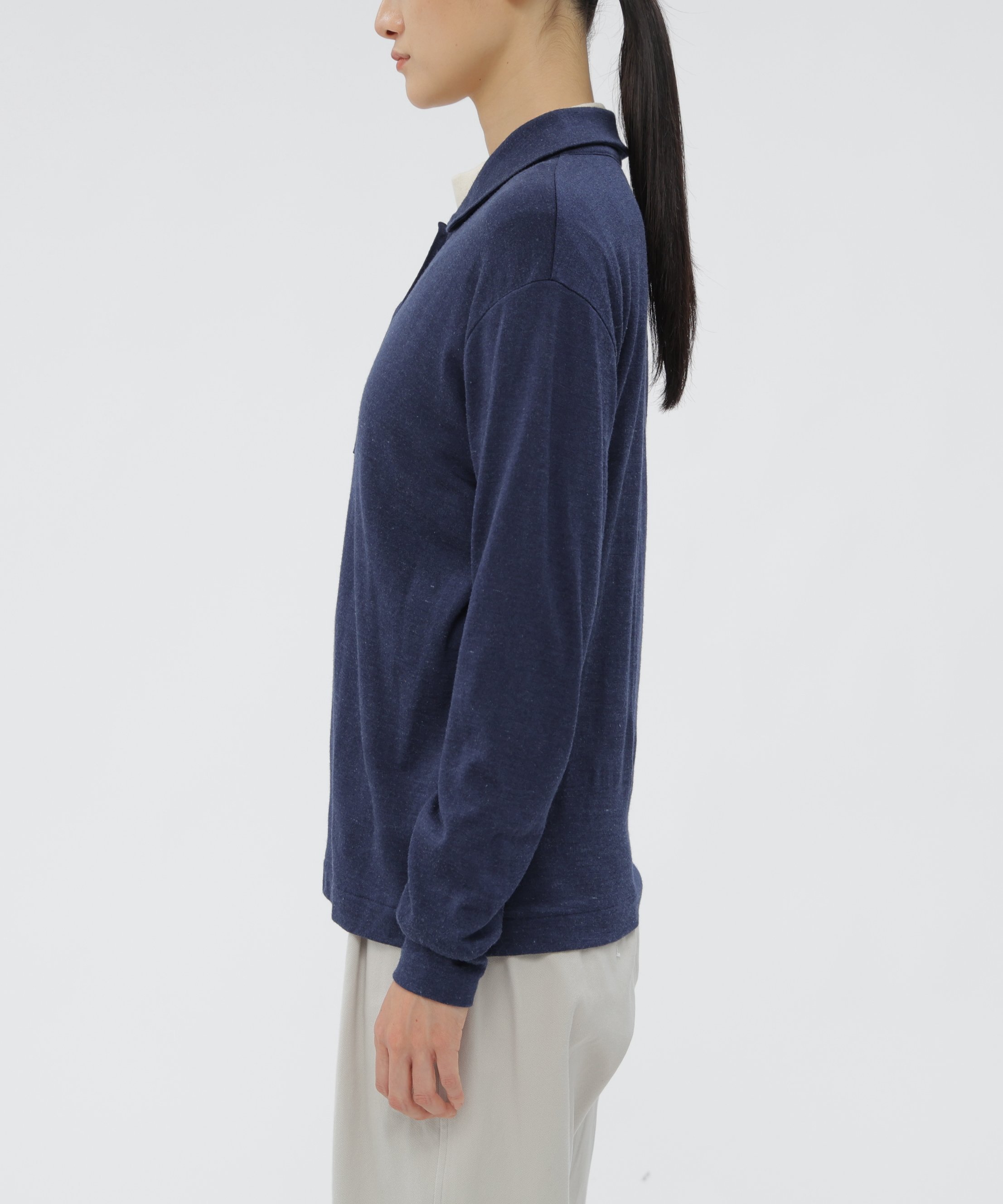 방축 가공을 더한 울과 실크를 혼합한 원사로 짜여진 저지 소재의 폴로셔츠입니다. 실크 특유의 선명한 발색과 부드러운 촉감입니다.