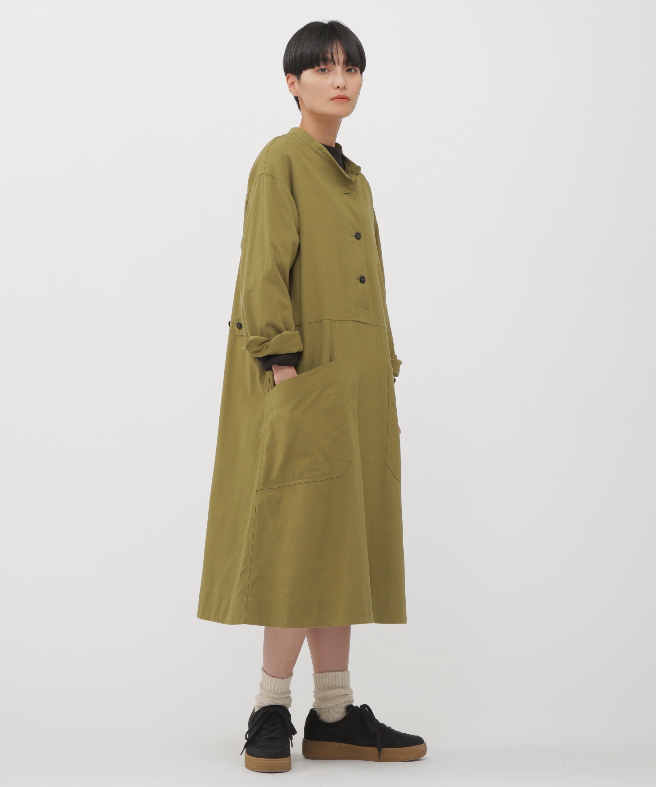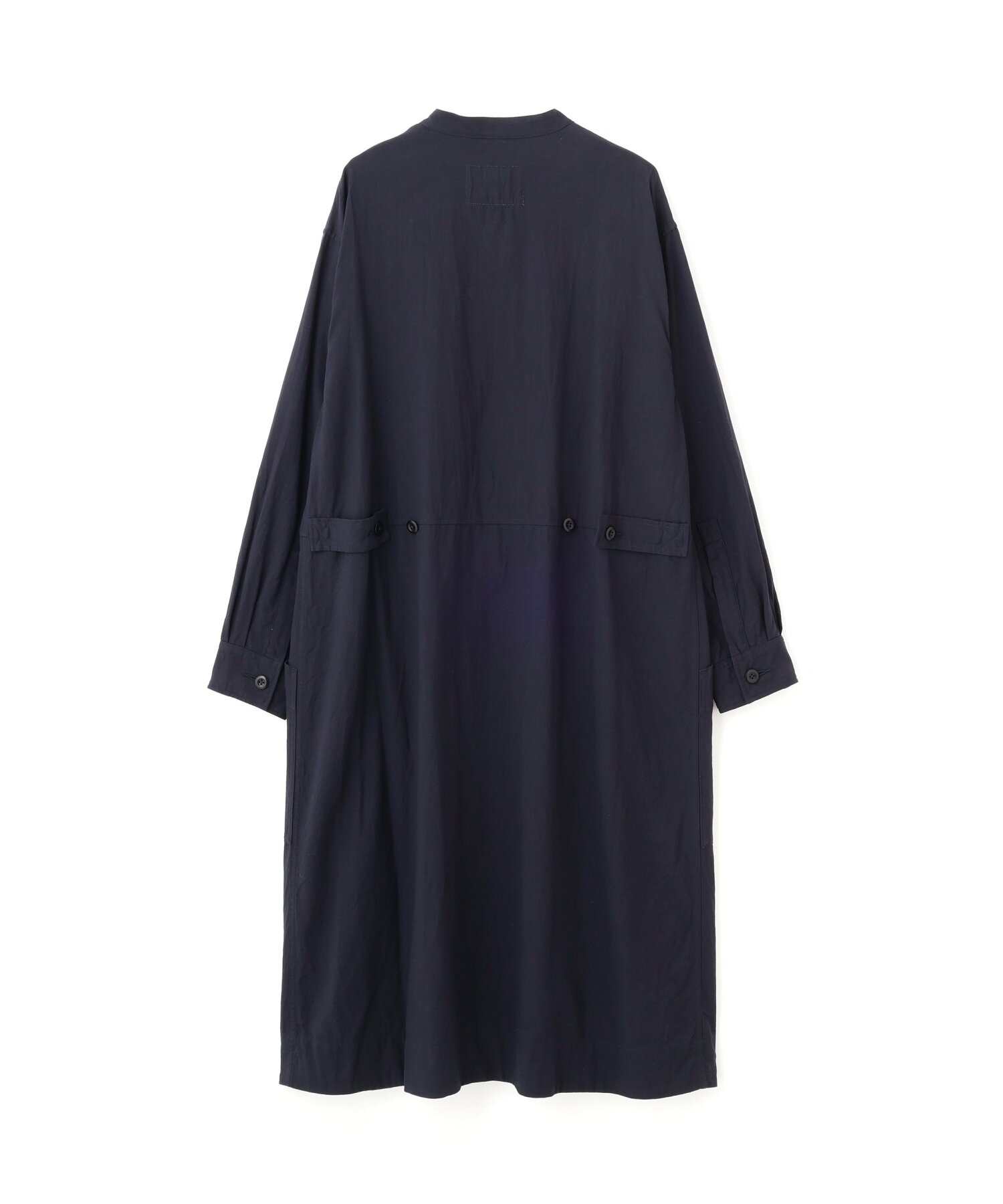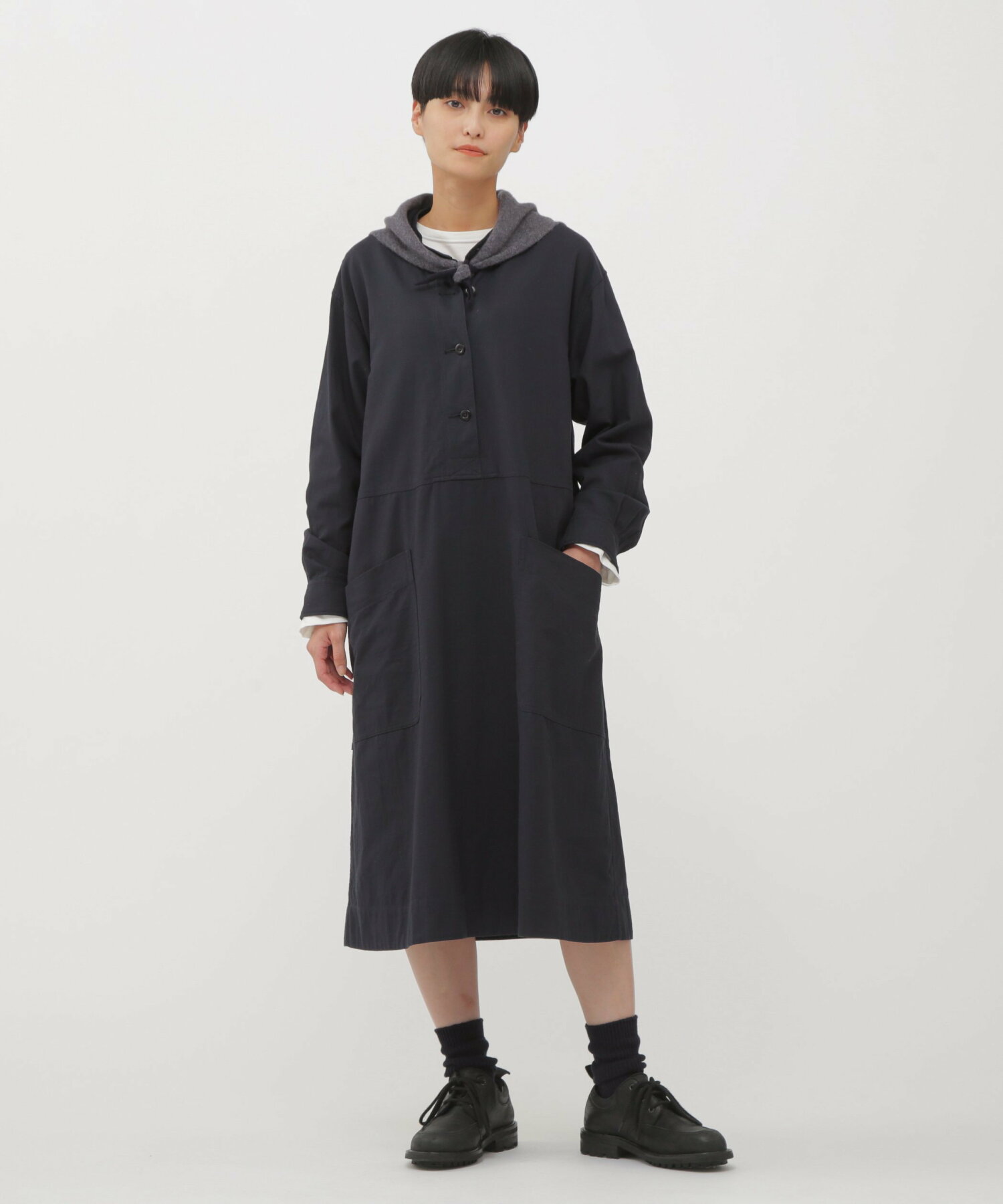 코튼과 울을 교직해 완성한 트윌 소재의 드레스입니다. 울 특유의 볼륨감과 따뜻한 질감을 살리기 위해 밀도를 느슨하게 직조했으며, 염색과 텀블러 가공을 더해 빈티지한 무드를 표현했습니다. 카라가 없는 심플한 디자인에 버튼다운 디테일을 더했으며, 사선으로 배치된 허리 포켓과 사이드의 조절 탭이 있습니다.