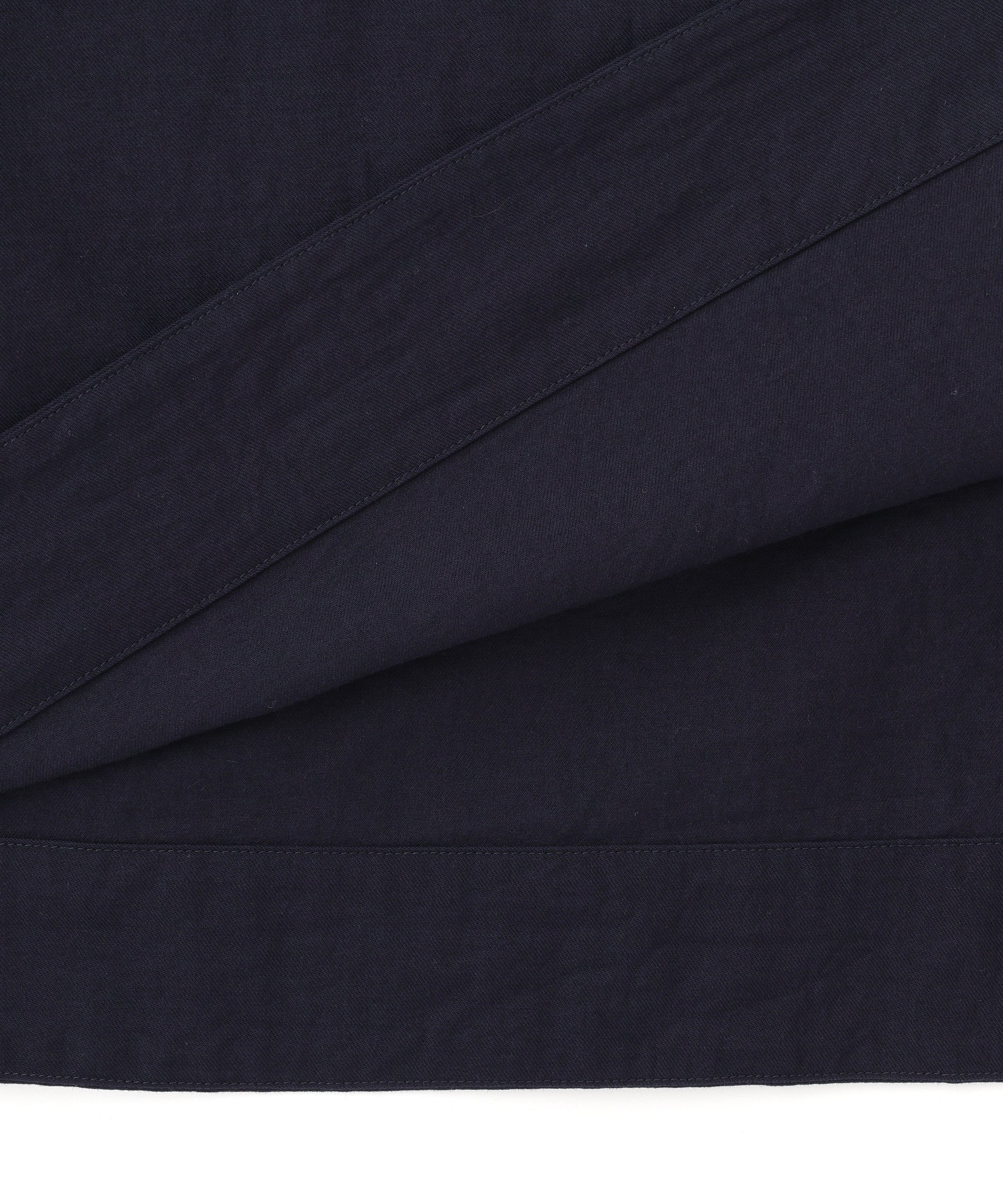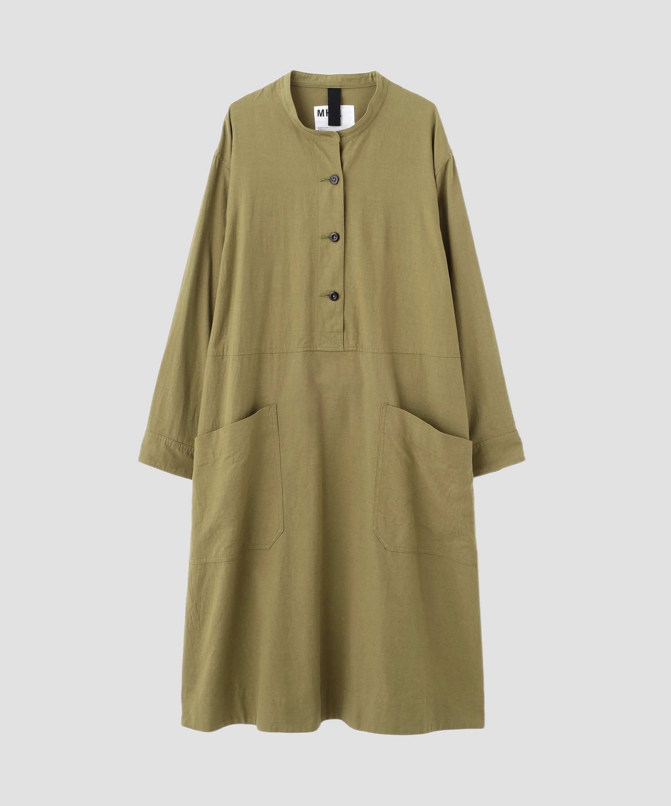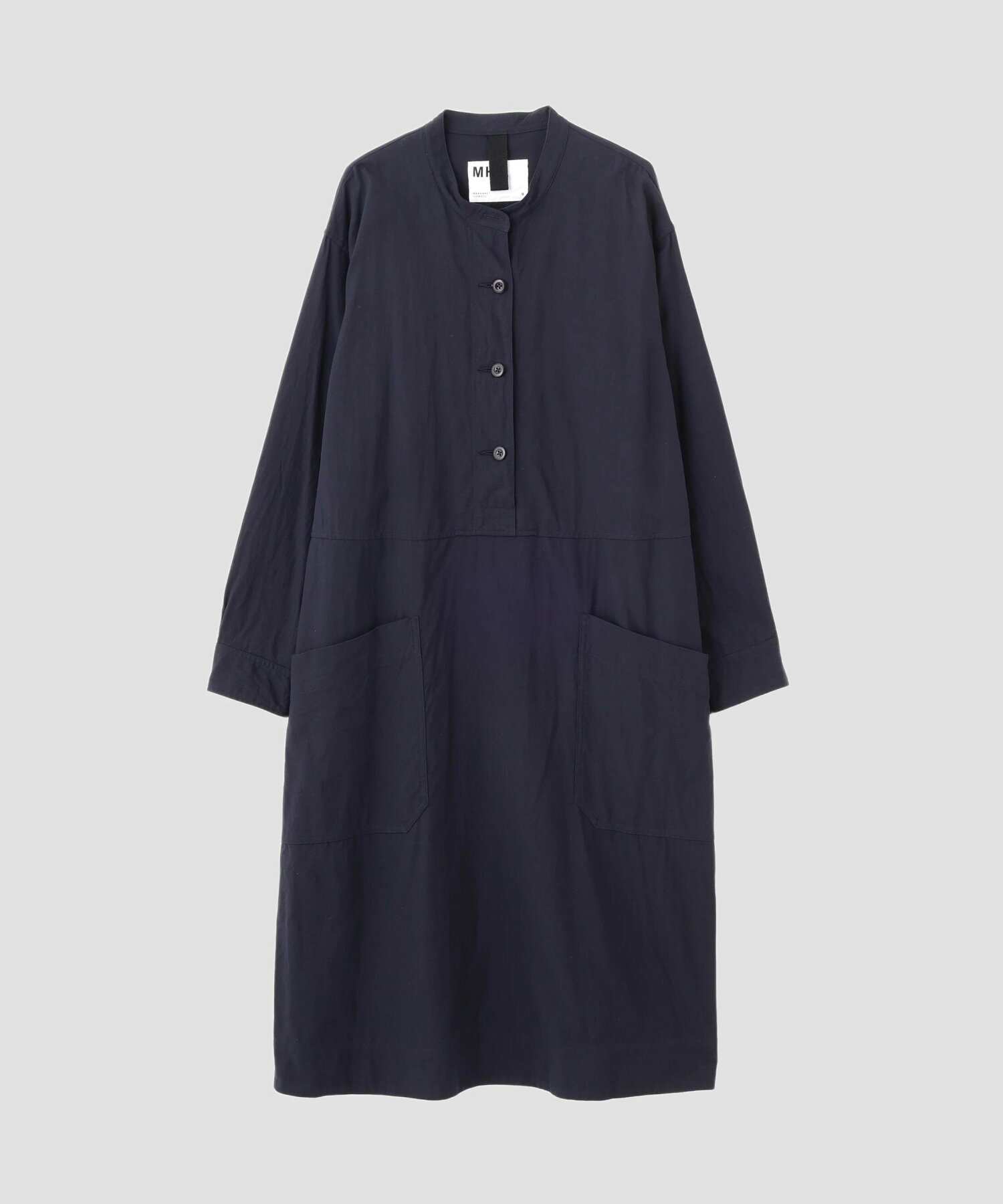 코튼과 울을 교직해 완성한 트윌 소재의 드레스입니다. 울 특유의 볼륨감과 따뜻한 질감을 살리기 위해 밀도를 느슨하게 직조했으며, 염색과 텀블러 가공을 더해 빈티지한 무드를 표현했습니다. 카라가 없는 심플한 디자인에 버튼다운 디테일을 더했으며, 사선으로 배치된 허리 포켓과 사이드의 조절 탭이 있습니다.