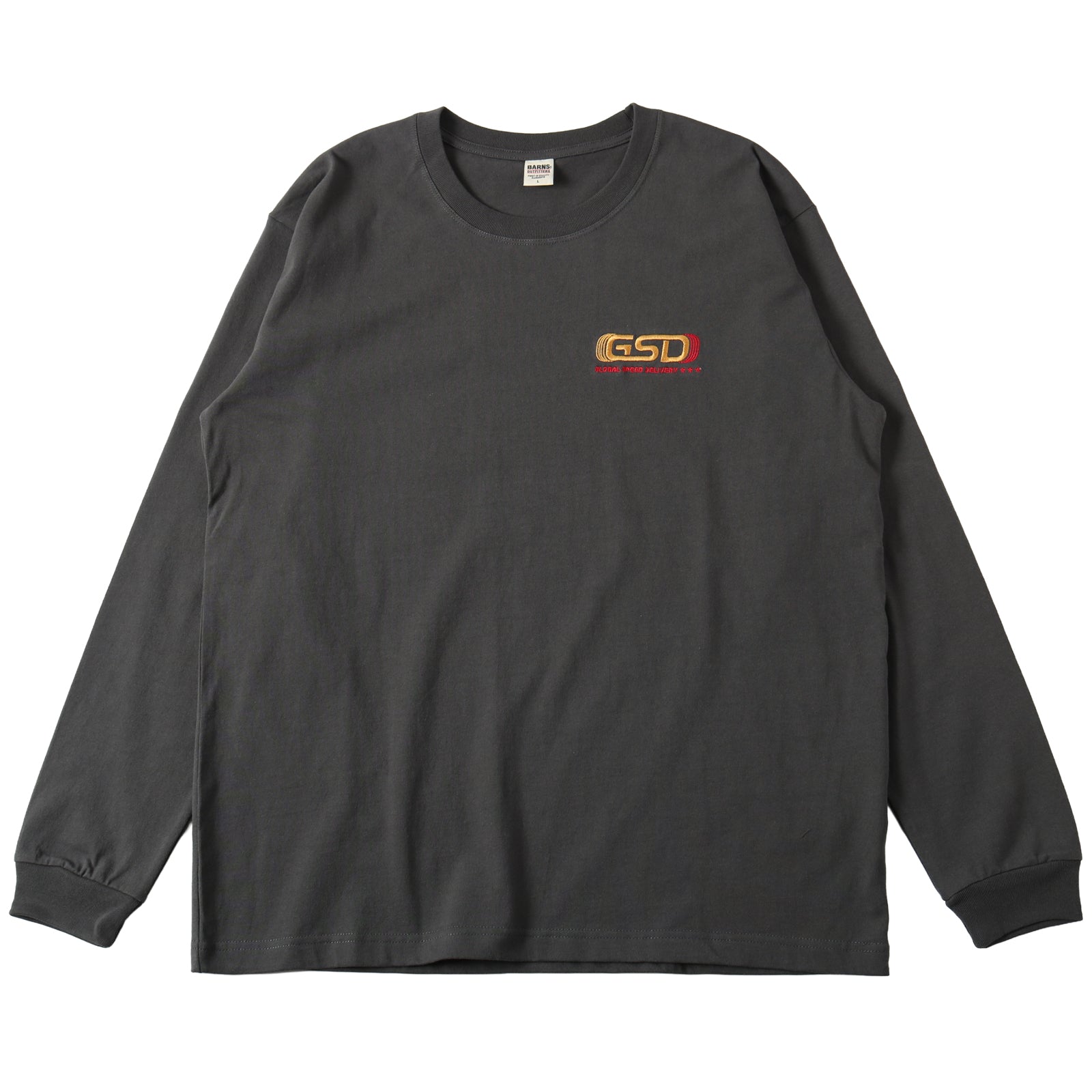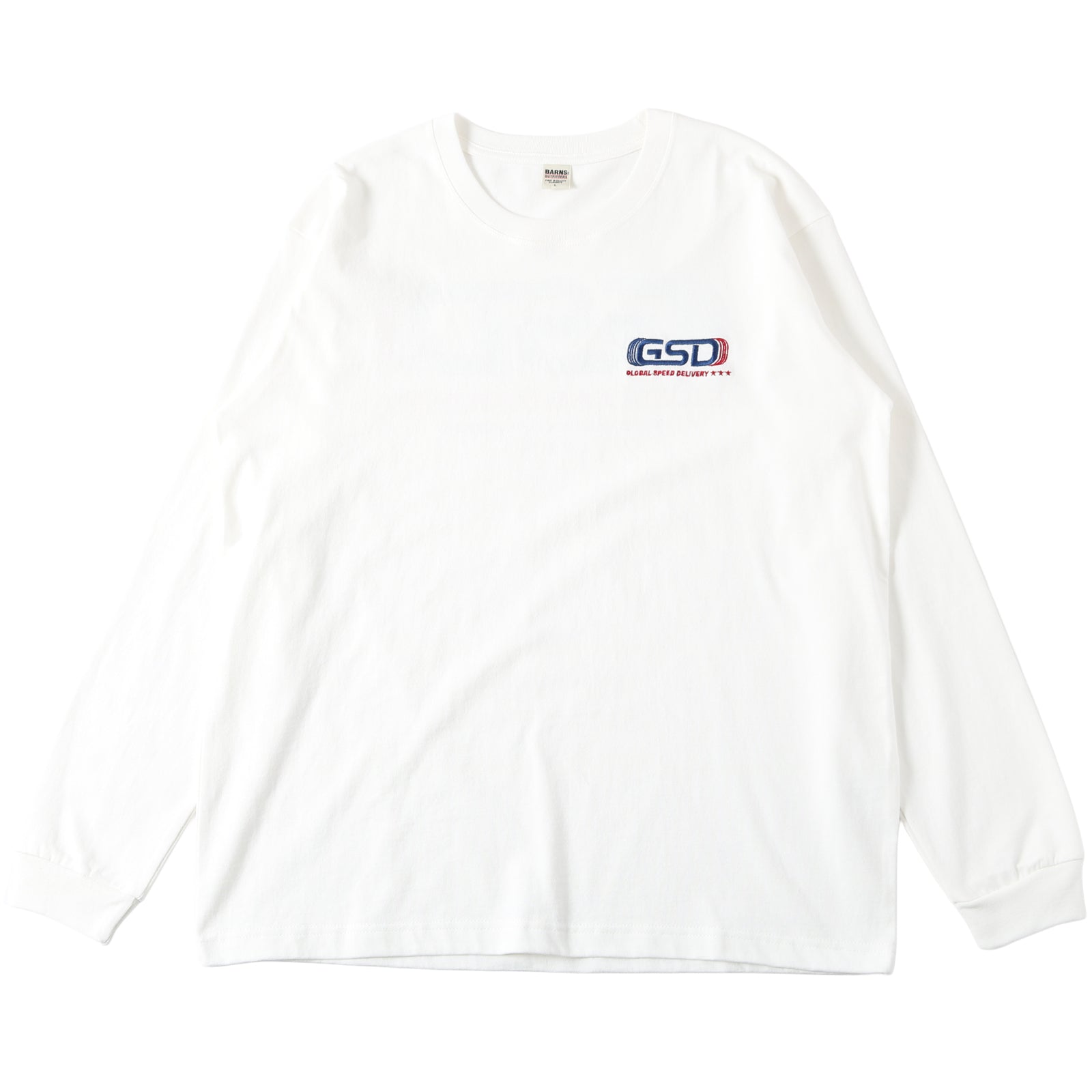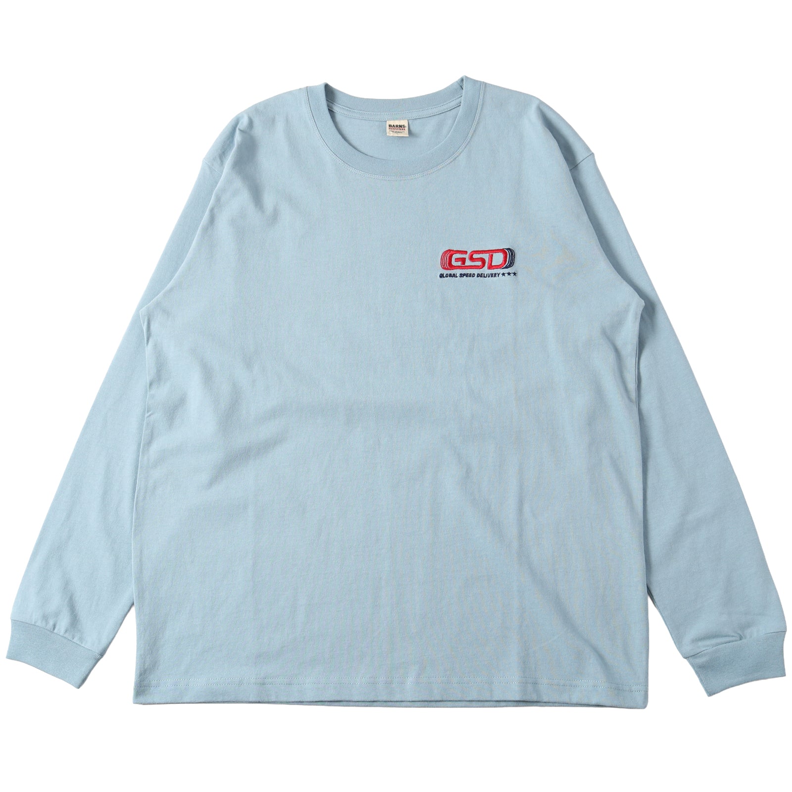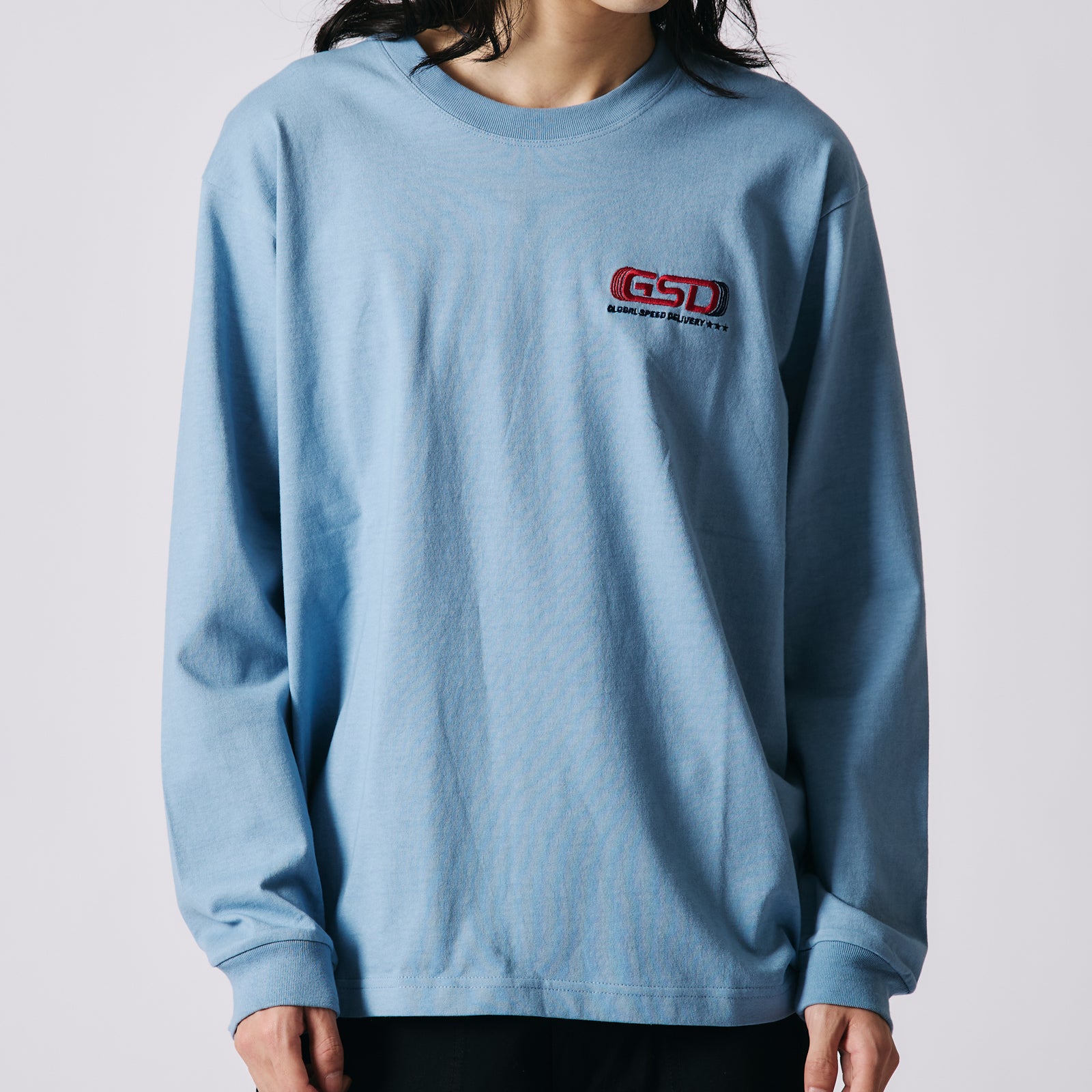 앞면 자수, 뒷면 프린팅의 긴팔 티.