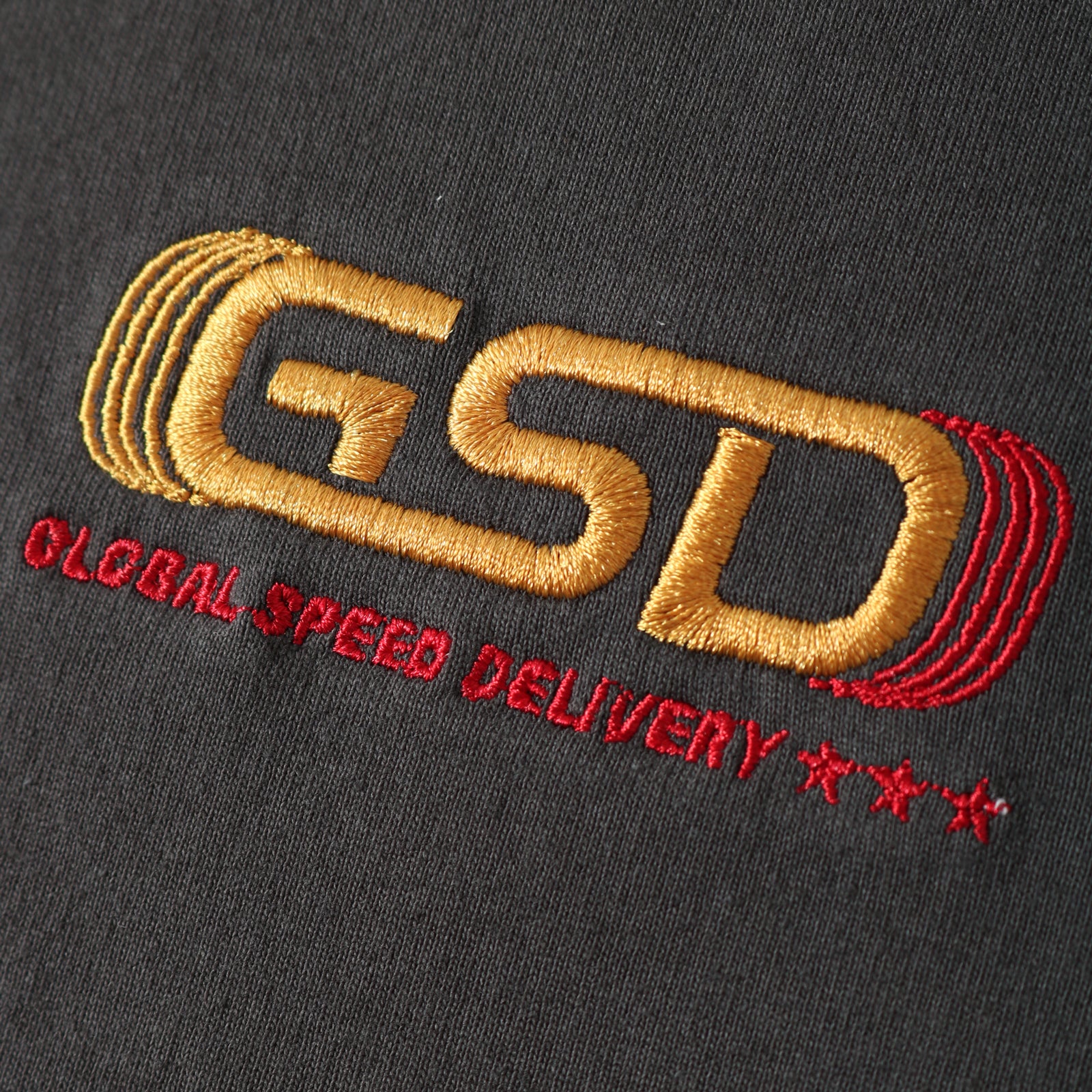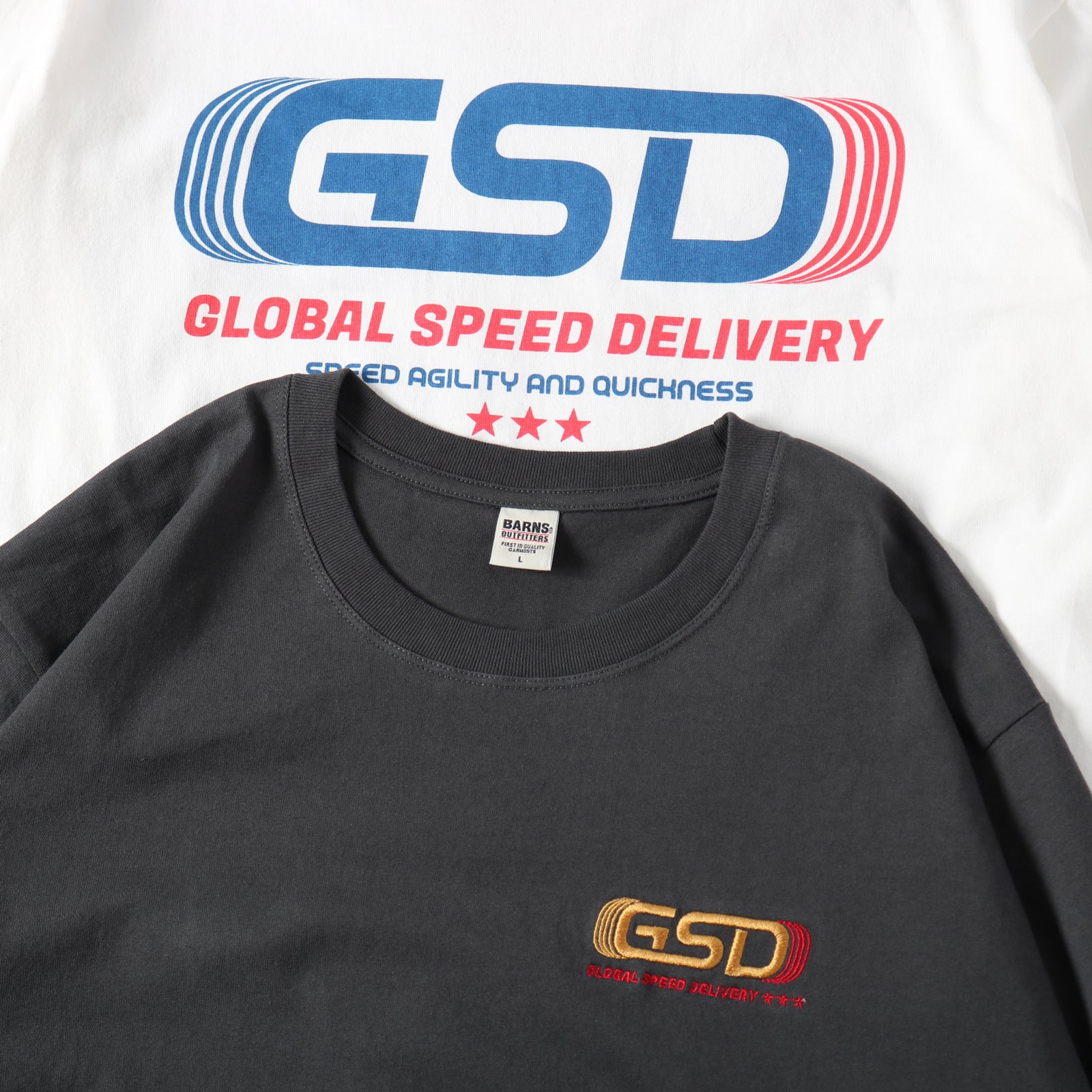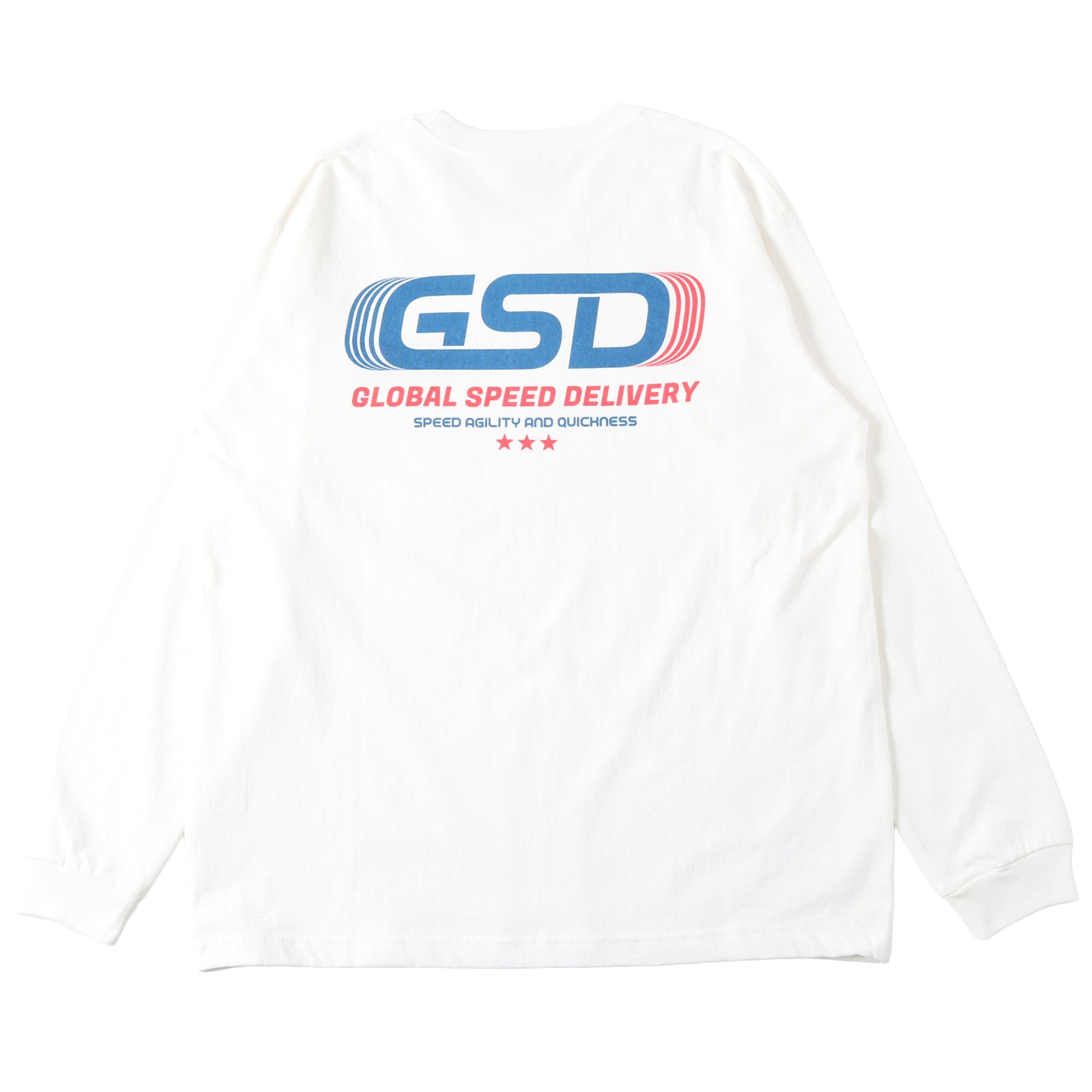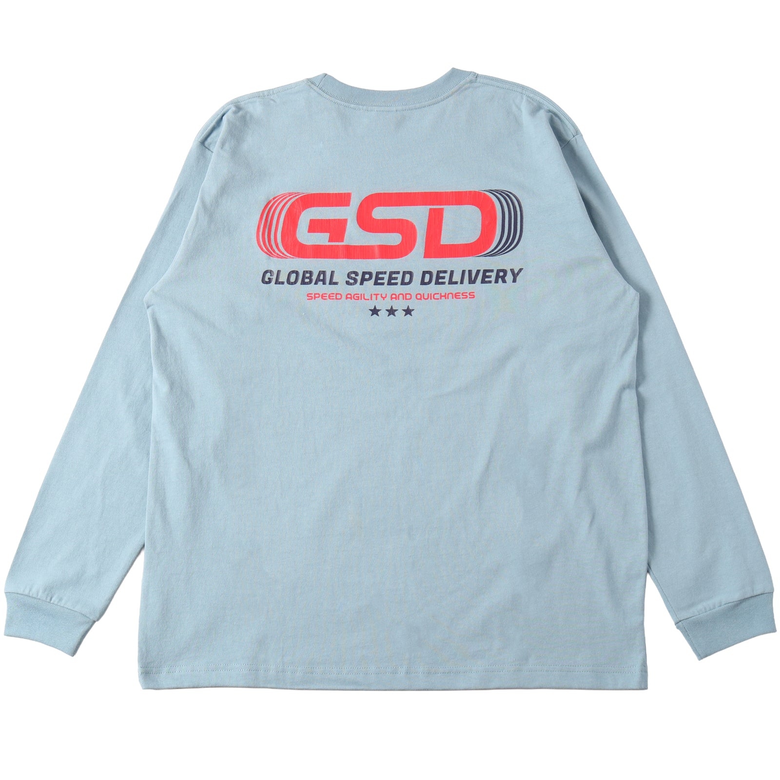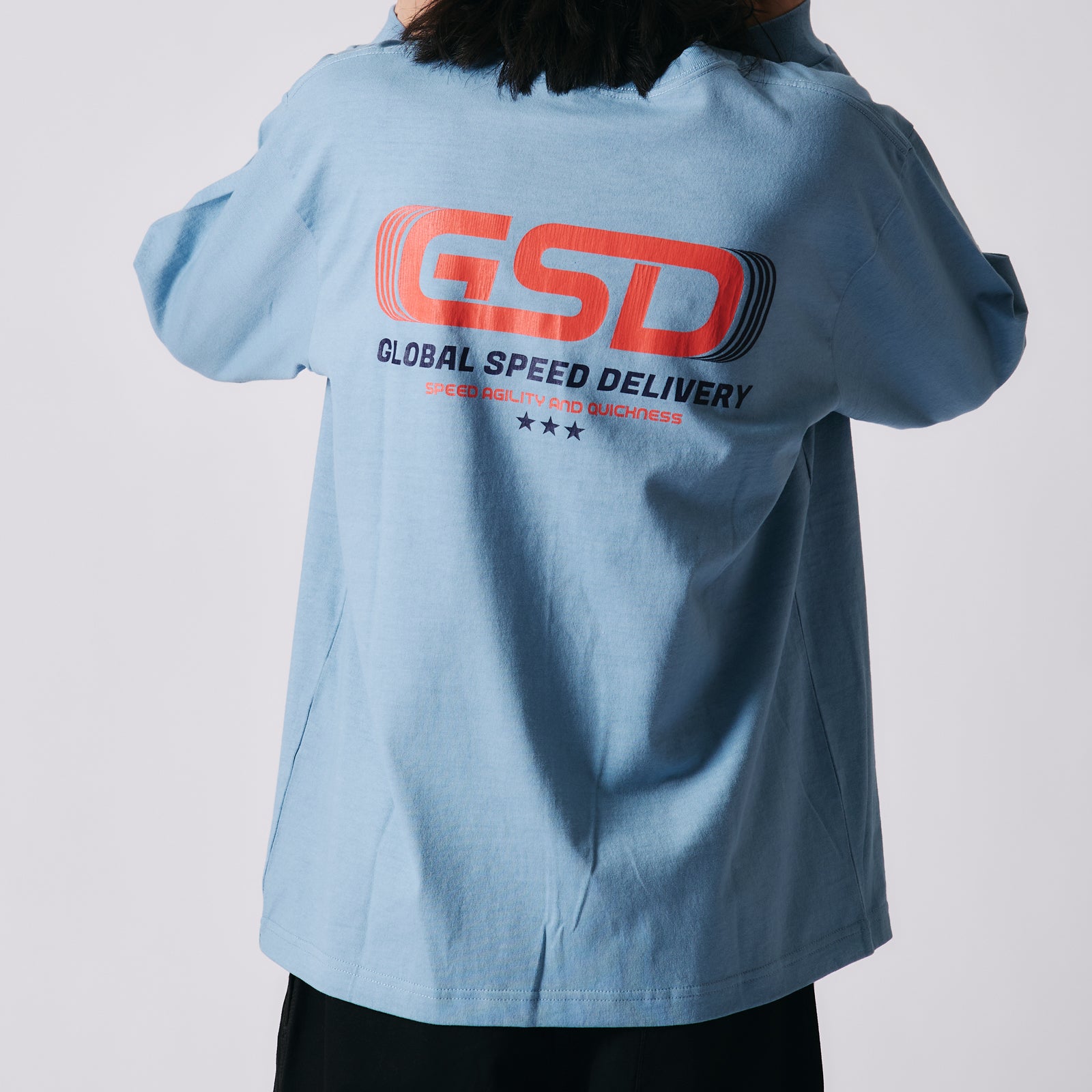 앞면 자수, 뒷면 프린팅의 긴팔 티.