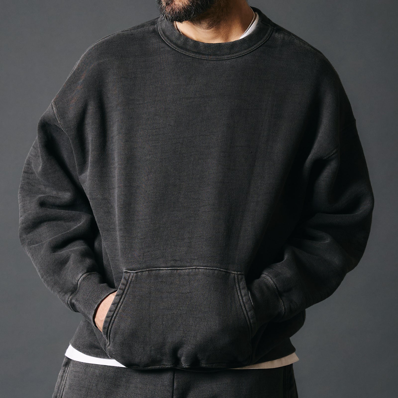 현대적인 사이즈감과 빈티지한 요소를 결합한 스웨트 티 셔츠. 편안한 핏의 드롭숄더 디자인입니다.
