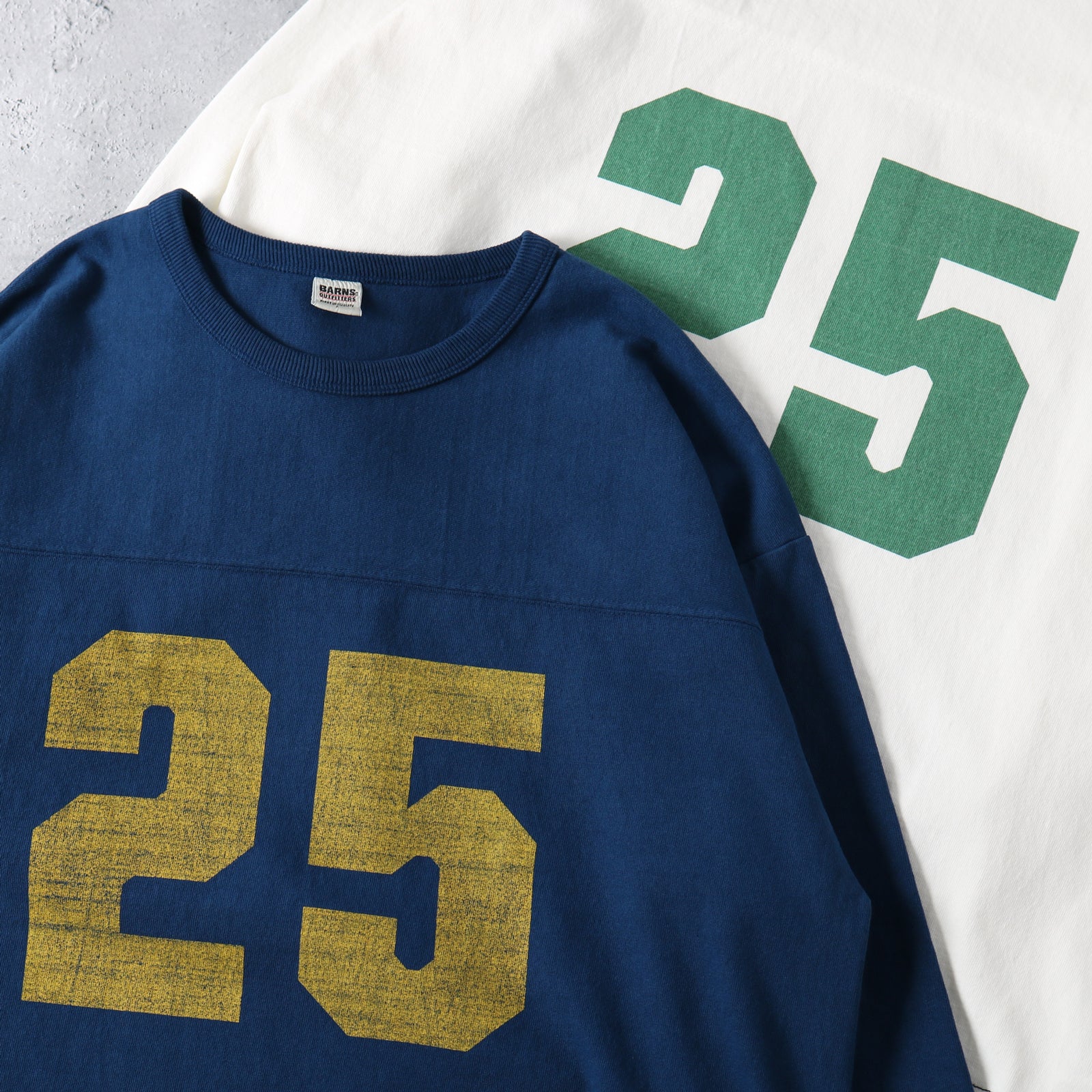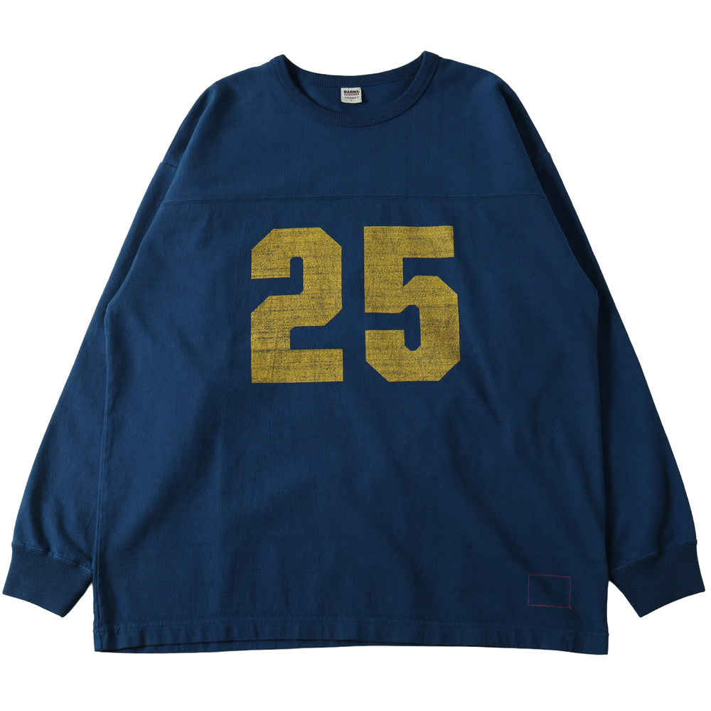 풋볼 티셔츠는 본래 미식축구 선수의 유니폼에서 유래한 아이템으로, 일반 티셔츠와 달리 가슴과 등 부분의 절개선 , 여유 있는 실루엣 , 견고한 봉제 가 특징입니다.