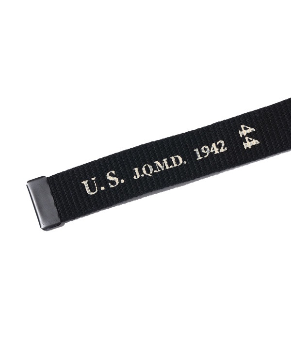 1937년에 미 육군에 채용된 미군용 바지 벨트. 당시와 같은 두께로 짠 벨트의 폭은 1-1/4 인치, 철에 검은 색으로 칠해진 버클은 핀으로 묶는 타입이 아니지만, 벨트의 폭 전체를 씹어 그립이 강하다. 벨트 뒷면에는 정부 용품, 입양 연도 및 크기에 대해 “U.S. J.Q.M.D”가 표시되어 있습니다.
