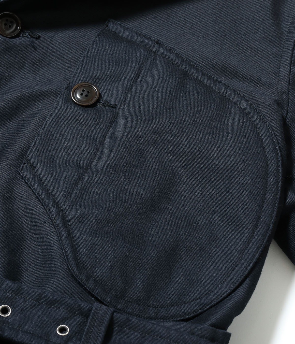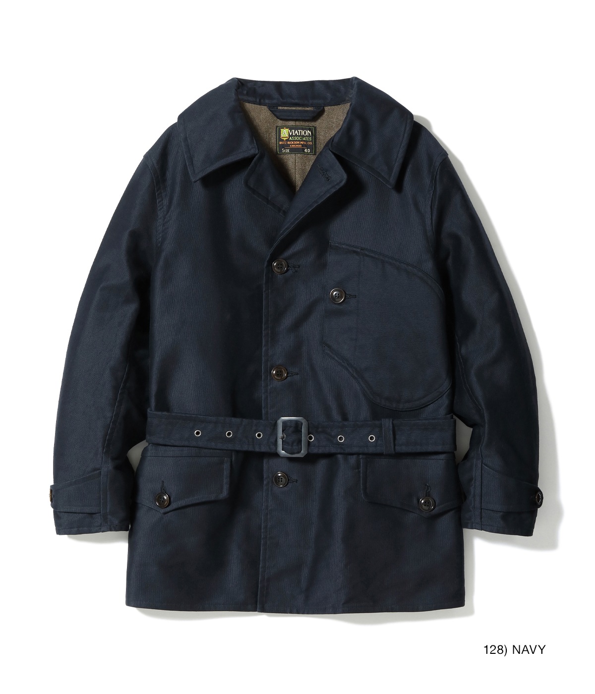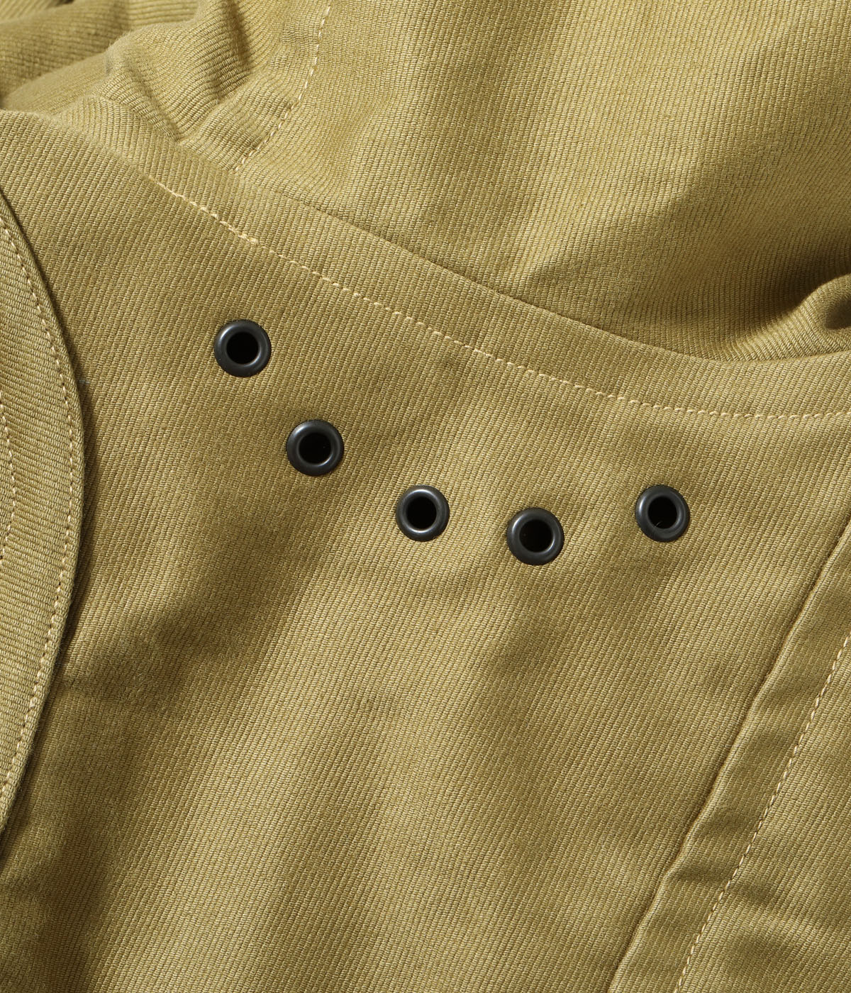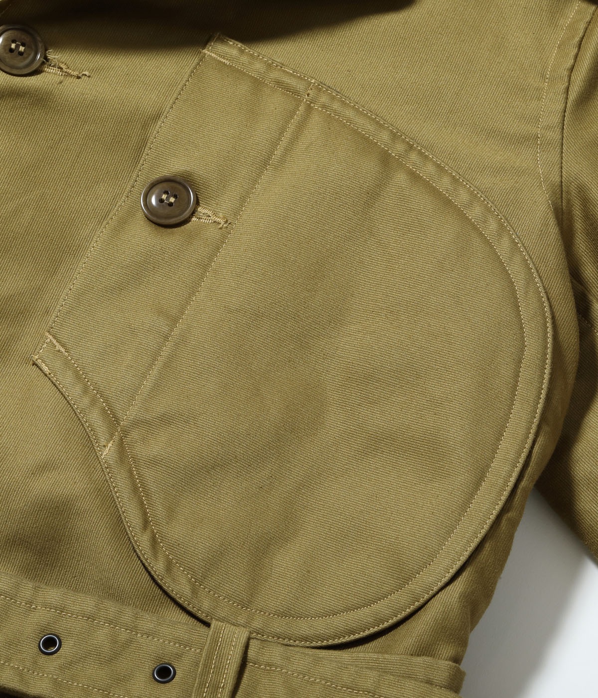 1930년대에 미 해군은 매서운 바람에 노출된 비행사와 갑판 승무원을 위해 정글 천이라는 면 그로그랭을 개발하여 채택했습니다. 고밀도 우븐 소재는 바람 저항과 내구성이 매우 뛰어나 밀리터리 재킷을 이야기 할 때 빠뜨릴 수없는 소재입니다. 몸에 꿰매어진 큰 지도 포켓과 허리 벨트는 고대 시대의 코트를 나타냅니다.