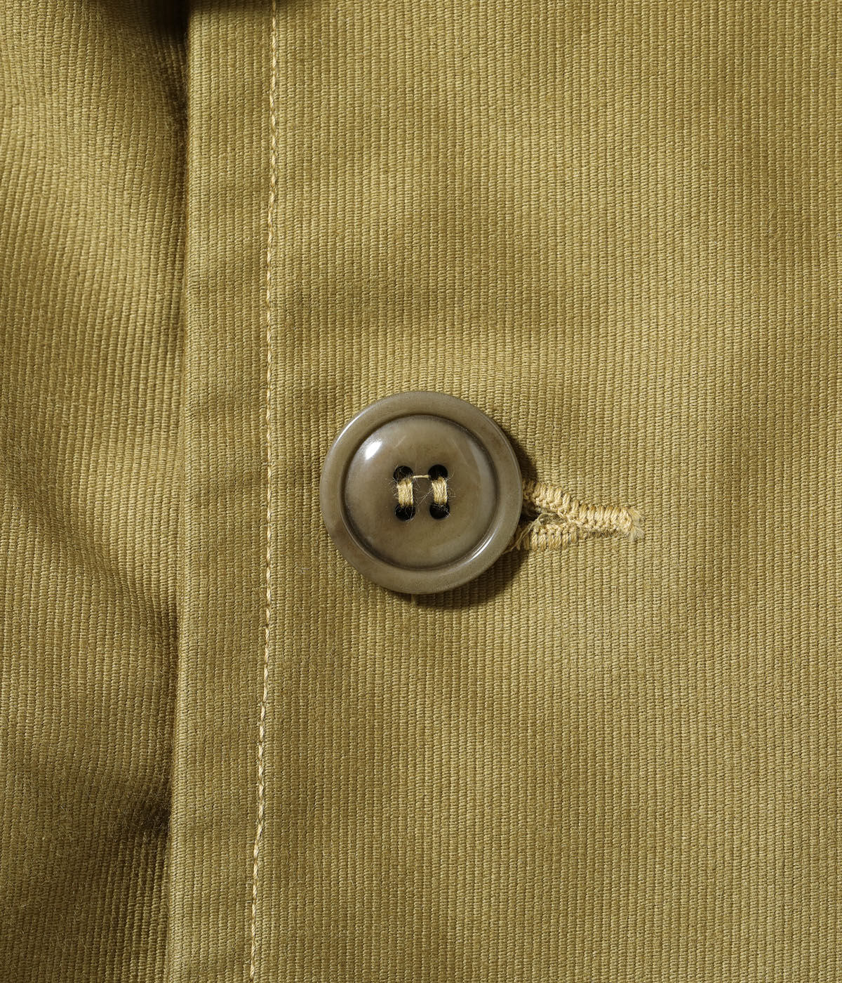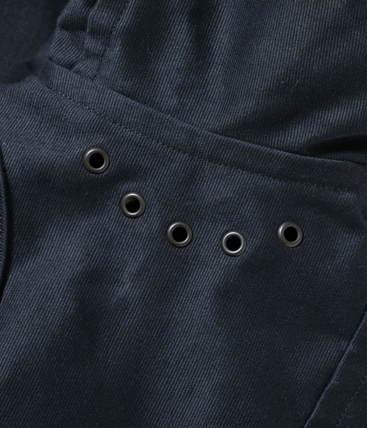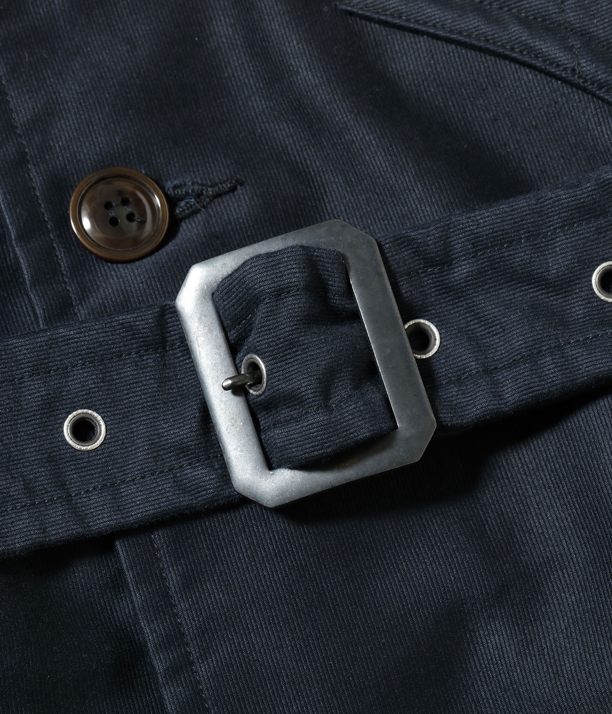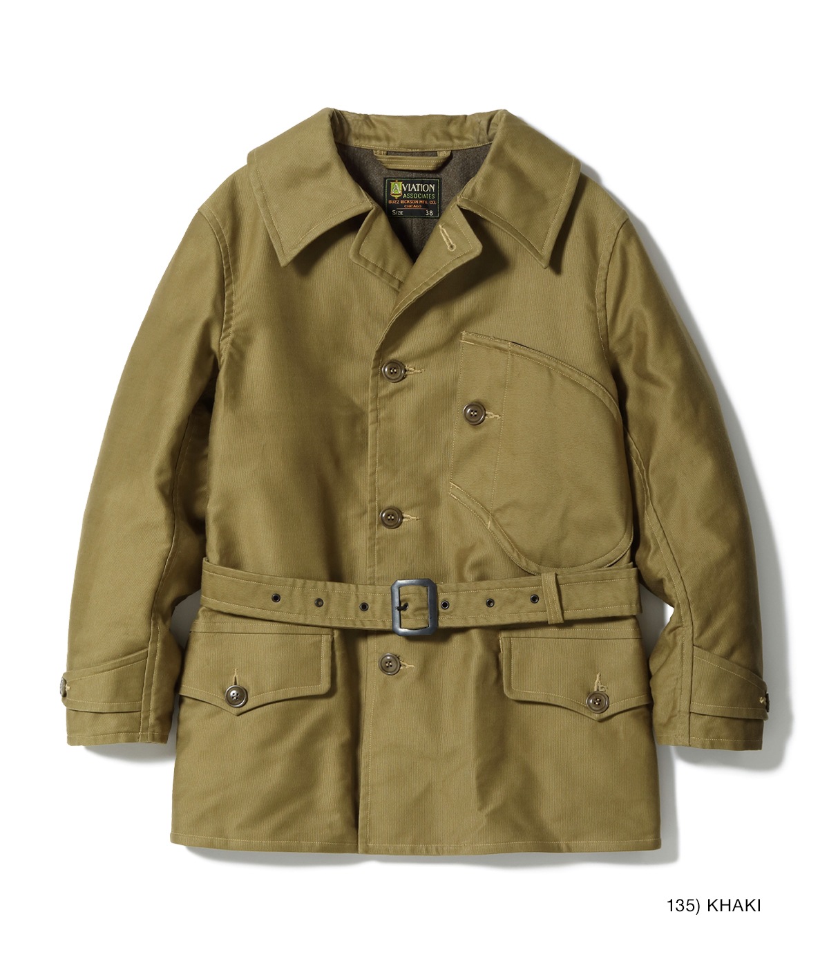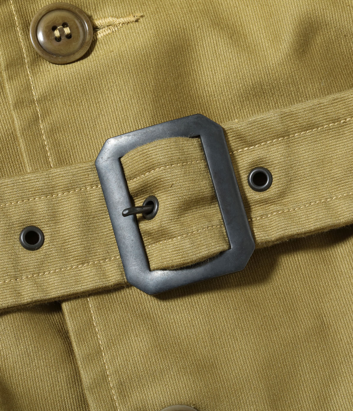 1930년대에 미 해군은 매서운 바람에 노출된 비행사와 갑판 승무원을 위해 정글 천이라는 면 그로그랭을 개발하여 채택했습니다. 고밀도 우븐 소재는 바람 저항과 내구성이 매우 뛰어나 밀리터리 재킷을 이야기 할 때 빠뜨릴 수없는 소재입니다. 몸에 꿰매어진 큰 지도 포켓과 허리 벨트는 고대 시대의 코트를 나타냅니다.