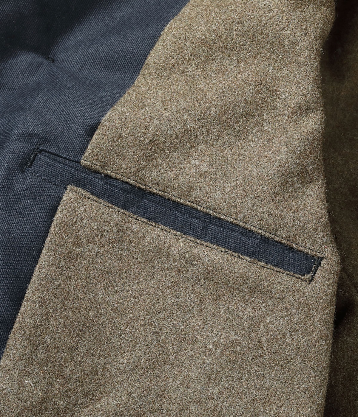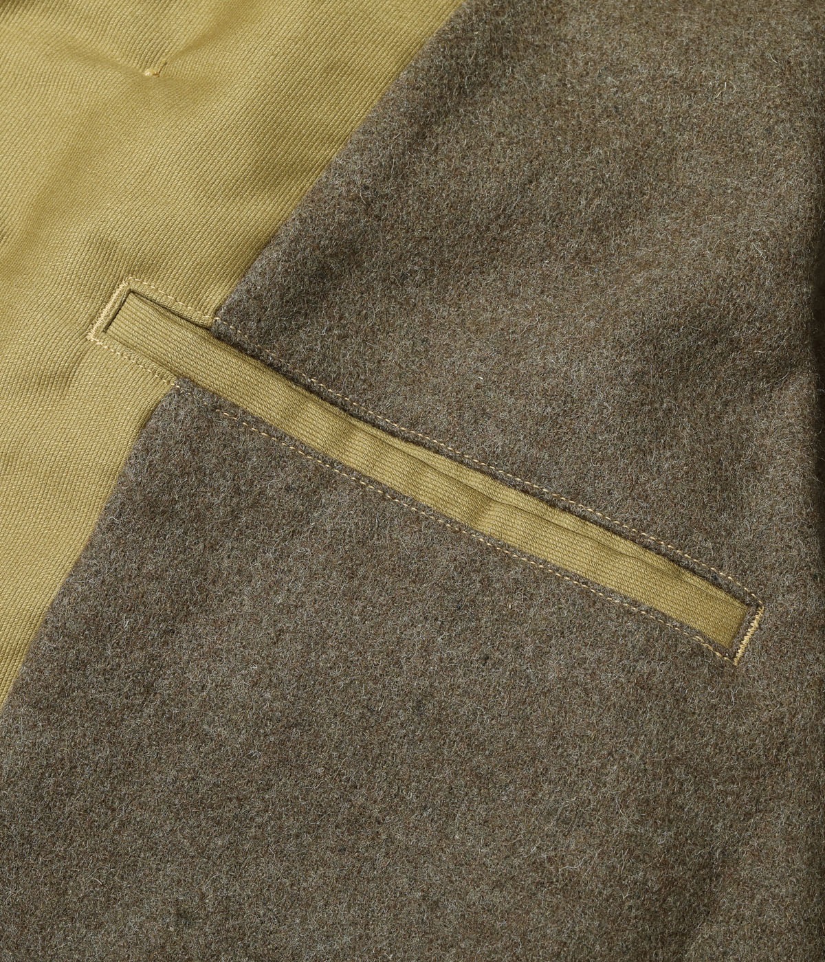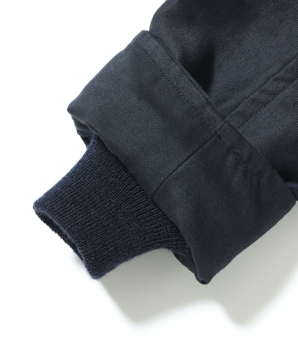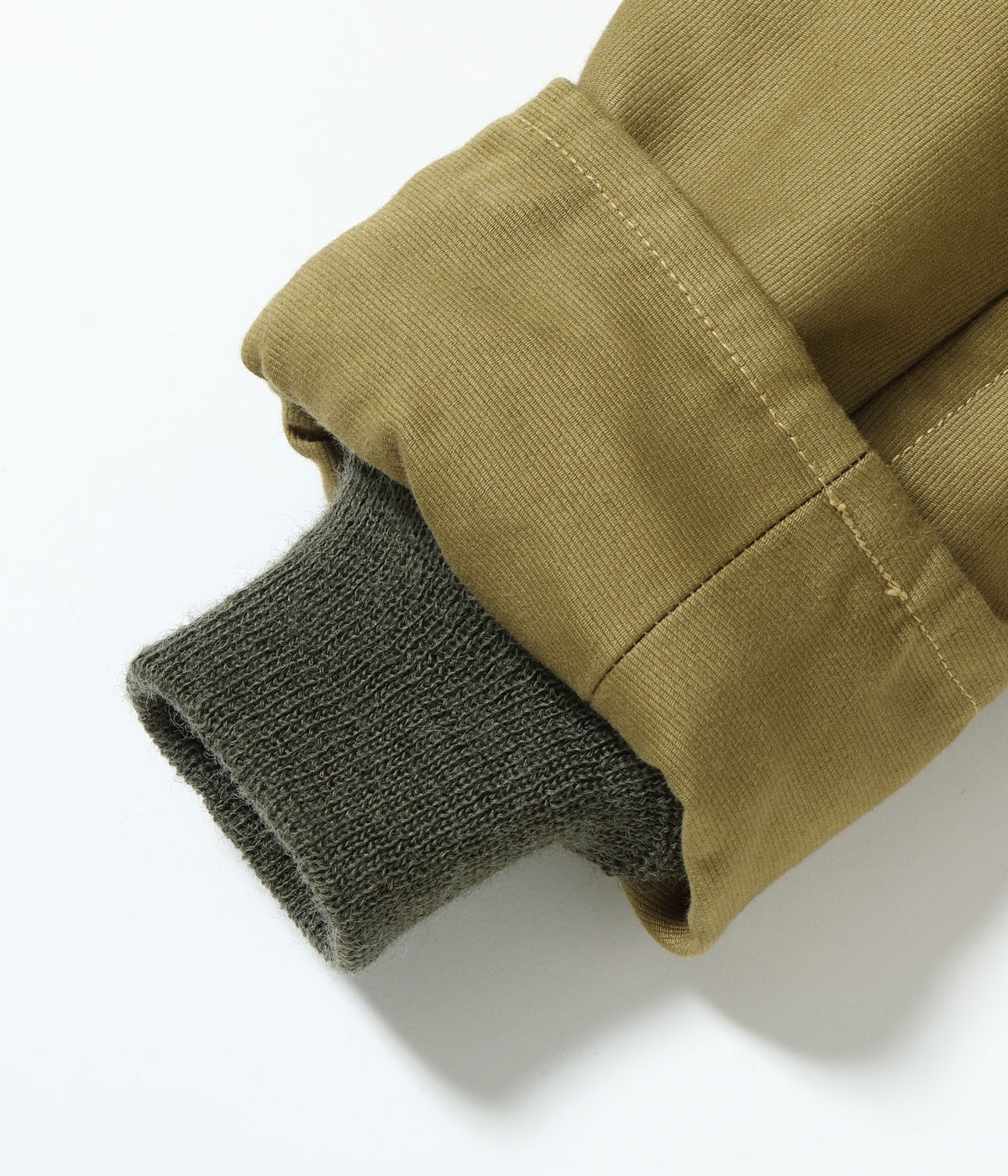 1930년대에 미 해군은 매서운 바람에 노출된 비행사와 갑판 승무원을 위해 정글 천이라는 면 그로그랭을 개발하여 채택했습니다. 고밀도 우븐 소재는 바람 저항과 내구성이 매우 뛰어나 밀리터리 재킷을 이야기 할 때 빠뜨릴 수없는 소재입니다. 몸에 꿰매어진 큰 지도 포켓과 허리 벨트는 고대 시대의 코트를 나타냅니다.