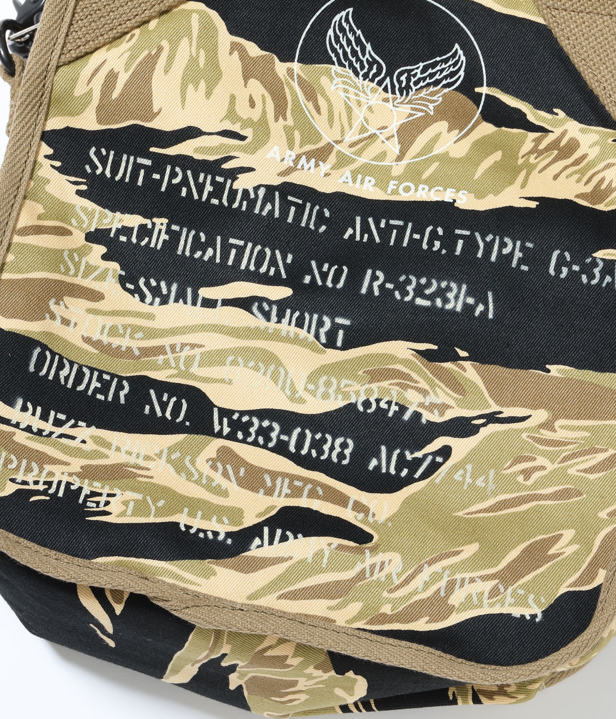 전투기 탑승 시 조종사에게 가해지는 강한 중력 가속도의 압박은 혈류에 영향을 주어, 뇌에 산소가 부족하면 의식을 잃게 된다. 이를 방지하기 위해 혈액이 말초로 쏠리지 않도록 하체를 코드로 압박하는 슈트가 개발되었다. 이번 아이템은 그 슈트를 수납하기 위해 제작된 전용 가방을 기반으로 한 디자인이다. 원래는 헤링본 트윌 원단을 사용했으나, 본 제품은 골드 타이거 카모플라주 원단을 적용한 Buzz Rickson’s 오리지널 버전이다. 봉제는 공정을 세심하게 거친 파이핑 마감으로 완성되었으며, 지퍼는 대전기형 TALON 지퍼를 채택했다.