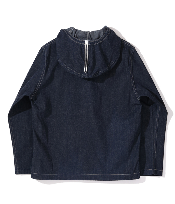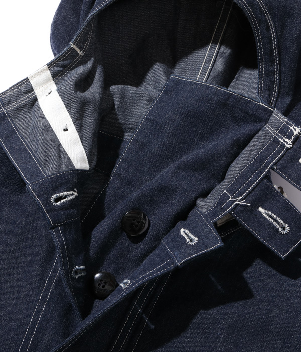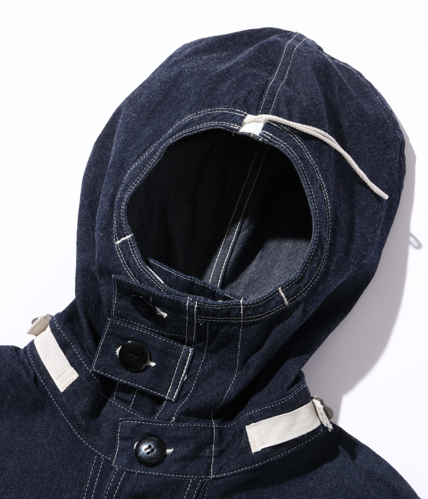 1940년대 초, 미 해군은 가스 대책으로 데님 소재로 만든 후드티를 채택했습니다. 풀오버로 탈부착이 가능하기 때문에 전체적으로 넓은 실루엣이 입니다. 후드가있는 목 주위에 설치된 고리는 가스 마스크 용 필터 용기를 연결하는 부분이며 왼쪽 및 오른쪽 스트랩은 가스 마스크의 호스를 고정합니다. 플래킷은 가스가 유입되는 것을 방지하기 위해 복잡한 삼중 구조를 가지고 있으며, 후드도 코드를 통해 나사산으로 고정되어 방독면을 부착한 후 밀봉됩니다. 이 후드티는 작업복 바지, 고무 장갑 및 고무 덧신과 함께 착용했습니다.