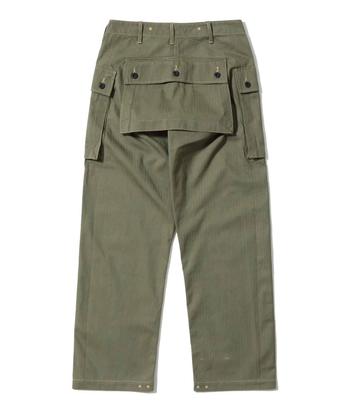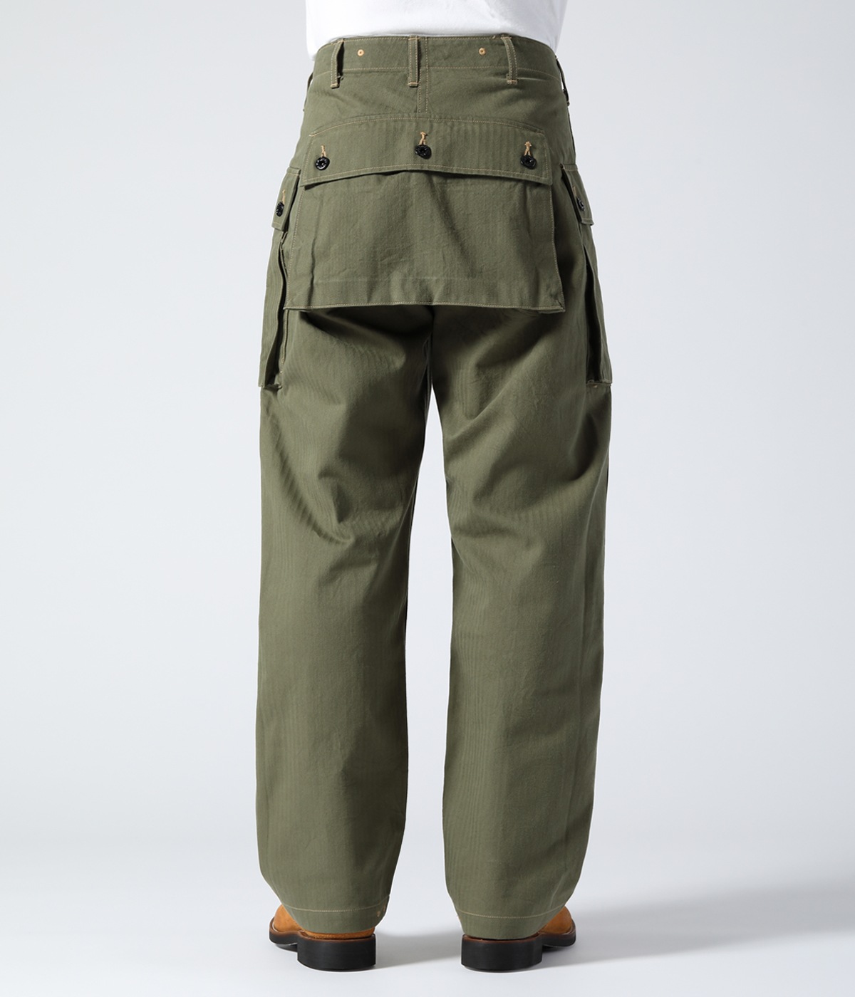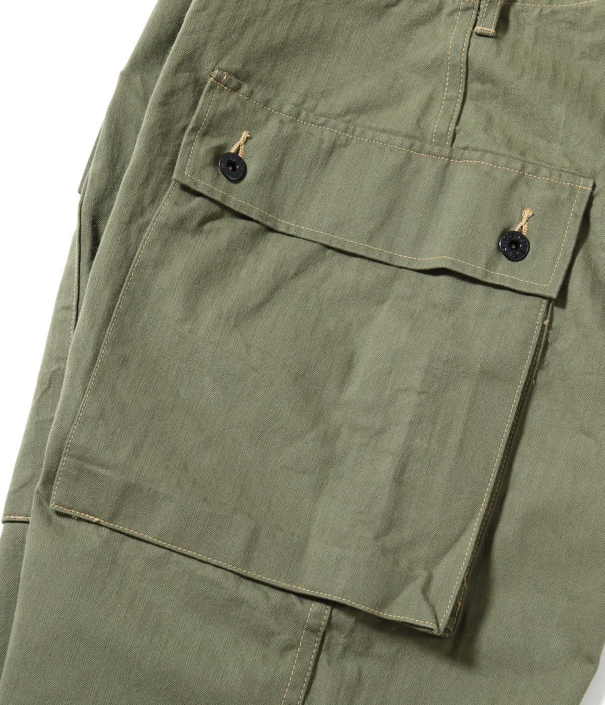 1944년에 미 해병대에 채용된 헤링본 트윌 유틸리티 팬츠. 엉덩이에는 시트 포켓, 허벅지에는 거싯 포켓이 있어 수납력이 뛰어납니다. 프런트는 버튼 플라이, 옆을 터놓은 부분은 가스가 들어가는 것을 막기 위해 넓은 가스 플랩, 허리 부분의 아일렛은 훅 타입의 서스펜더를 걸기 위한 것입니다.