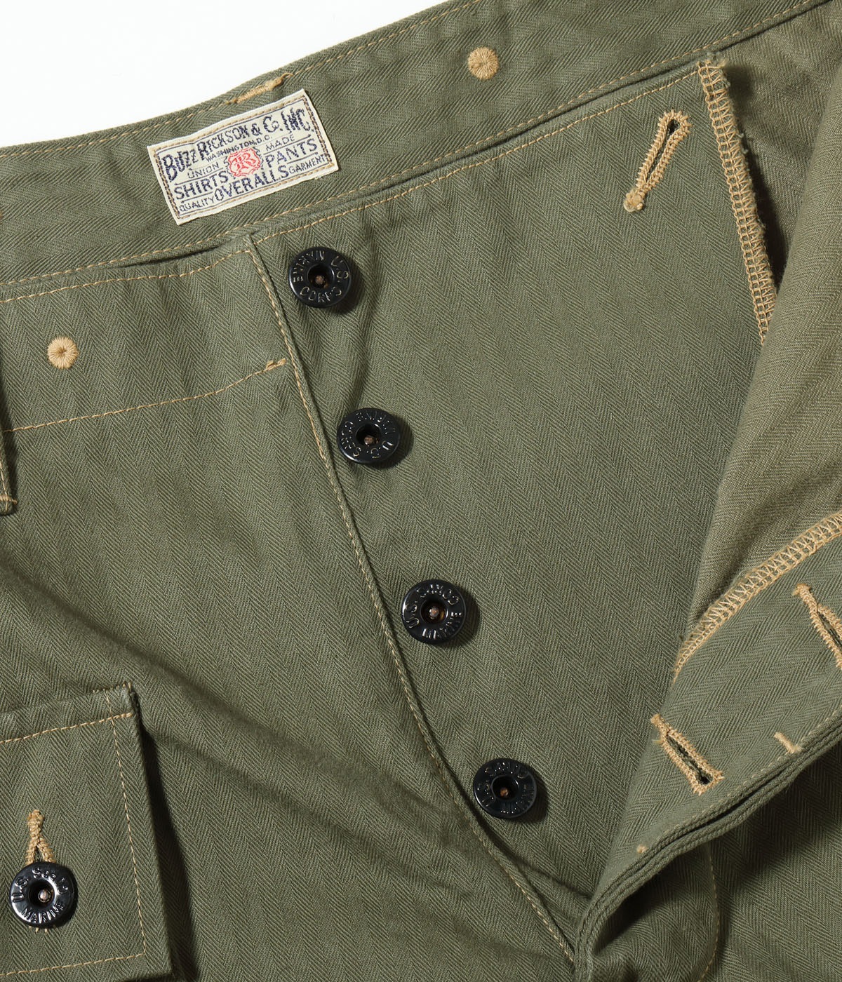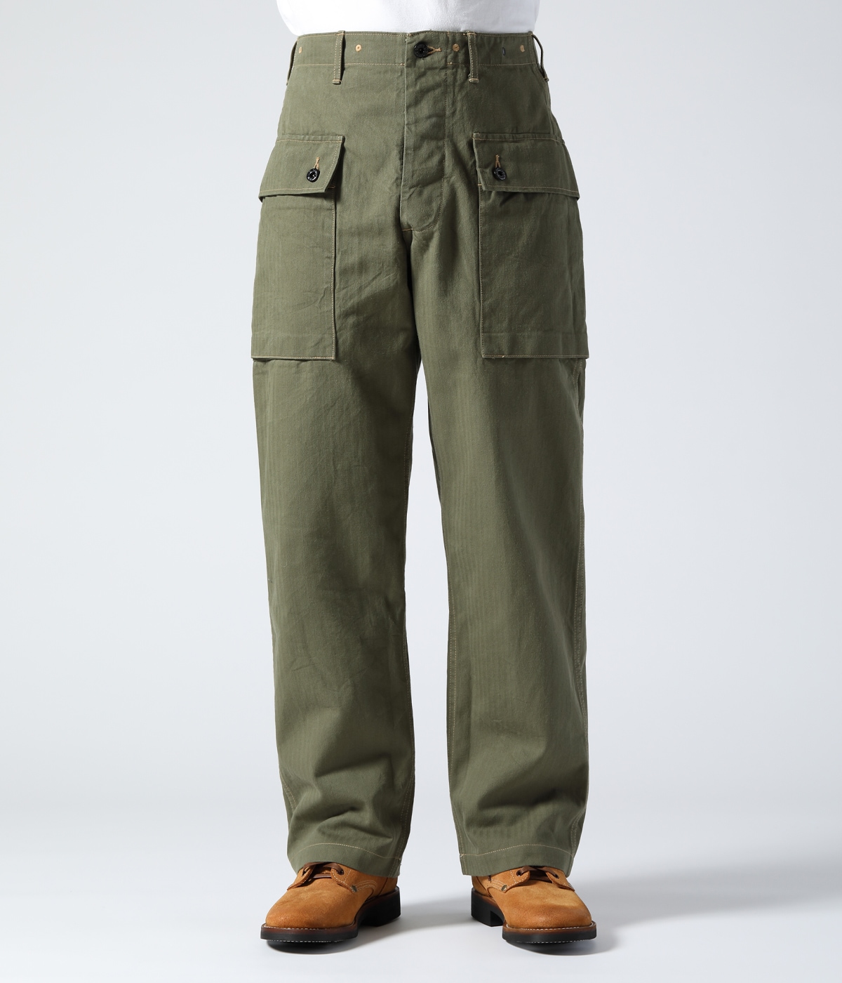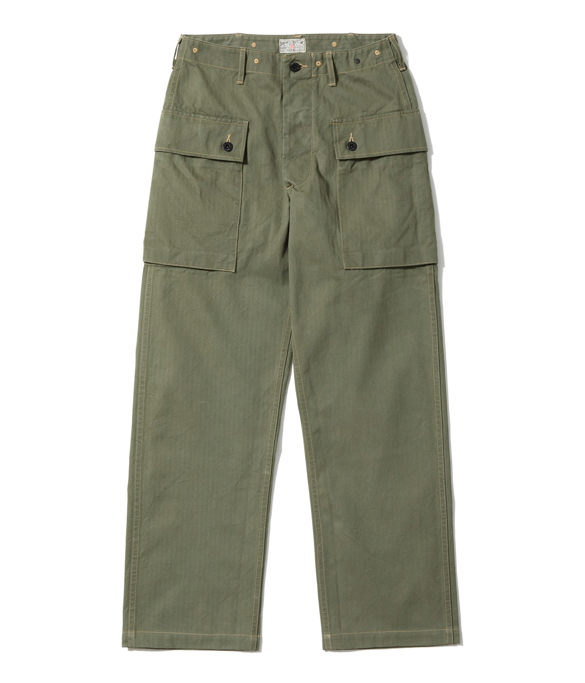 1944년에 미 해병대에 채용된 헤링본 트윌 유틸리티 팬츠. 엉덩이에는 시트 포켓, 허벅지에는 거싯 포켓이 있어 수납력이 뛰어납니다. 프런트는 버튼 플라이, 옆을 터놓은 부분은 가스가 들어가는 것을 막기 위해 넓은 가스 플랩, 허리 부분의 아일렛은 훅 타입의 서스펜더를 걸기 위한 것입니다.