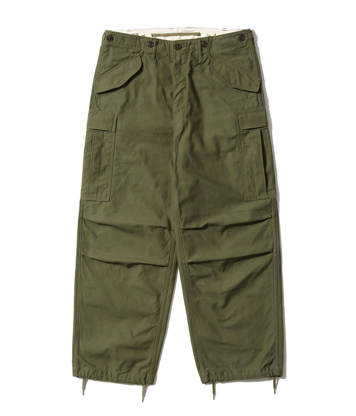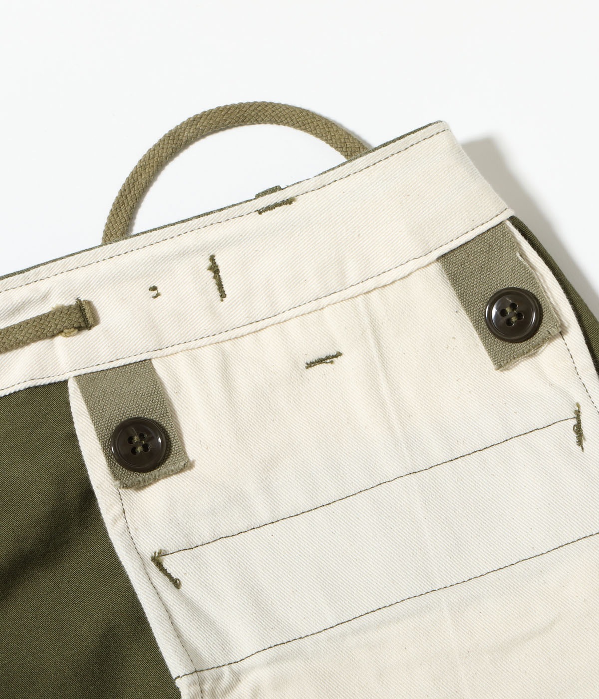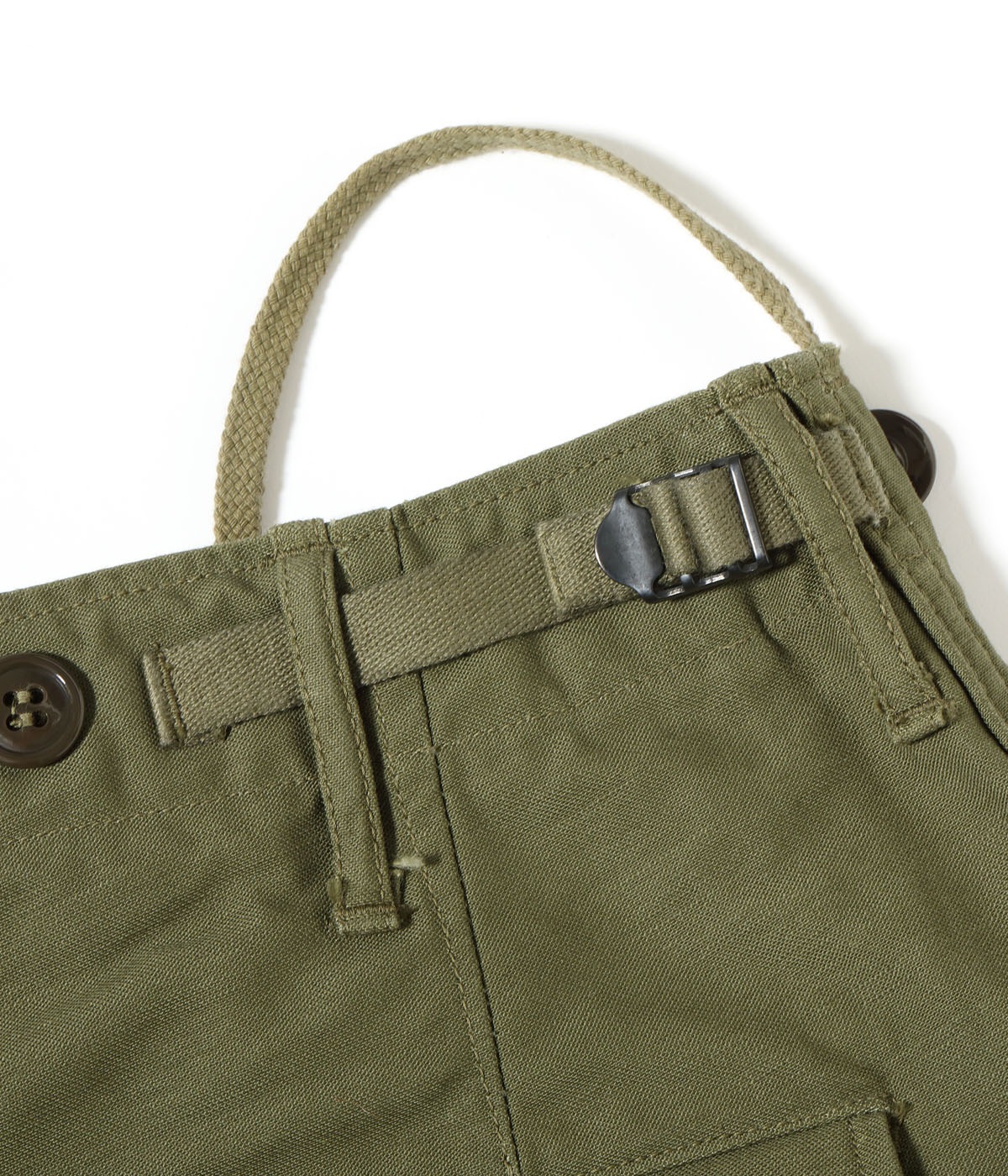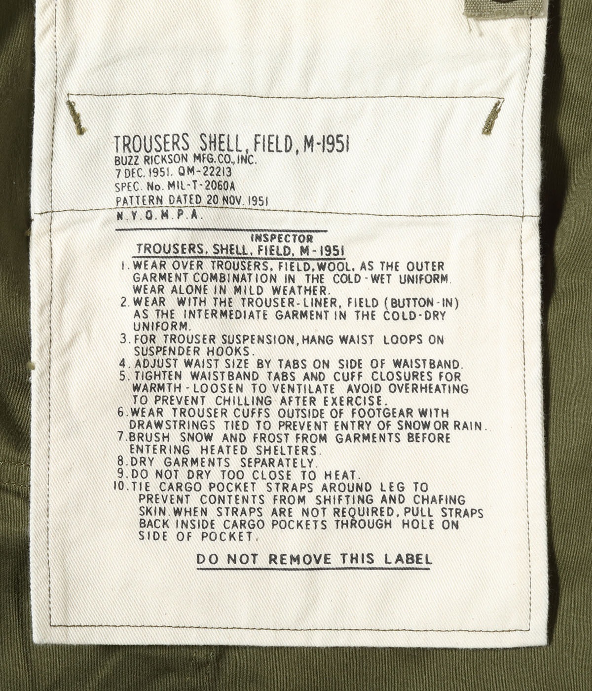 1951년 미 육군이 채용한 코튼 새틴 원단으로 안감을 댄 야전 팬츠. 이 무렵 육군은 M-51 시리즈 셋업 레이어링 시스템을 추운 기후를 위한 전투복으로 채택했습니다. 그는 속옷과 서랍(속옷) 위에 양모 필드 셔츠와 필드 팬츠를 입고, 그 위에 면 필드 재킷과 필드 팬츠를 입었다. 두 M-51 모두 추운 기후에서 착용하도록 설계되었으며 루즈한 핏은 체온을 가두고 외부 공기를 차단하는 효과를 강조합니다. 허리 안쪽의 코드 루프는 멜빵 끝에 부착된 금속 후크를 걸기 위한 디테일입니다.